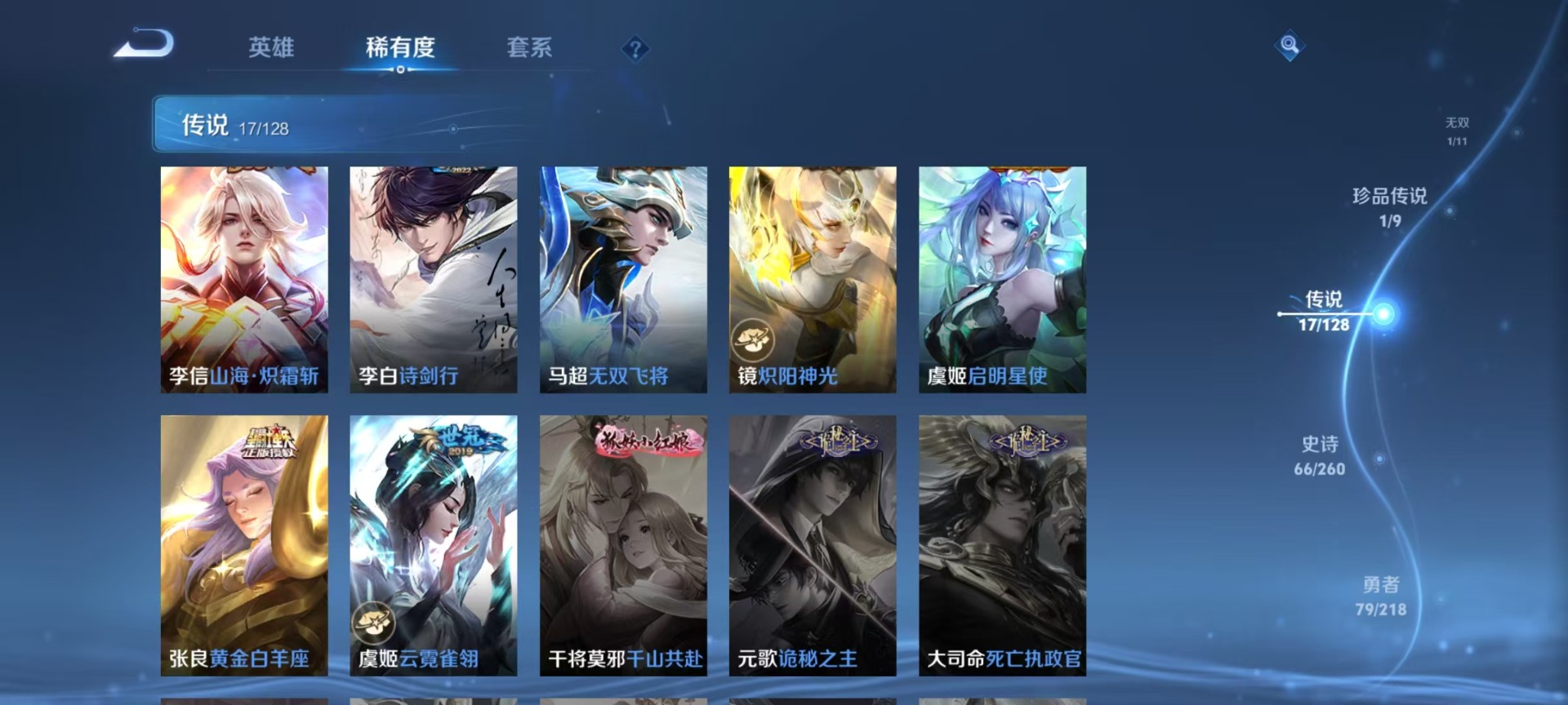 - [12082941]V8 1典藏 2珍品传说 23传说 125英雄 302皮肤 可修改实名 优质装备:弑枪猎影(韩信典藏),酷洛米之心,大耳狗之梦,黄金狮子座,云鹰飞将(小将军),炽阳神光,一念神魔,仲夏夜之梦(大飞蛾),地狱之眼,乞巧织情,时之恋人-刘备(电焊工),超时空战士-狄仁杰,无双飞将,山海·炽霜斩(李信年限),妄想实况,鹤归松栖(云缨),遇见神鼓,鲁班七号-时之奇旅,小动物乐团 传说皮:乘龙·问璇玑(孙尚香年限),落雪白狼,云诺千山,祥瑞亨通 珍宝阁皮:妄想食味,胡桃夹子 限定皮:逐霄战戟,陌上桑,鸣野蒿,至尊宝,山海·碧波行(瑶年限),武圣,梁祝,李小龙,冰霜恋舞曲,匿光启智者 史诗皮:鸭鸭历险记-刘禅,星界特工,星界战将,龙之律动,石田雨龙,百相守梦-周瑜,撼地雄心,破空之剑,埋骨钱,怒海争锋,谪仙醉月,蔬乡物语(鲁班七号),百相守梦-百里守约,炽弈燎原,百相守梦-黄忠,紫霞仙子,黄金分割率,特工魅影,千年之狐,永昼,浮梦罗烟,鹤归松栖(赵怀真),江河有灵,百解令(蒙犽),高渐离燃音魔法,银翎春语,偶像歌手,龙骑士(小龙虾),暗夜猫娘,魅语,无限星赏官,晚萤,冰冠公主,末日机甲-吕布,猫狗日记-孙策,猫狗日记-大乔,乱世虎臣,节奏热浪,修罗,女仆咖啡,摇滚巨星,水果甜心,绅士熊喵,天才门将,星夜王子,心灵骇客,功夫厨神,德古拉伯爵,暗隐猎兽者,幽灵船长,鬼剑武藏,暗渊魔法,心灵战警,乐园奇幻夜,天秀·启明,舞动绿茵,地狱岩魂,诗语江南,拒霜思,缤纷独角兽,乘风破浪,逐浪之夏,水晶猎龙者,曙光守护者,热力回旋,箭羽风息,金属风暴,原初追逐者,圣诞狂欢,圣诞恋歌,鹰眼统帅,暗夜贵公子,魅力维加斯,黎明之约,赏金猎手,未来纪元-赵云