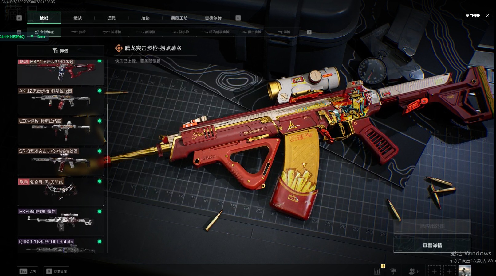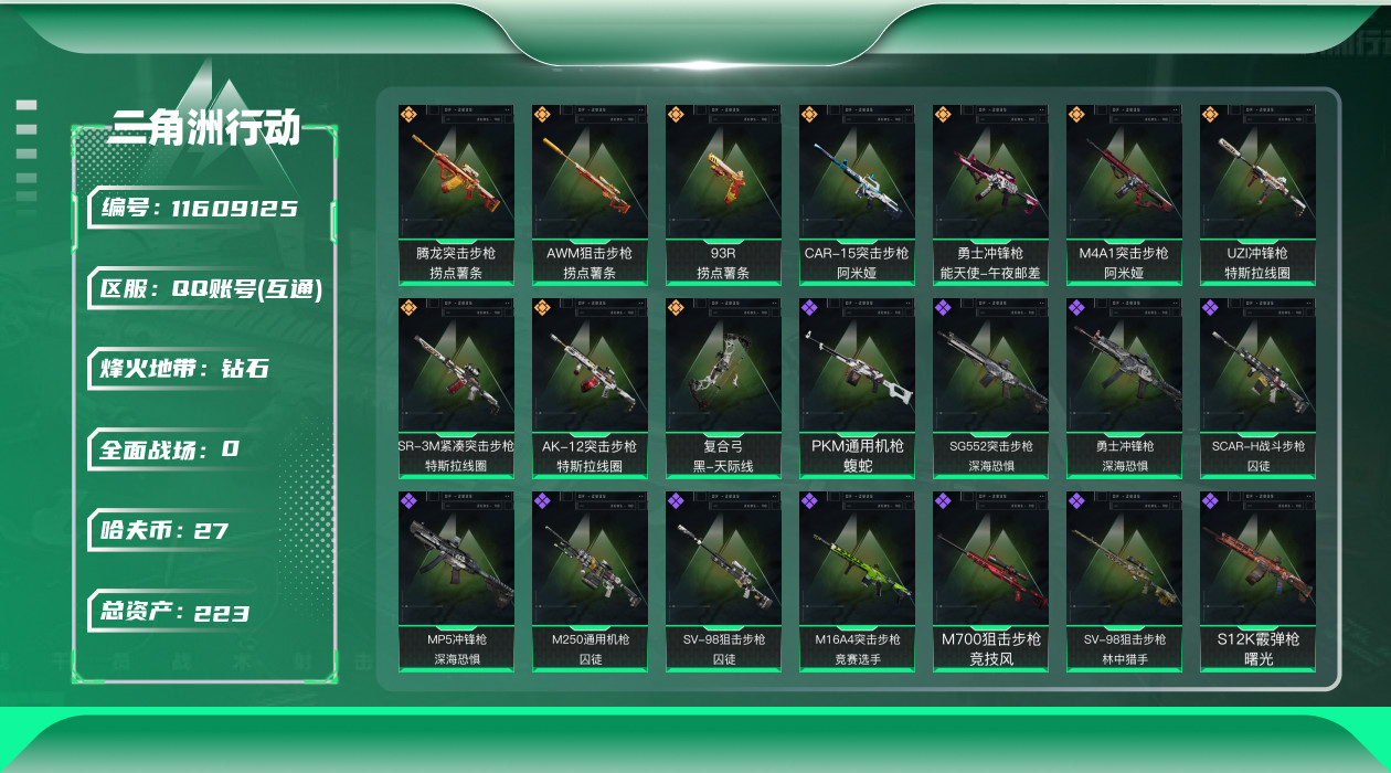 [11609125]总资产:223.2M 10传说枪械 哈夫币:27.309K 顶级安全箱(3×3)9.15号到期 可二次 可修改实名 优质装备:顶级安全箱(3x3) 烽火地带段位:钻石 全面战场段位:列兵 传说武器皮肤:93R-捞点薯条,AWM狙击步枪-捞点薯条,腾龙突击步枪-捞点薯条,AK-12突击步枪-特斯拉线圈,CAR-15突击步枪-阿米娅,SR-3M紧凑突击步枪-特斯拉线圈,UZI冲锋枪-特斯拉线圈,勇士冲锋枪-能天使-午夜邮差,复合弓-黑-天际线,M4A1突击步枪-阿米娅 史诗武器皮肤:PKM通用机枪-蝮蛇,M16A4突击步枪-竞赛选手,MP5冲锋枪-深海恐惧,勇士冲锋枪-深海恐惧,SG552突击步枪-深海恐惧,SV-98狙击步枪-林中猎手,M250通用机枪-囚徒,SV-98狙击步枪-囚徒,SCAR-H战斗步枪-囚徒,S12K霰弹枪-曙光,M700狙击步枪-竞技风