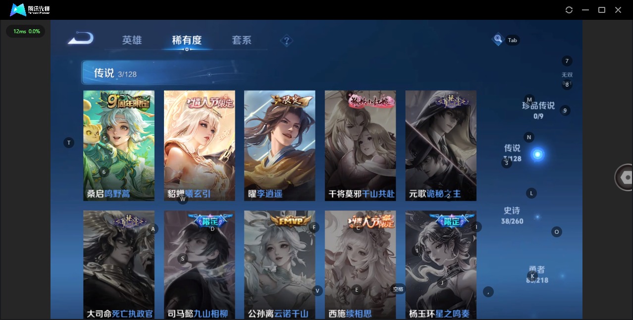- [12026953]V7 1典藏 9传说 124英雄 185皮肤 可修改实名 优质装备:鸣剑·曳影,黄金白羊座,炽阳神光,末日机甲-孙尚香(绿蚂蚱),地狱火,涂山容容 珍宝阁皮:优雅恋人 限定皮:愿照·九州拓(澜年限),愿照·山河定(司空震年限),白虎志(电光耗子),凤求凰(白切鸡),梅西,时雨天司(水龙头),神威(电光马子),遇见飞天,五谷丰年,冰锋战神,梁祝,逐梦之星,李小龙,逐梦之影,朱雀志(守约年限),霸王别姬-虞姬,引擎之心 史诗皮:器灵·浮梦炉,石田雨龙,白龙吟,千年之狐,无限星赏官,冰冠公主,偶像歌手,龙骑士(小龙虾),猫狗日记-孙策,乱世虎臣,修罗,水果甜心,星夜王子,德古拉伯爵,暗隐猎兽者,幽灵船长,鬼剑武藏,舞动绿茵,地狱岩魂,热力回旋,金属风暴,原初追逐者,圣诞恋歌,鹰眼统帅,魅力维加斯,赏金猎手
