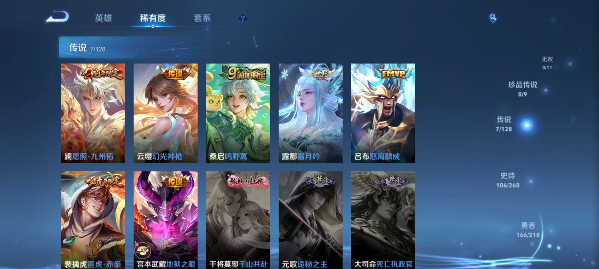 刘邦夺宝奇兵,夏侯惇朔风刀,老夫子醍醐杖,沈梦溪大漠名商,苏烈千军破阵,典韦穷奇,达摩沙漠行僧,牛魔御旌,元歌云间偶戏,兰陵王金庭之子,裴擒虎擒涛扼浪,鲁班大师探海日志,明世隐疑决卦,蒙犽狂想玩偶喵,马可波罗暗影游猎,鬼谷子原初探秘者,张良古海寻踪,女娲朔望之晖,桑启海盐诗旅,狄仁杰万华元夜,芈月重明,程咬金演武夺筹,李元芳云中旅人,弈星混沌棋,米莱狄御霄,钟馗驱傩正仪