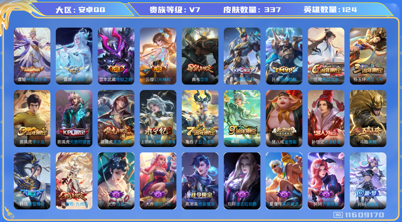 [11609170]V7 1典藏 7传说 124英雄 337皮肤 可修改实名 优质装备:神鉴启示录,地狱之眼,霜月吟,涂山容容 传说皮:幻光神枪 珍宝阁皮:万物之道,蔷薇恋人,女武神 限定皮:愿照·九州拓(澜年限),逐霄战戟,鸣野蒿,傲雪梅枪,神威(电光马子),遇见飞天,高山流水,怒海麟威,五谷丰年,天狼狩猎者,岱宗(典韦年限),李小龙,猪悟能,大圣娶亲,寅虎·赤拳(老虎年限),神器·万象笔 史诗皮:鸭鸭历险记-刘禅,飞车小橘子,器灵·浮梦炉,化蝶舞,星界战将,谪仙醉月,龙之律动,石田雨龙,百相守梦-周瑜,茶境仙,破空之剑,蔬乡物语(鲁班七号),百相守梦-百里守约,百相守梦-黄忠,遇见神鹿,电玩小子(小书包),黄金分割率,特工魅影,千年之狐,江河有灵,匿光侦查者,魅语,百解令(蒙犽),高渐离燃音魔法,蒙恬荣光圣徽,无限星赏官,冰冠公主,白蛇,晚萤,电玩·爆裂旋风,百相守梦(刘备),末日机甲-吕布,猫狗日记-孙策,猫狗日记-大乔,时之恋人-孙尚香,乱世虎臣,节奏热浪,修罗,女仆咖啡,摇滚巨星,水果甜心,绅士熊喵,天才门将,星夜王子,心灵骇客,功夫厨神,德古拉伯爵,暗隐猎兽者,幽灵船长,鬼剑武藏,心灵战警,舞动绿茵,地狱岩魂,纤云弄巧,繁星吟游(呼啦呼啦),拒霜思,缤纷独角兽,乘风破浪,逐浪之夏,水晶猎龙者,曙光守护者,箭羽风息,唤灵魅影,金属风暴,原初追逐者,圣诞狂欢,圣诞恋歌,鹰眼统帅,暗夜贵公子,魅力维加斯,黎明之约,滕王阁序,无心,未来纪元-赵云