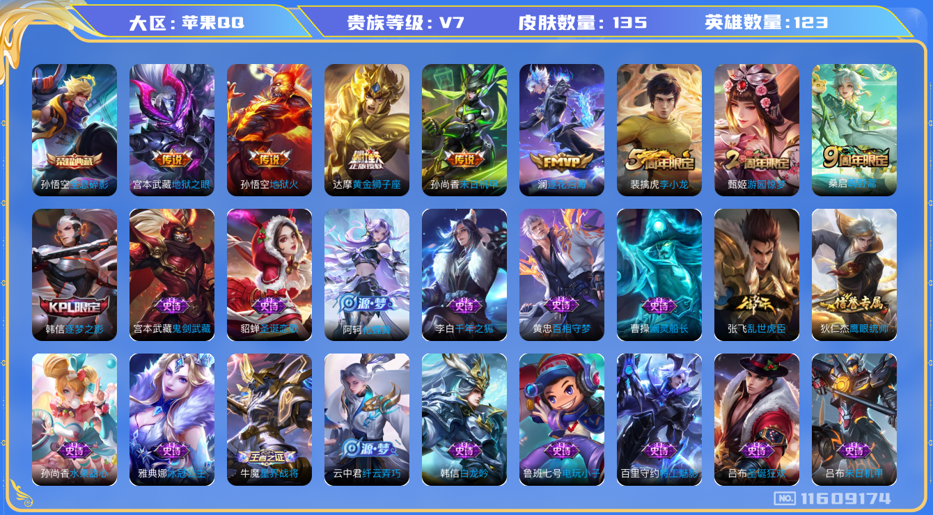 [11609174]V7 1典藏 6传说 123英雄 135皮肤 可修改实名 优质装备:全息碎影(猴子典藏),黄金狮子座,末日机甲-孙尚香(绿蚂蚱),地狱火,地狱之眼,澜逐花归海 限定皮:鸣野蒿,游园惊梦,李小龙,逐梦之影 史诗皮:化蝶舞,星界战将,龙之律动,百相守梦-黄忠,电玩小子(小书包),白龙吟,特工魅影,千年之狐,冰冠公主,偶像歌手,末日机甲-吕布,乱世虎臣,修罗,水果甜心,幽灵船长,鬼剑武藏,纤云弄巧,繁星吟游(呼啦呼啦),圣诞狂欢,圣诞恋歌,鹰眼统帅,魅力维加斯