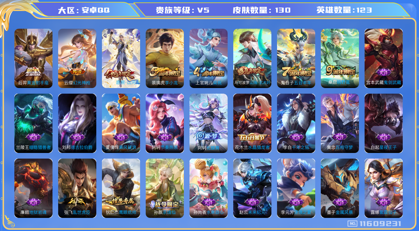 - [12088660]V7 1典藏 1无双 1珍品传说 7传说 125英雄 240皮肤 可修改实名 桑启小国标 盾山小国标 优质装备:大秦宣太后,雪境奇遇-甄姬,黄金射手座,澜逐花归海,牧神诗旅,涂山容容 珍品传说:兔狲·蓬尾 传说皮:云诺千山 珍宝阁皮:优雅恋人,蔷薇恋人 限定皮:愿照·福禄聚(蔡文姬年限),陌上桑,鸣野蒿,高山流水,诗剑行,李小龙,唐三藏 史诗皮:鸭鸭历险记-刘禅,化蝶舞,灵蛊蚀心,星界战将,龙之律动,雪豹·霜爪,布丁狗之誓,小牛鸭,百相守梦-周瑜,茶境仙,幻珠鲛人,撼地雄心,破空之剑,蒙犽顽岩魄,奇遇星旅,百相守梦-百里守约,星界特工,百相守梦-黄忠,紫霞仙子,苍穹之光,黄金分割率,特工魅影,江河有灵,雪夜绮愿(周瑜),浮梦罗烟,高渐离燃音魔法,蒙恬荣光圣徽,无限星赏官,冰冠公主,偶像歌手,末日机甲-吕布,猫狗日记-孙策,乱世虎臣,节奏热浪,摇滚巨星,水果甜心,绅士熊喵,天才门将,星夜王子,德古拉伯爵,鬼剑武藏,乐园奇幻夜,水晶猎龙者,曙光守护者,箭羽风息,金属风暴,原初追逐者,圣诞狂欢,圣诞恋歌,鹰眼统帅,魅力维加斯,黎明之约,赏金猎手,未来纪元-赵云