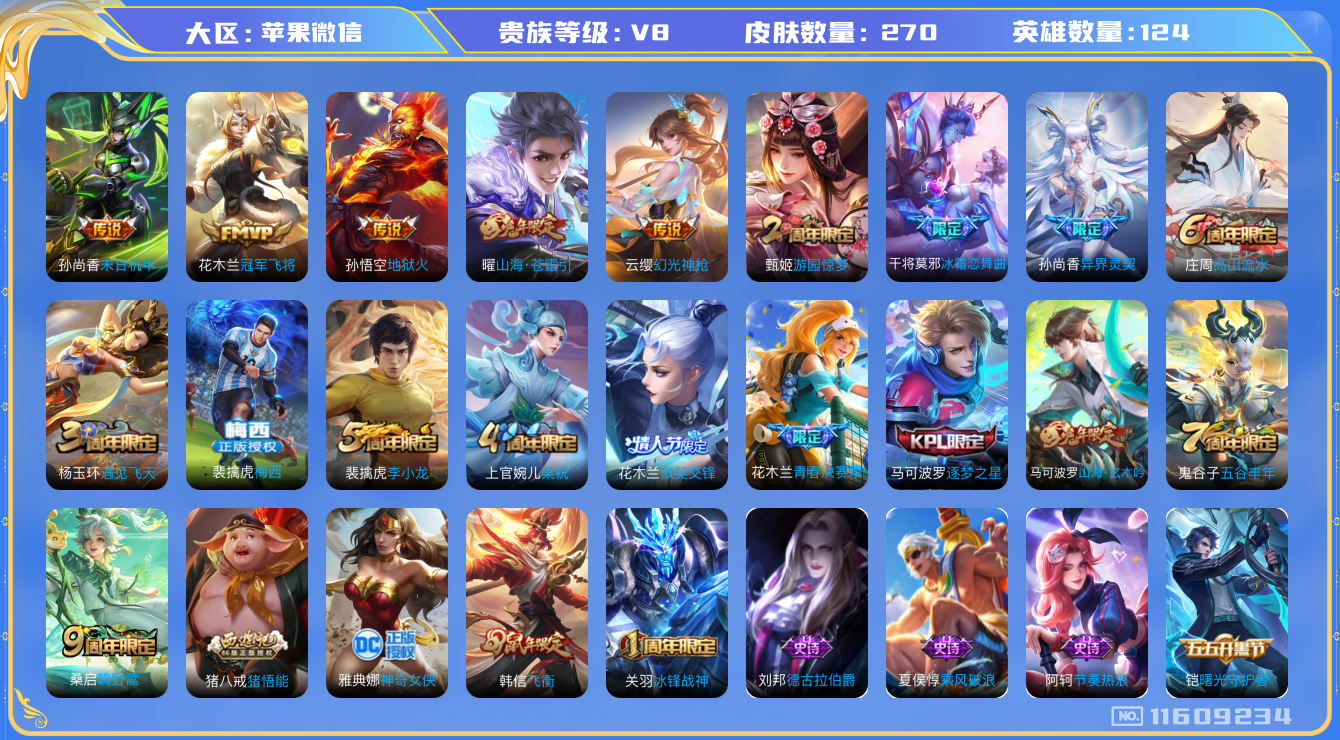 [11609234]V8 7传说 124英雄 270皮肤 可修改实名 钱包无法修改 支付冻结 优质装备:冠军飞将,末日机甲-孙尚香(绿蚂蚱),地狱火,山海·苍雷引(电光曜子) 传说皮:幻光神枪 珍宝阁皮:万物之道,蔷薇恋人,女武神 限定皮:鸣野蒿,梅西,异界灵契(白毛香),飞衡(韩信年限),遇见飞天,高山流水,五谷丰年,冰锋战神,游园惊梦,梁祝,逐梦之星,李小龙,默契交锋-花木兰,猪悟能,青春决赛季,冰霜恋舞曲,神奇女侠,山海·玄木吟(马可年限) 史诗皮:星界战将,紫霞仙子,苍穹之光,特工魅影,千年之狐,江河有灵,百解令(蒙犽),蒙恬荣光圣徽,无限星赏官,冰冠公主,偶像歌手,电玩·爆裂旋风,末日机甲-吕布,猫狗日记-孙策,时之恋人-孙尚香,乱世虎臣,节奏热浪,修罗,女仆咖啡,水果甜心,天才门将,星夜王子,功夫厨神,德古拉伯爵,暗隐猎兽者,幽灵船长,鬼剑武藏,舞动绿茵,纤云弄巧,乘风破浪,逐浪之夏,水晶猎龙者,曙光守护者,热力回旋,箭羽风息,金属风暴,原初追逐者,圣诞狂欢,鹰眼统帅,王者之锤,暗夜贵公子,魅力维加斯,黎明之约,赏金猎手,无心