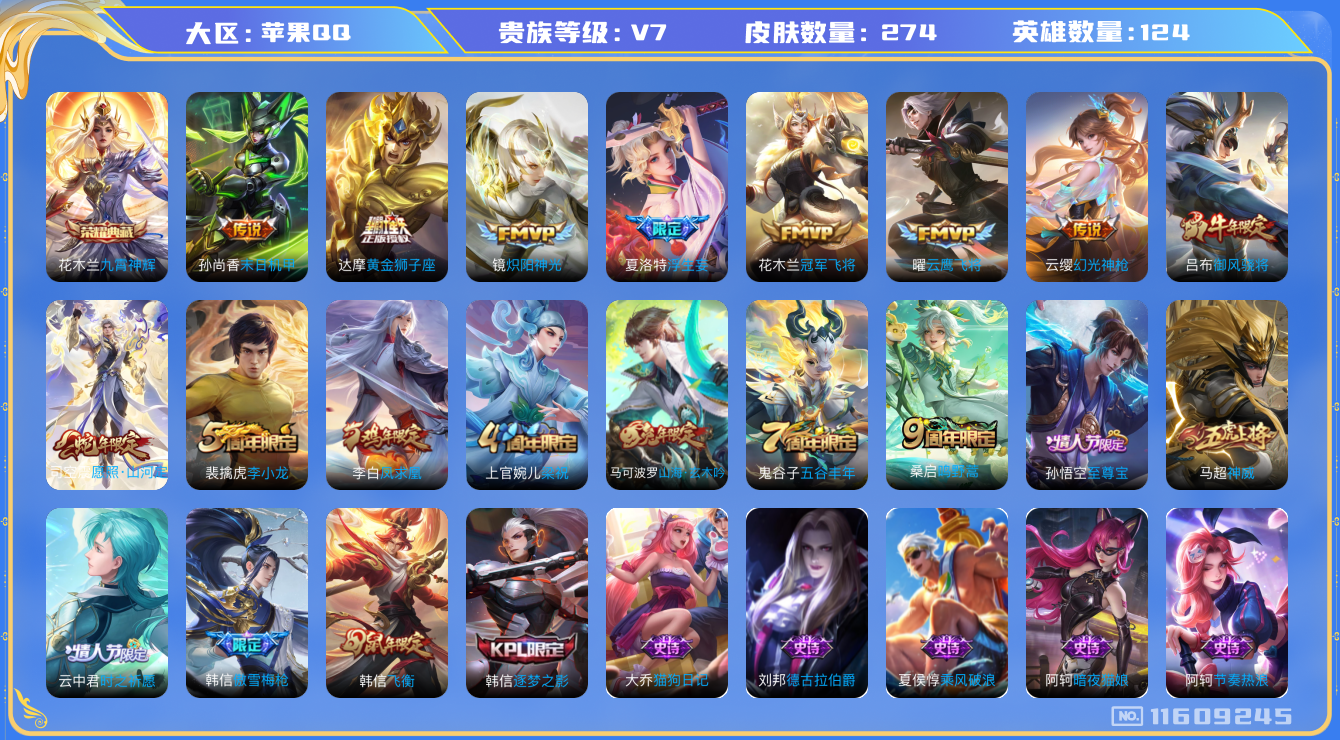 [11609245]V7 1典藏 10传说 124英雄 274皮肤 可修改实名 优质装备:九霄神辉(木兰典藏),黄金狮子座,冠军飞将,云鹰飞将(小将军),炽阳神光,末日机甲-孙尚香(绿蚂蚱),浮生妄 传说皮:幻光神枪 珍宝阁皮:妄想食味,蔷薇恋人,女武神 限定皮:愿照·山河定(司空震年限),鸣野蒿,至尊宝,凤求凰(白切鸡),傲雪梅枪,神威(电光马子),飞衡(韩信年限),五谷丰年,梁祝,御风骁将(吕布年限),李小龙,逐梦之影,时之祈愿-云中君,山海·玄木吟(马可年限) 史诗皮:器灵·浮梦炉,化蝶舞,星界战将,龙之律动,百相守梦-黄忠,紫霞仙子,苍穹之光,电玩小子(小书包),白龙吟,黄金分割率,特工魅影,千年之狐,电玩·爆裂旋风,蒙恬荣光圣徽,龙骑士(小龙虾),暗夜猫娘,冰冠公主,猫狗日记-孙策,猫狗日记-大乔,乱世虎臣,节奏热浪,女仆咖啡,水果甜心,绅士熊喵,天才门将,星夜王子,心灵骇客,功夫厨神,德古拉伯爵,暗隐猎兽者,幽灵船长,鬼剑武藏,心灵战警,地狱岩魂,纤云弄巧,繁星吟游(呼啦呼啦),缤纷独角兽,乘风破浪,逐浪之夏,水晶猎龙者,热力回旋,箭羽风息,金属风暴,原初追逐者,圣诞恋歌,鹰眼统帅,黎明之约,赏金猎手,无心,未来纪元-赵云
