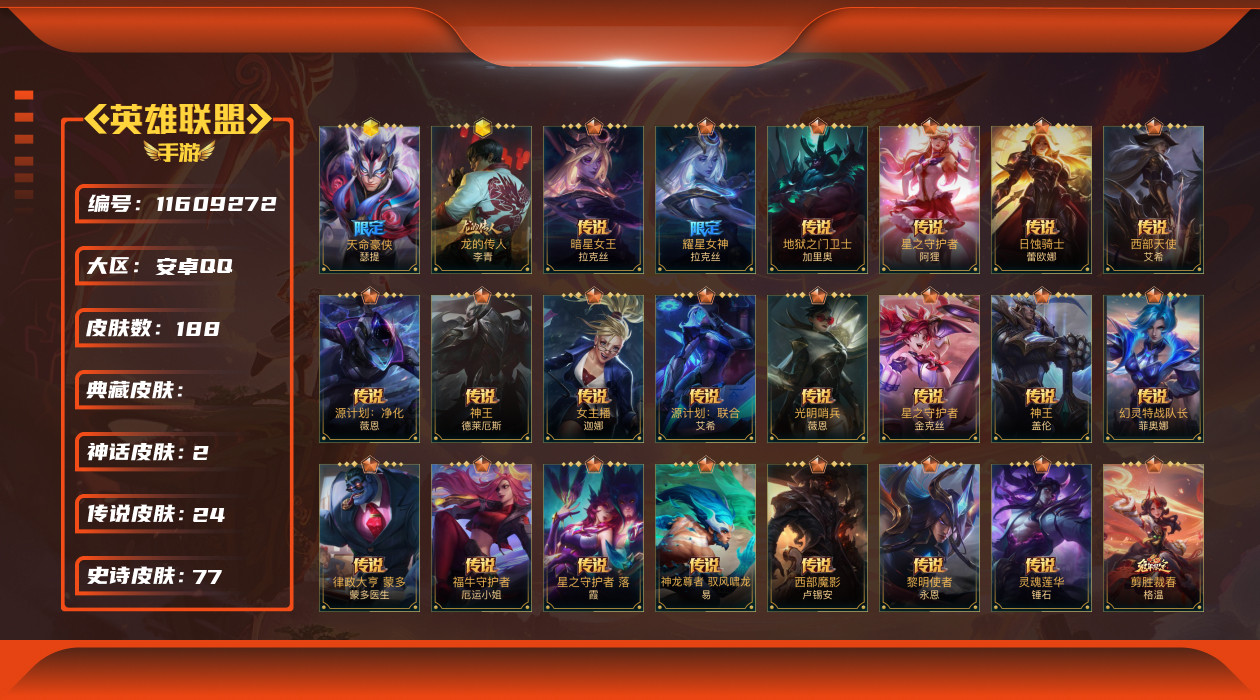 [11609272]2神话 24传说 77史诗 188皮肤 128英雄 翡翠 可二次 可修改实名 优质装备:福牛守护者女枪,光明哨兵薇恩,黎明使者锐雯,律政大亨,女主播风女,日蚀骑士蕾欧娜,神龙尊者 驭风啸龙,神王盖伦,神王诺手,天煞劫,西部魔影卢锡安,西部天使寒冰,星之守护者金克丝,星之守护者阿狸,星之守护者 落,源计划:净化,源计划:联合,玉剑传说 武剑仙,灵魂莲华锤石,剪胜裁春格温,暗星女王拉克丝,耀星女神拉克丝,龙的传人,龙的传人 段位:翡翠 神话皮:天命豪侠 瑟提 限定皮肤:耀星女神拉克丝,星之守护者霞,星之守护者洛 传说皮:幻灵特战队长 菲奥娜,地狱之门卫士,黎明使者永恩