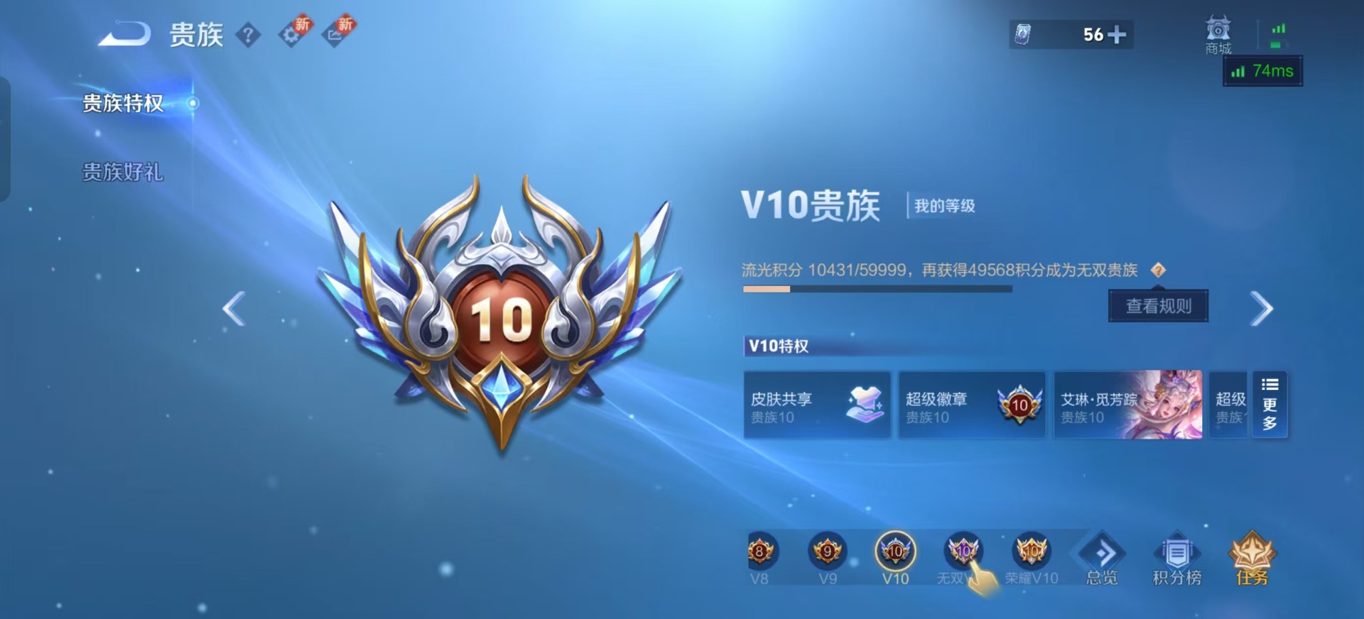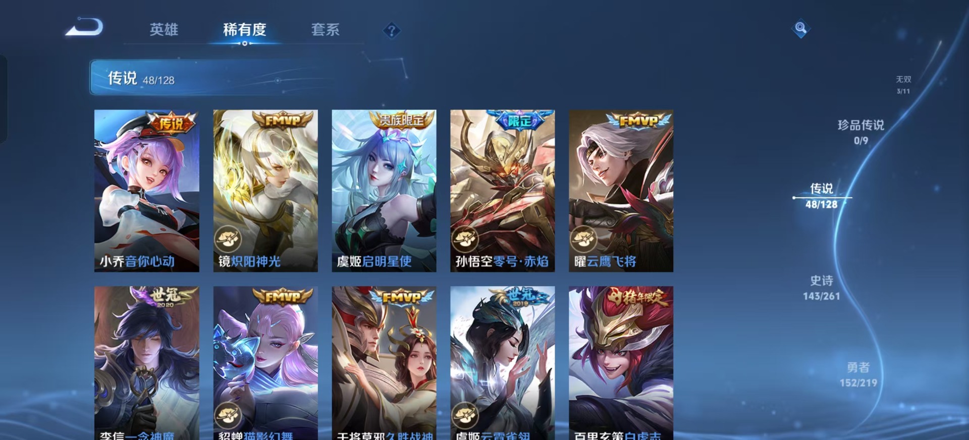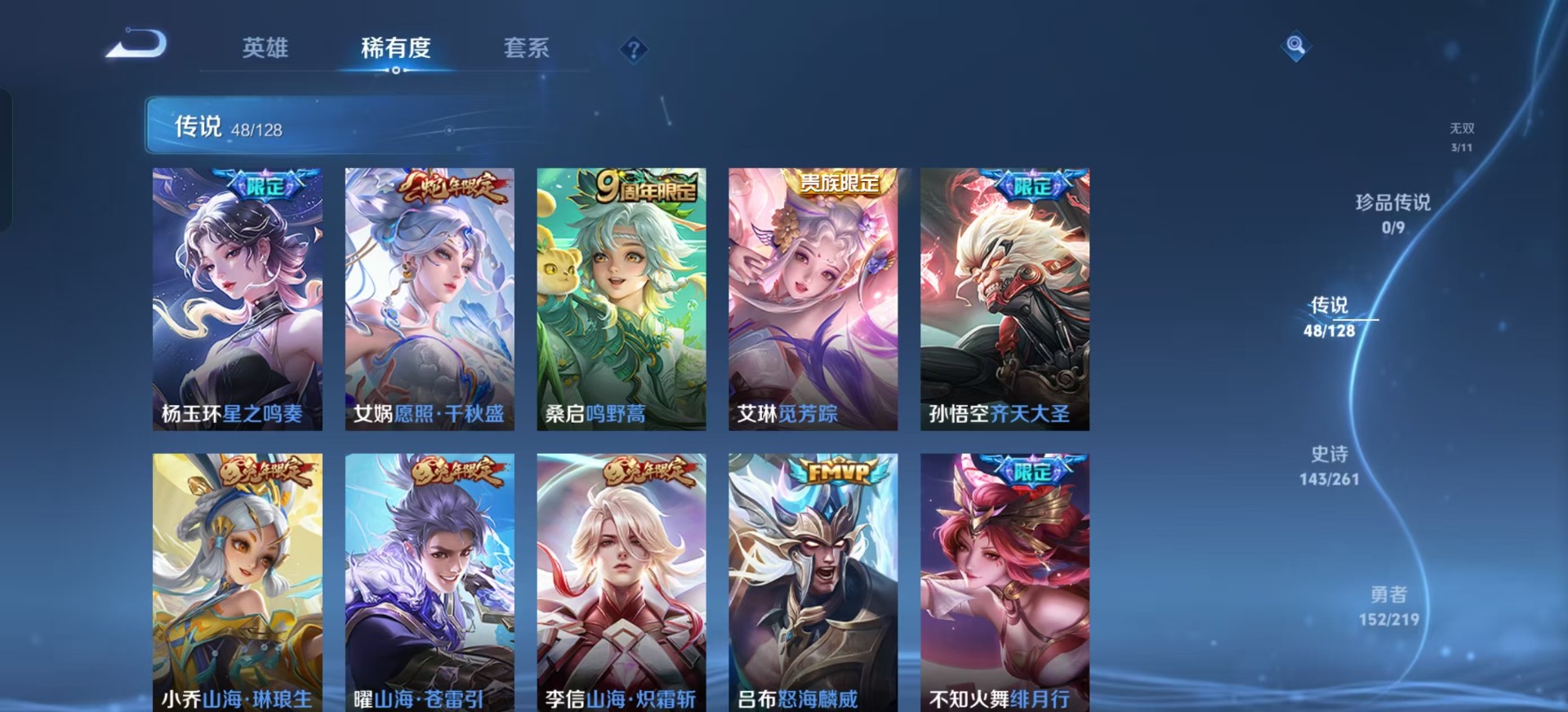 - PX_2064545-贵族等级: V8 英雄数: 123 皮肤数: 293 荣耀水晶: 武则天,无限飓风号 星传说: 幻海之心,未来机甲,金色仲夏夜 传说皮: 黄金狮子座,黄金射手座,云鹰飞将,久胜战神,炽阳神光,一念神魔,末日机甲-孙尚香,仲夏夜之梦,零号·赤焰,海洋之心,淬星耀世,超时空战士-狄仁杰,澜逐花归海,幻光神枪 限定皮: 冰锋战神,遇见飞天,李小龙,游园惊梦,梁祝,时雨天司,武圣,天