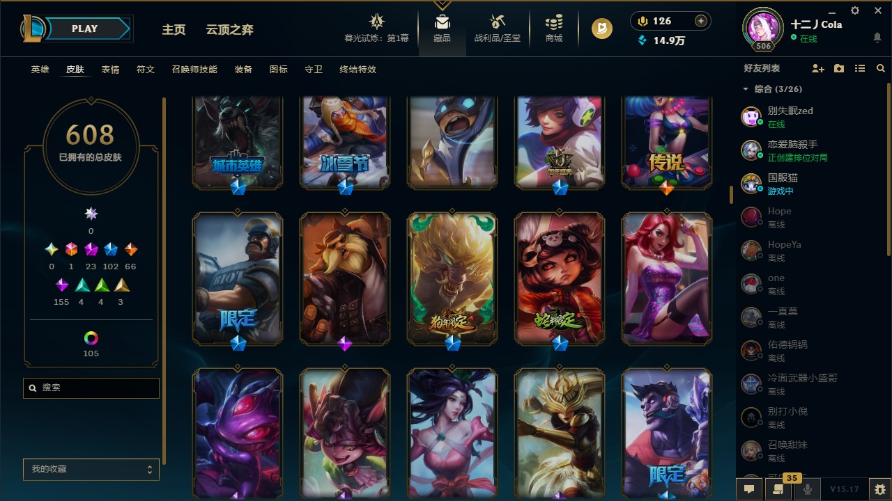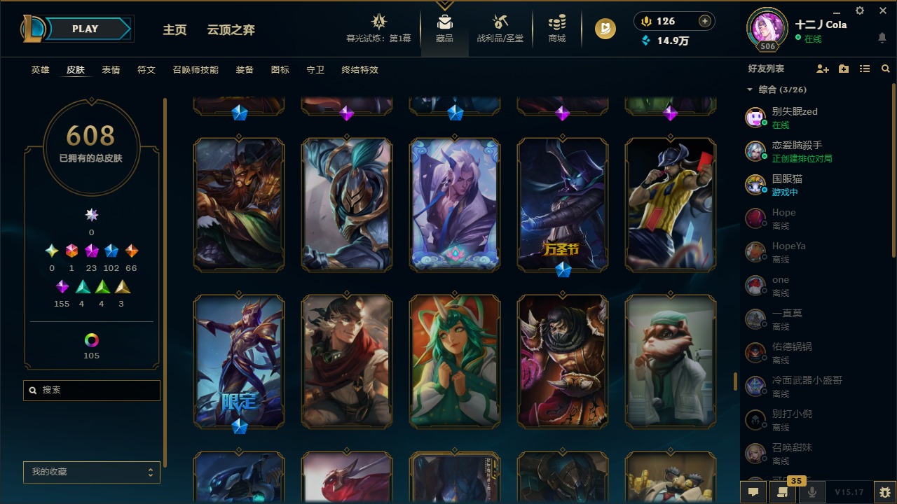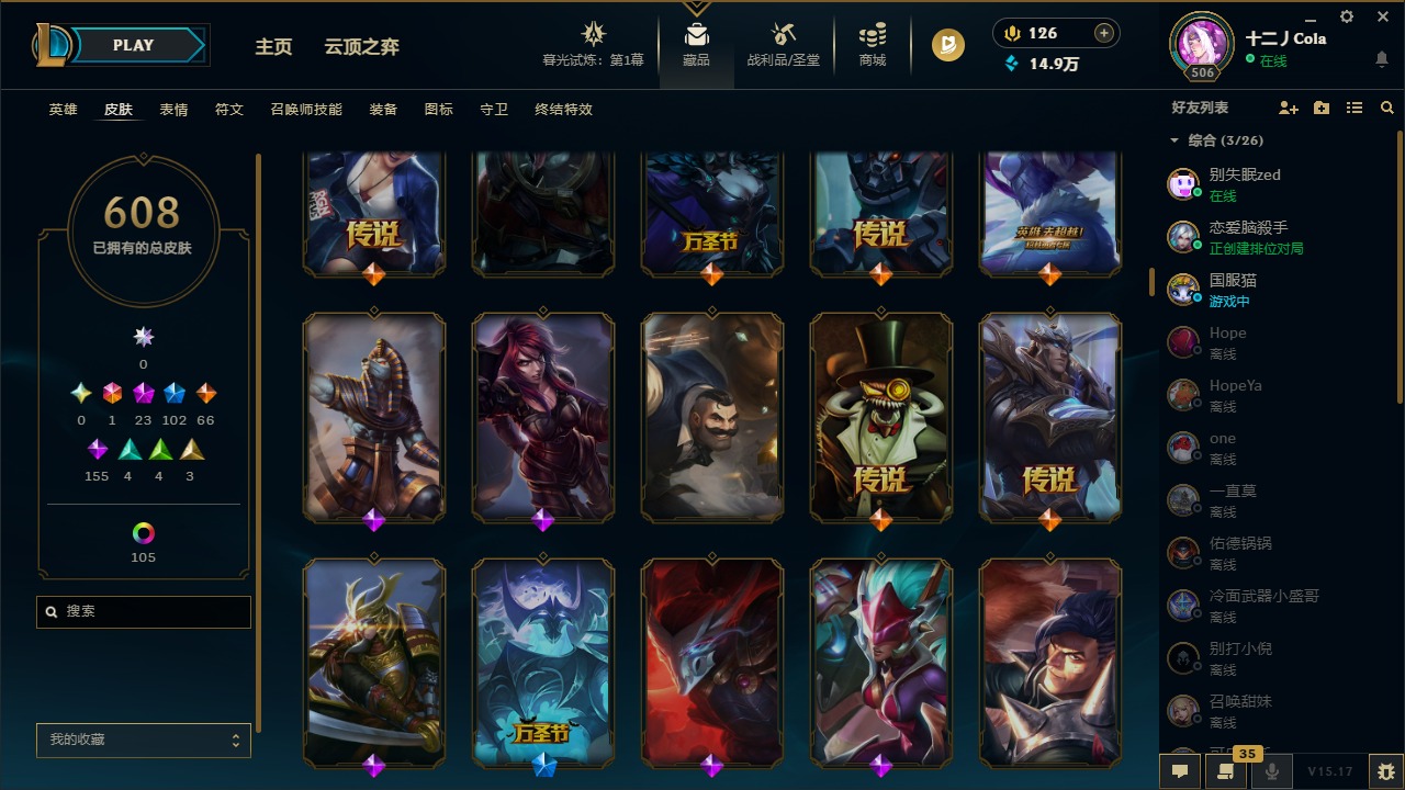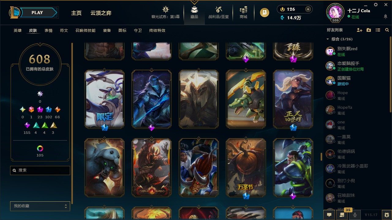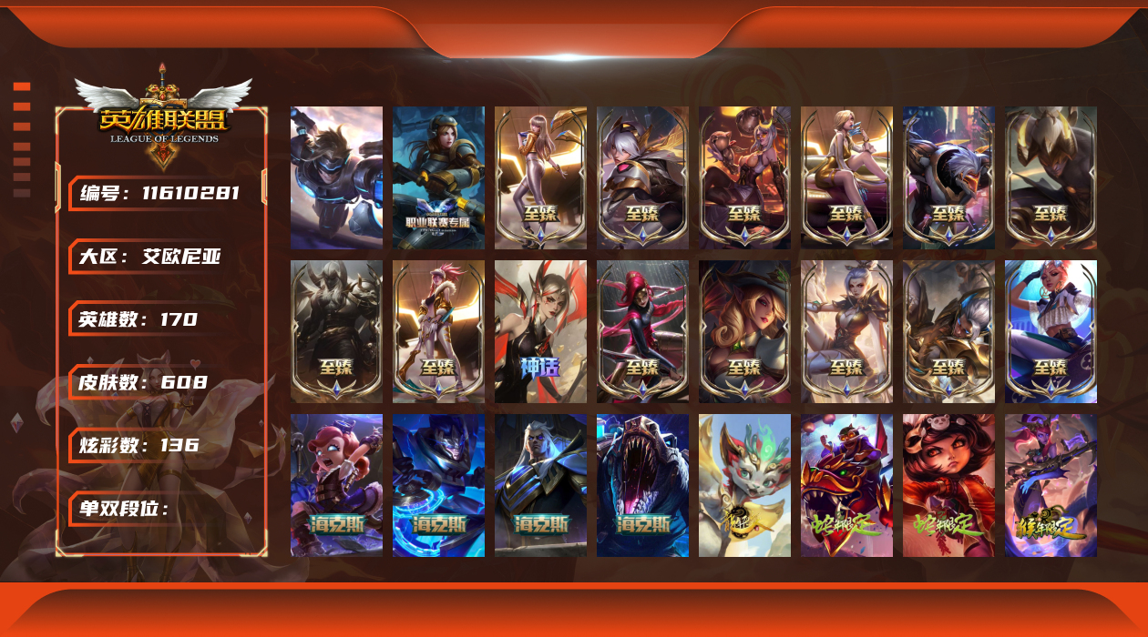 [11610281]1终极 23神话 103限定 67传说 155史诗 608皮肤 136炫彩 170英雄 可二次 可修改实名 优质装备:至臻 源计划:正义 艾瑞莉娅,至臻 腥红之月 亚托克斯,至臻 烈焰美人 薇恩,至臻 黑夜使者 李青,至臻 玉剑传说 武剑仙,至臻 K/DA 卡莎,至臻 真实伤害 奇亚娜,至臻 K/DA 阿卡丽,至臻 K/DA 伊芙琳,至臻 源计划:阴 劫,至臻 神龙尊者 炎龙瑟提,至臻 魅惑女巫 莫甘娜,源代码 乐芙兰,防爆天使 凯尔,暗影 沃里克,巧克力工坊 波比,地底世界 崔斯特,电玩战魂 人马,都铎王朝 图奇,防爆士兵 格雷福斯,冠军典狱长 锤石,冠军之血 希瓦娜,鸡里奥,惊悚派对 阿木木,克格汪 克格莫,密林猎手 提莫,送披萨的小姐姐 希维尔,野兽猎人 德莱文,野兽猎人 泰达米尔,永恒之森 乐芙兰,勇者 奈德丽,御魔星矢 寒冰,未来战士,冰霜之刃 艾瑞莉娅 炫金,霸天巨兽·雪崩 墨菲特,冰雪节 格雷福斯 炫金,净雪之月 莫甘娜 冬虹,墨之影武者 亚索 金墨耀影,殿堂传奇 乐芙兰 登神,殿堂传奇 乐芙兰,十五周年纪念 希维尔,暗星 科加斯,心之钢 伊泽瑞尔 天纵才华,魔女 阿卡丽 虚荣,至臻 黑色玫瑰假面舞会 卡特琳娜 至臻:殿堂传奇 乐芙兰 海克斯:海克斯 嘉文四世,海克斯 安妮,海克斯 雷克顿,海克斯 斯维因 限定:钢铁军团 拉克丝 赛季限定皮:胜利之运 崔斯特,胜利剑圣 易,胜利女神 娑娜,胜利女神 蜘蛛,胜利女神 希维尔,胜利之树 茂凯,胜利枪神 格雷福斯,胜利女神 奥利安娜,胜利之剑 剑魔,胜利枪神 卢锡安,胜利机器人 布里茨 冠军限定系列:S1FNC 酒桶,S1FNC 迦娜,S2 暗杀星 蒙多,S2 暗杀星 努努,S2 暗杀星 慎,S3 SKT T1 劫,S3 SKT T1 薇恩,S3 SKT T1 婕拉,S4 SSW 锤石,S4 SSW 雷恩加尔,S4 SSW 图奇,S4 SSW 炼金,S5 SKT T1 阿利斯塔,S5 SKT T1 瑞兹,S5 SKT T1 阿兹尔,S5 SKT T1 蜘蛛,S6 SKT T1 奥拉夫,S6 SKT T1 烬,S6 SKT T1 球女,S6 SKT T1 扎克,S8 IG 艾瑞莉娅 冰雪节限定:冰雪节 格雷福斯,冰雪节 炼金,冰雪女神 辛德拉,冰雪兽 纳尔,胡桃夹子 小丑,平安夜女神 娑娜,魄罗骑士 瑟庄妮,圣