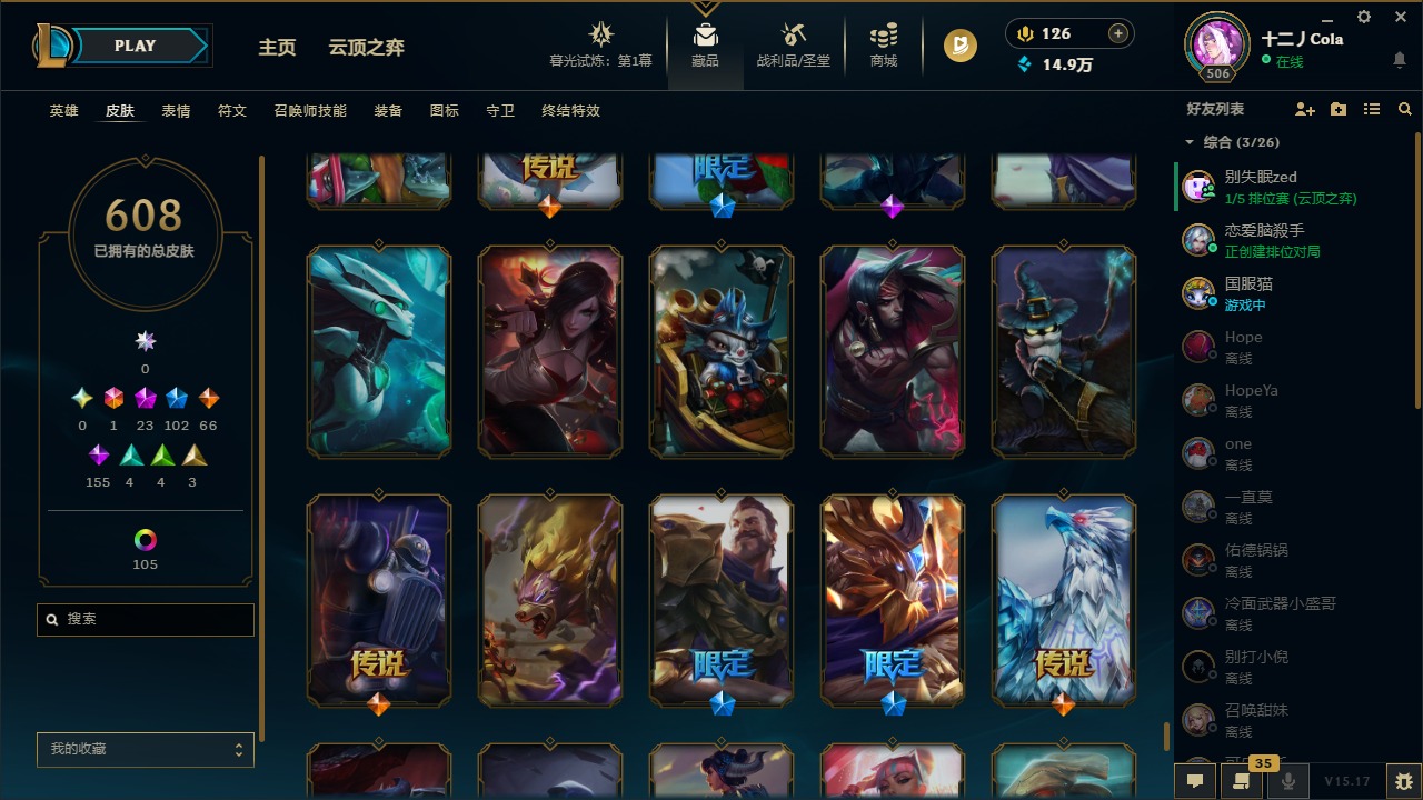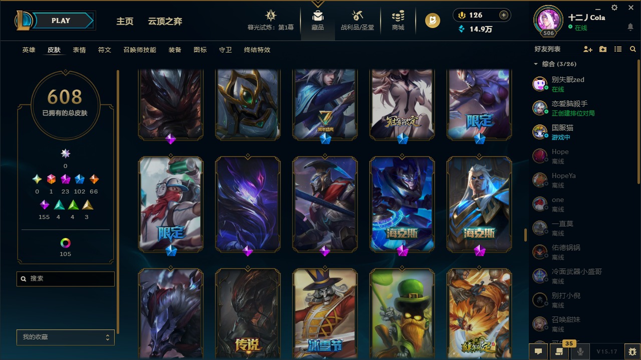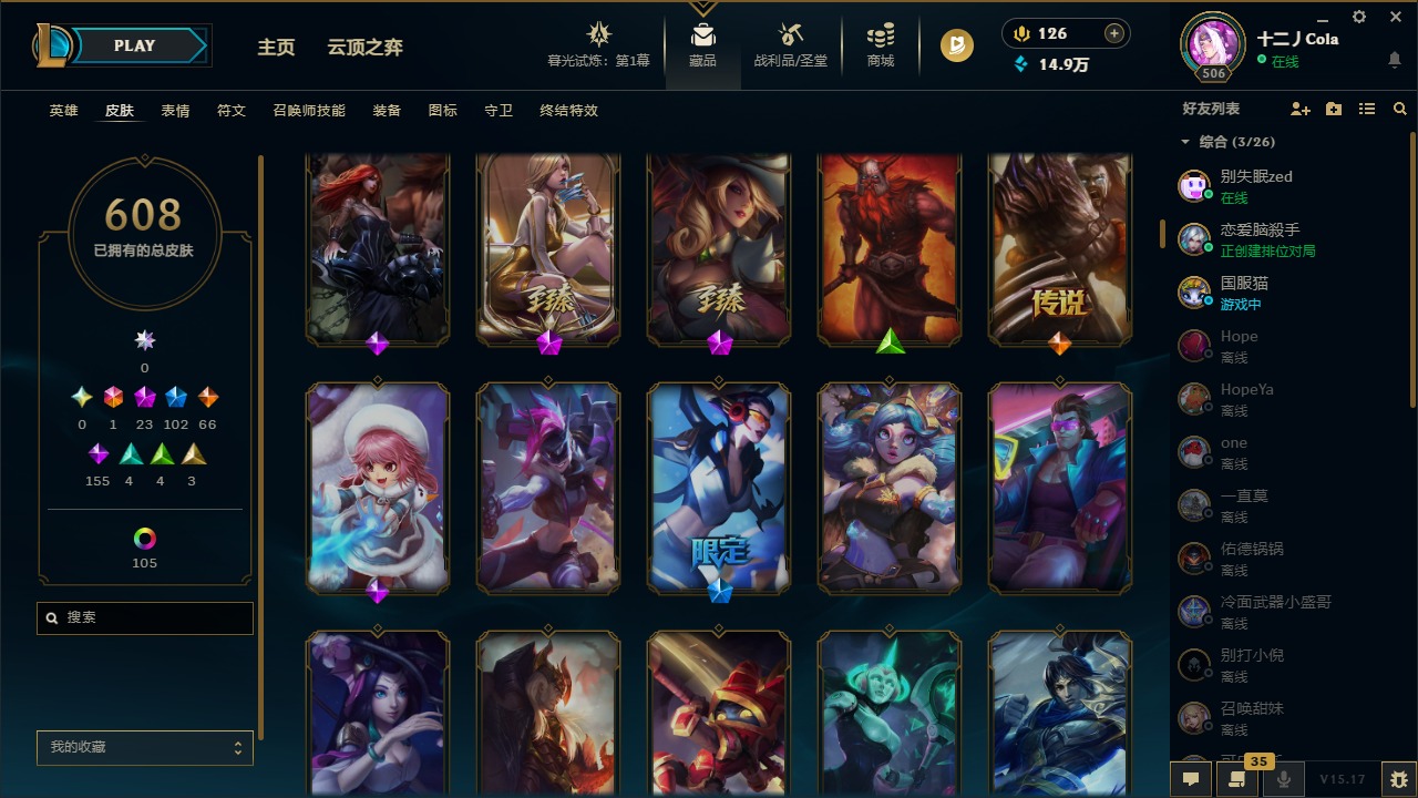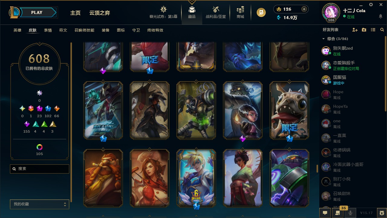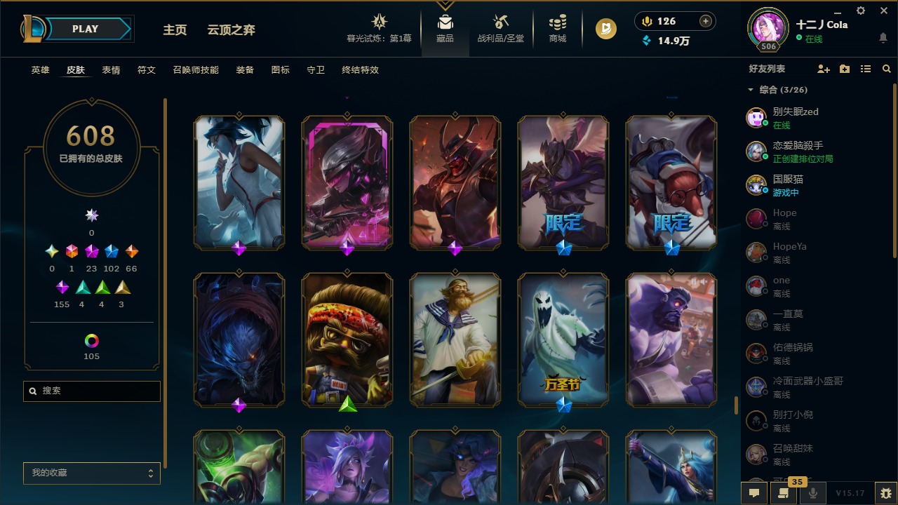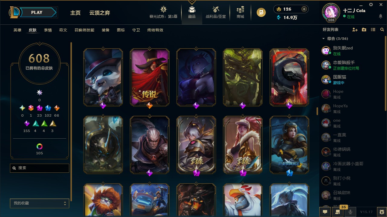 [11610281]1终极 23神话 103限定 67传说 155史诗 608皮肤 136炫彩 170英雄 可二次 可修改实名 优质装备:至臻 源计划:正义 艾瑞莉娅,至臻 腥红之月 亚托克斯,至臻 烈焰美人 薇恩,至臻 黑夜使者 李青,至臻 玉剑传说 武剑仙,至臻 K/DA 卡莎,至臻 真实伤害 奇亚娜,至臻 K/DA 阿卡丽,至臻 K/DA 伊芙琳,至臻 源计划:阴 劫,至臻 神龙尊者 炎龙瑟提,至臻 魅惑女巫 莫甘娜,源代码 乐芙兰,防爆天使 凯尔,暗影 沃里克,巧克力工坊 波比,地底世界 崔斯特,电玩战魂 人马,都铎王朝 图奇,防爆士兵 格雷福斯,冠军典狱长 锤石,冠军之血 希瓦娜,鸡里奥,惊悚派对 阿木木,克格汪 克格莫,密林猎手 提莫,送披萨的小姐姐 希维尔,野兽猎人 德莱文,野兽猎人 泰达米尔,永恒之森 乐芙兰,勇者 奈德丽,御魔星矢 寒冰,未来战士,冰霜之刃 艾瑞莉娅 炫金,霸天巨兽·雪崩 墨菲特,冰雪节 格雷福斯 炫金,净雪之月 莫甘娜 冬虹,墨之影武者 亚索 金墨耀影,殿堂传奇 乐芙兰 登神,殿堂传奇 乐芙兰,十五周年纪念 希维尔,暗星 科加斯,心之钢 伊泽瑞尔 天纵才华,魔女 阿卡丽 虚荣,至臻 黑色玫瑰假面舞会 卡特琳娜 至臻:殿堂传奇 乐芙兰 海克斯:海克斯 嘉文四世,海克斯 安妮,海克斯 雷克顿,海克斯 斯维因 限定:钢铁军团 拉克丝 赛季限定皮:胜利之运 崔斯特,胜利剑圣 易,胜利女神 娑娜,胜利女神 蜘蛛,胜利女神 希维尔,胜利之树 茂凯,胜利枪神 格雷福斯,胜利女神 奥利安娜,胜利之剑 剑魔,胜利枪神 卢锡安,胜利机器人 布里茨 冠军限定系列:S1FNC 酒桶,S1FNC 迦娜,S2 暗杀星 蒙多,S2 暗杀星 努努,S2 暗杀星 慎,S3 SKT T1 劫,S3 SKT T1 薇恩,S3 SKT T1 婕拉,S4 SSW 锤石,S4 SSW 雷恩加尔,S4 SSW 图奇,S4 SSW 炼金,S5 SKT T1 阿利斯塔,S5 SKT T1 瑞兹,S5 SKT T1 阿兹尔,S5 SKT T1 蜘蛛,S6 SKT T1 奥拉夫,S6 SKT T1 烬,S6 SKT T1 球女,S6 SKT T1 扎克,S8 IG 艾瑞莉娅 冰雪节限定:冰雪节 格雷福斯,冰雪节 炼金,冰雪女神 辛德拉,冰雪兽 纳尔,胡桃夹子 小丑,平安夜女神 娑娜,魄罗骑士 瑟庄妮,圣