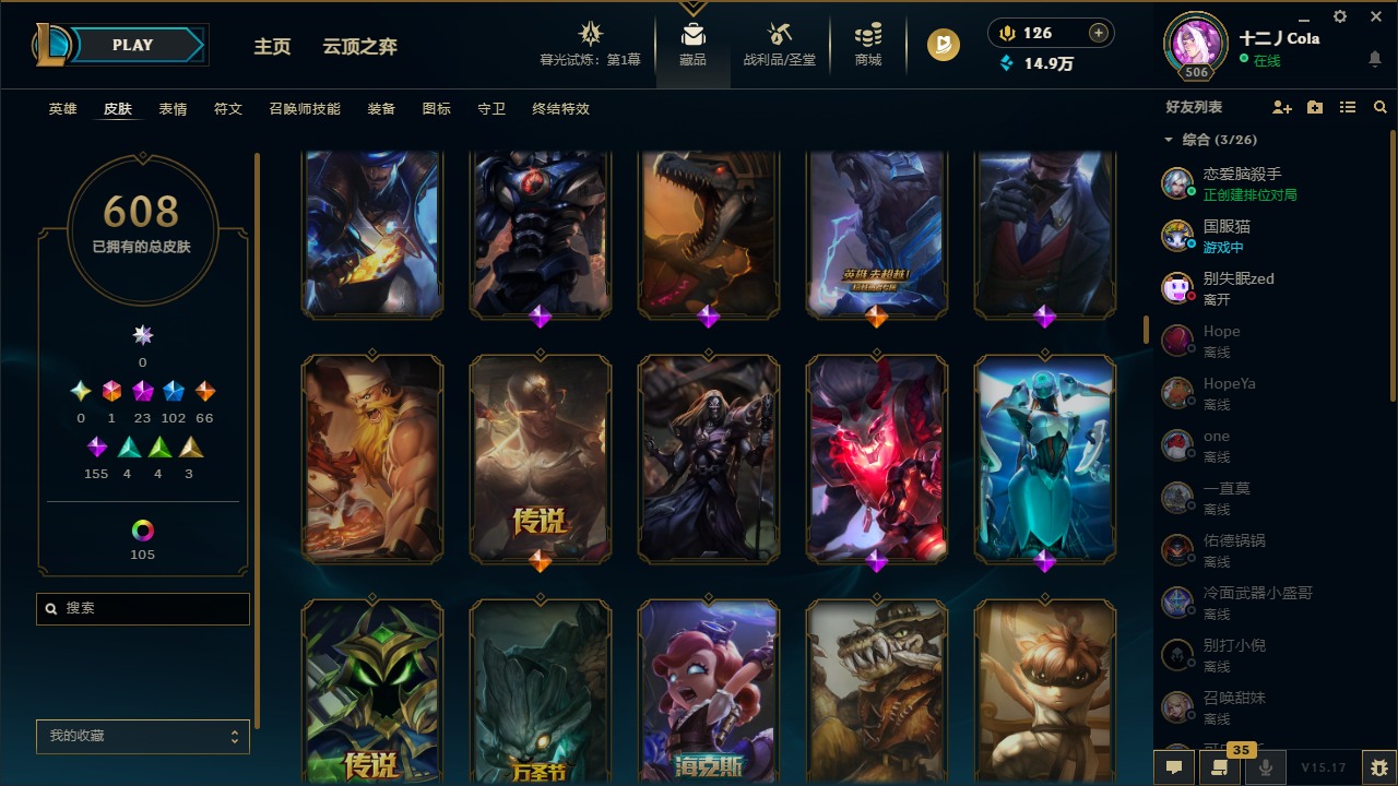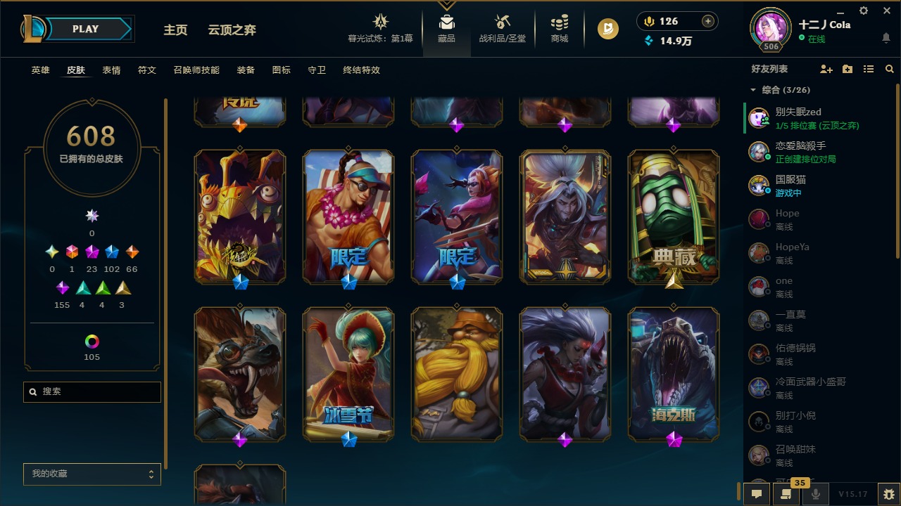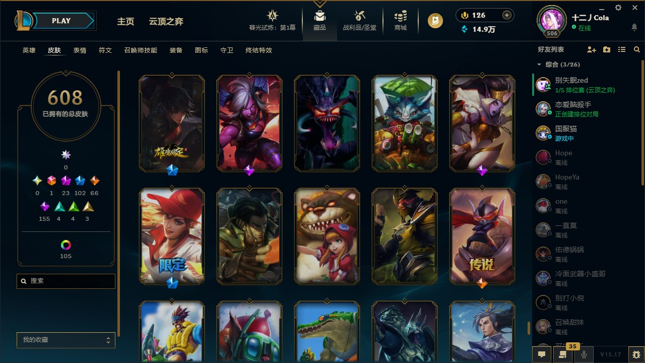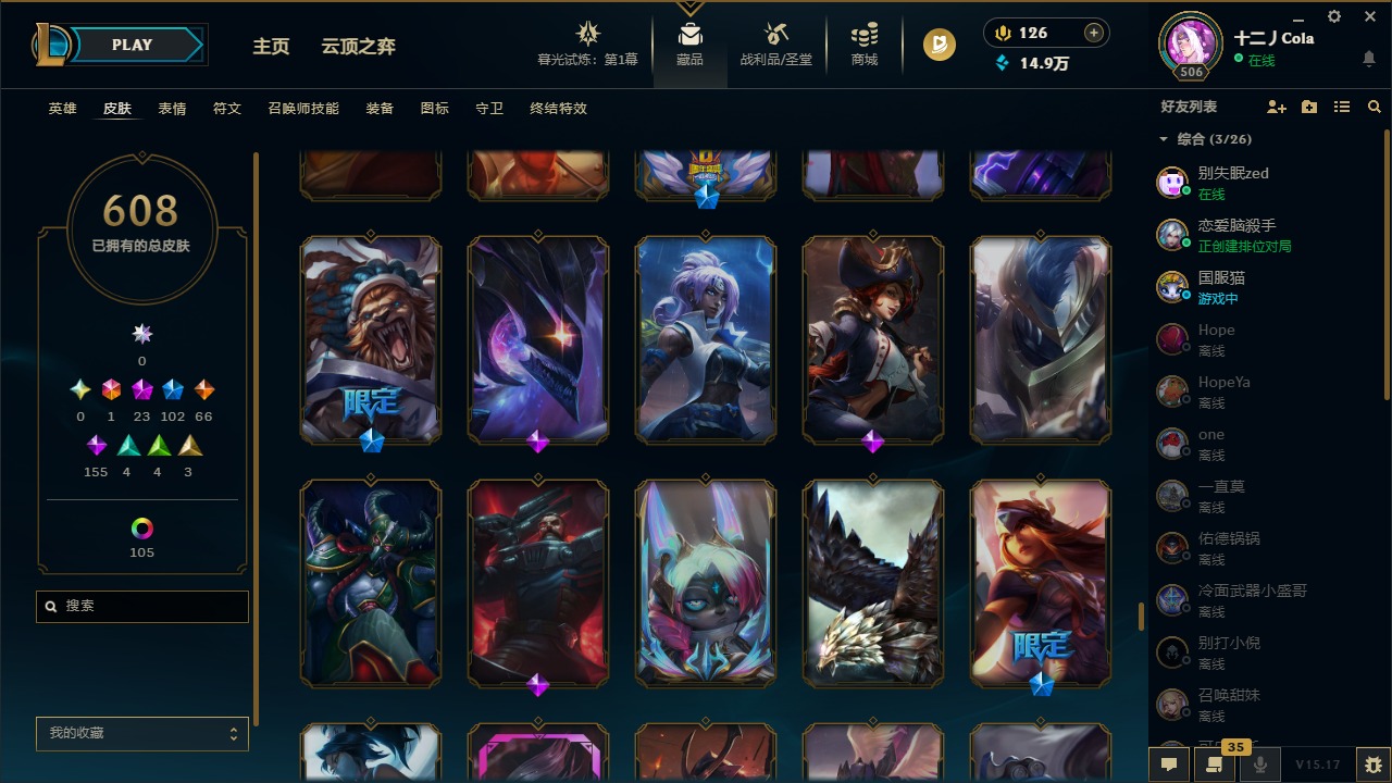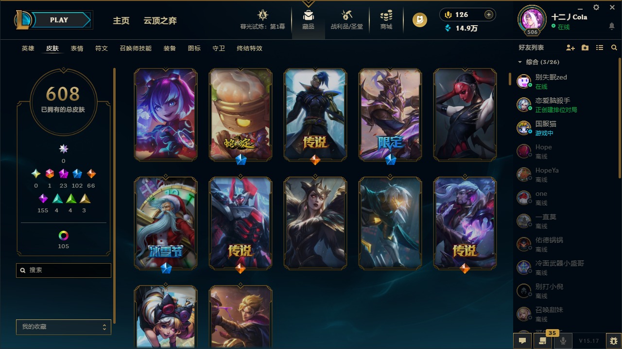 [11610281]1终极 23神话 103限定 67传说 155史诗 608皮肤 136炫彩 170英雄 可二次 可修改实名 优质装备:至臻 源计划:正义 艾瑞莉娅,至臻 腥红之月 亚托克斯,至臻 烈焰美人 薇恩,至臻 黑夜使者 李青,至臻 玉剑传说 武剑仙,至臻 K/DA 卡莎,至臻 真实伤害 奇亚娜,至臻 K/DA 阿卡丽,至臻 K/DA 伊芙琳,至臻 源计划:阴 劫,至臻 神龙尊者 炎龙瑟提,至臻 魅惑女巫 莫甘娜,源代码 乐芙兰,防爆天使 凯尔,暗影 沃里克,巧克力工坊 波比,地底世界 崔斯特,电玩战魂 人马,都铎王朝 图奇,防爆士兵 格雷福斯,冠军典狱长 锤石,冠军之血 希瓦娜,鸡里奥,惊悚派对 阿木木,克格汪 克格莫,密林猎手 提莫,送披萨的小姐姐 希维尔,野兽猎人 德莱文,野兽猎人 泰达米尔,永恒之森 乐芙兰,勇者 奈德丽,御魔星矢 寒冰,未来战士,冰霜之刃 艾瑞莉娅 炫金,霸天巨兽·雪崩 墨菲特,冰雪节 格雷福斯 炫金,净雪之月 莫甘娜 冬虹,墨之影武者 亚索 金墨耀影,殿堂传奇 乐芙兰 登神,殿堂传奇 乐芙兰,十五周年纪念 希维尔,暗星 科加斯,心之钢 伊泽瑞尔 天纵才华,魔女 阿卡丽 虚荣,至臻 黑色玫瑰假面舞会 卡特琳娜 至臻:殿堂传奇 乐芙兰 海克斯:海克斯 嘉文四世,海克斯 安妮,海克斯 雷克顿,海克斯 斯维因 限定:钢铁军团 拉克丝 赛季限定皮:胜利之运 崔斯特,胜利剑圣 易,胜利女神 娑娜,胜利女神 蜘蛛,胜利女神 希维尔,胜利之树 茂凯,胜利枪神 格雷福斯,胜利女神 奥利安娜,胜利之剑 剑魔,胜利枪神 卢锡安,胜利机器人 布里茨 冠军限定系列:S1FNC 酒桶,S1FNC 迦娜,S2 暗杀星 蒙多,S2 暗杀星 努努,S2 暗杀星 慎,S3 SKT T1 劫,S3 SKT T1 薇恩,S3 SKT T1 婕拉,S4 SSW 锤石,S4 SSW 雷恩加尔,S4 SSW 图奇,S4 SSW 炼金,S5 SKT T1 阿利斯塔,S5 SKT T1 瑞兹,S5 SKT T1 阿兹尔,S5 SKT T1 蜘蛛,S6 SKT T1 奥拉夫,S6 SKT T1 烬,S6 SKT T1 球女,S6 SKT T1 扎克,S8 IG 艾瑞莉娅 冰雪节限定:冰雪节 格雷福斯,冰雪节 炼金,冰雪女神 辛德拉,冰雪兽 纳尔,胡桃夹子 小丑,平安夜女神 娑娜,魄罗骑士 瑟庄妮,圣