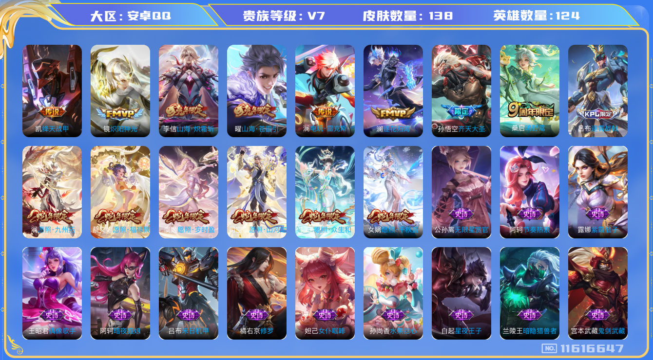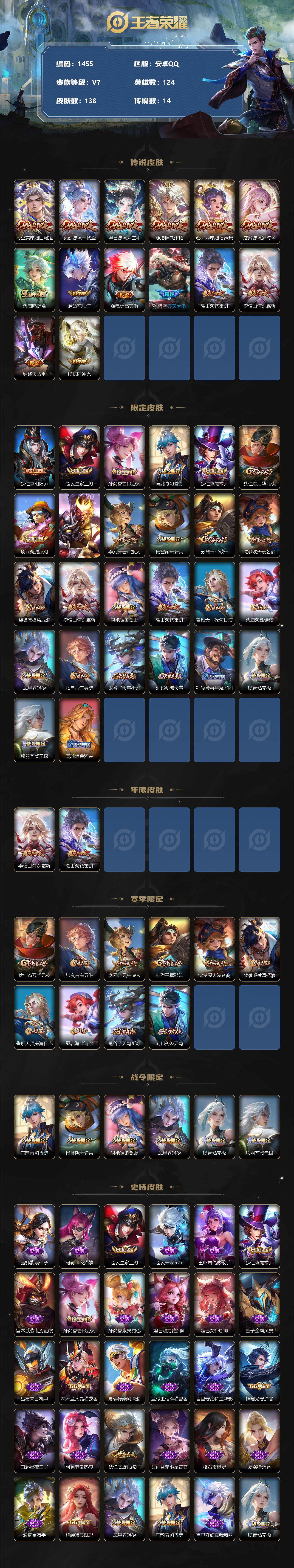 [11616647]【商品标题】:安卓Q-V7-尊贵铂金IV段位-124英雄-138皮肤-0典藏-0珍品无双-0无双-0珍品传说-14传说-33史诗