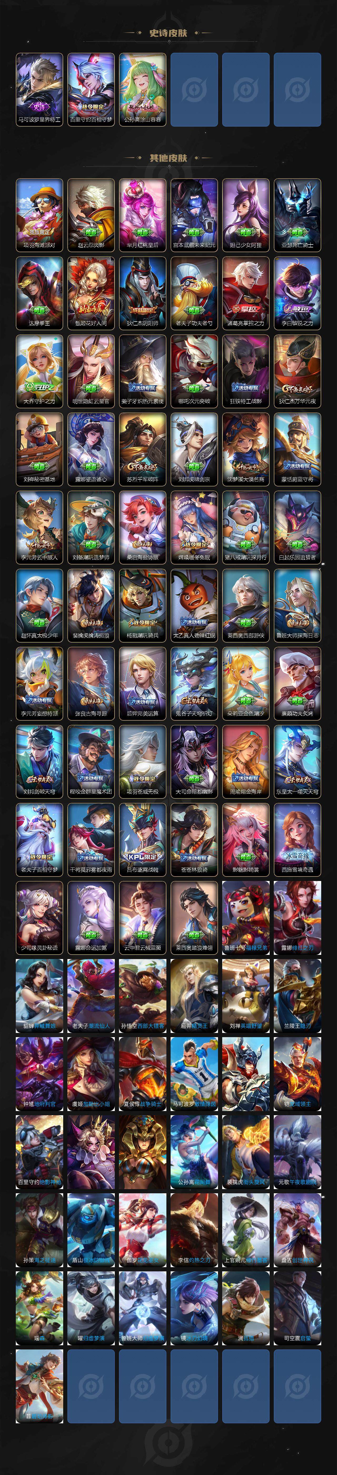 【史诗皮肤】:露娜紫霞仙子,阿轲暗夜猫娘,赵云皇家上将,赵云未来纪元,王昭君偶像歌手,狄仁杰魔术师,宫本武藏鬼剑武藏,孙尚香蔷薇恋人,孙尚香水果甜心,妲己魅力维加斯,妲己女仆咖啡,墨子金属风暴,吕布末日机甲,花木兰水晶猎龙者,夏侯惇乘风破浪,兰陵王暗隐猎兽者,百里守约特工魅影,铠曙光守护者,白起星夜王子,阿轲节奏热浪,狄仁杰鹰眼统帅,公孙离无限星赏官,橘右京修罗,夏洛特永昼,澜赏金猎手,貂蝉唤灵魅影,暃星界游侠,扁鹊奇幻香踪,百里守约真我赫兹,镜青焰无极,马可波罗星界特工,百里守约百相守梦,公孙离涂山容容