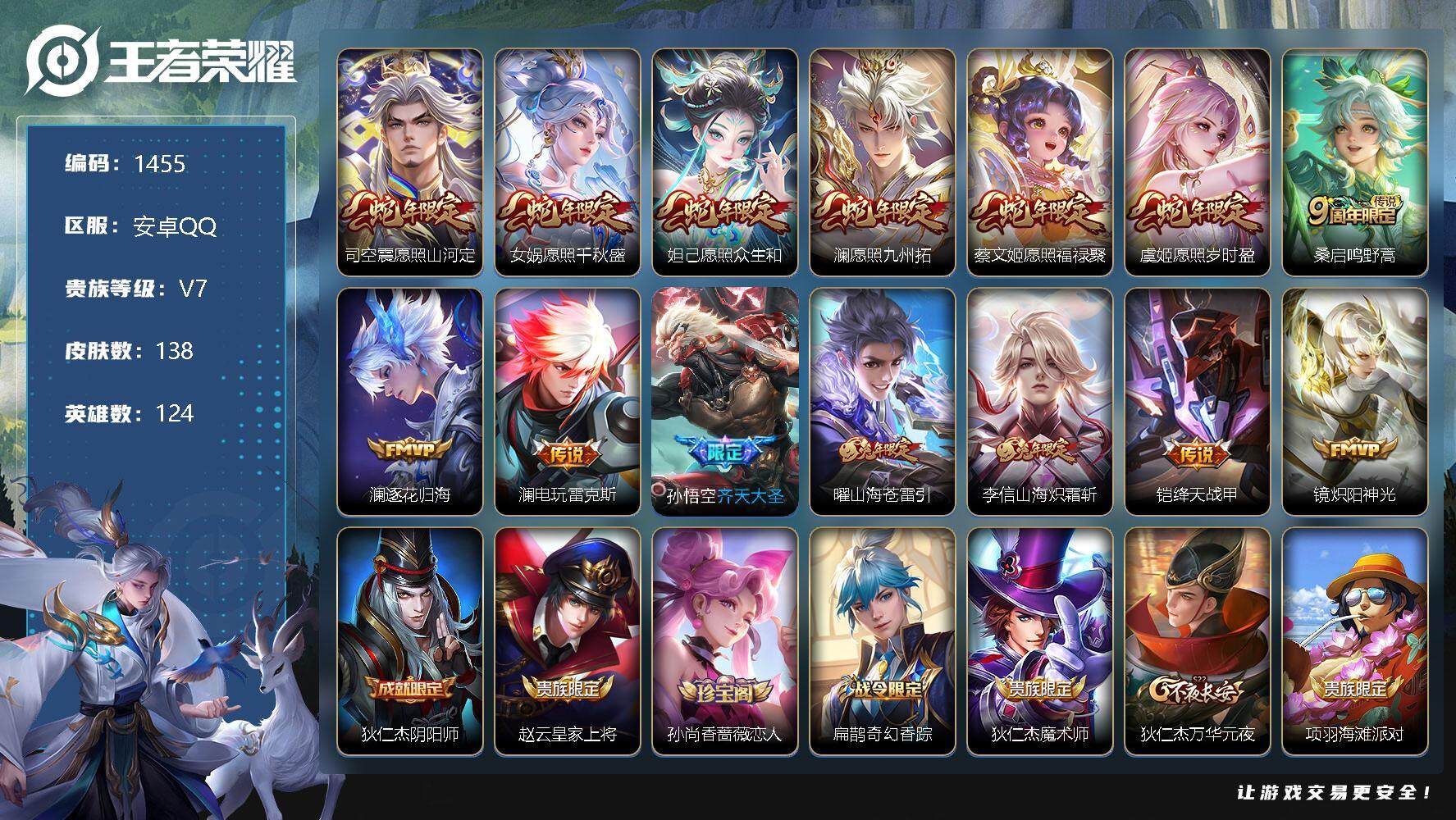 [11616647]【商品标题】:安卓Q-V7-尊贵铂金IV段位-124英雄-138皮肤-0典藏-0珍品无双-0无双-0珍品传说-14传说-33史诗 【传说皮肤】:司空震愿照山河定,女娲愿照千秋盛,妲己愿照众生和,澜愿照九州拓,蔡文姬愿照福禄聚,虞姬愿照岁时盈,桑启鸣野蒿,澜逐花归海,澜电玩雷克斯,孙悟空齐天大圣,曜山海苍雷引,李信山海炽霜斩,铠绛天战甲,镜炽阳神光 【限定皮肤】:狄仁杰阴阳师,赵云皇家上将,孙尚香蔷薇恋人,扁鹊奇幻香踪,狄仁杰魔术师,狄仁杰万华元夜,项羽海滩派对,孙悟空齐天大圣,李元芳云中旅人,杨戬潮玩骑兵,苏烈千军破阵,沈梦溪大漠名商,裴擒虎擒涛扼浪,李信山海炽霜斩,嫦娥暖冬兔眠,曜山海苍雷引,鲁班大师探海日志,桑启海盐诗旅,暃星界游侠,张良古海寻踪,鬼谷子天穹祈灯,刘邦剑破天穹,程咬金群星魔术团,镜青焰无极,项羽苍威无极,周瑜熔金海岸 【年限皮肤】:李信山海炽霜斩,曜山海苍雷引 【赛季限定】:狄仁杰万华元夜,张良古海寻踪,李元芳云中旅人,苏烈千军破阵,沈梦溪大漠名商,裴擒虎擒涛扼浪,鲁班大师探海日志,桑启海盐诗旅,鬼谷子天穹祈灯,刘邦剑破天穹 【战令限定】:扁鹊奇幻香踪,杨戬潮玩骑兵,嫦娥暖冬兔眠,暃星界游侠,镜青焰无极,项羽苍威无极 【史诗皮肤】:露娜紫霞仙子,阿轲暗夜猫娘,赵云皇家上将,赵云未来纪元,王昭君偶像歌手,狄仁杰魔术师,宫本武藏鬼剑武藏,孙尚香蔷薇恋人,孙尚香水果甜心,妲己魅力维加斯,妲己女仆咖啡,墨子金属风暴,吕布末日机甲,花木兰水晶猎龙者,夏侯惇乘风破浪,兰陵王暗隐猎兽者,百里守约特工魅影,铠曙光守护者,白起星夜王子,阿轲节奏热浪,狄仁杰鹰眼统帅,公孙离无限星赏官,橘右京修罗,夏洛特永昼,澜赏金猎手,貂蝉唤灵魅影,暃星界游侠,扁鹊奇幻香踪,百里守约真我赫兹,镜青焰无极,马可波罗星界特工,百里守约百相守梦,公孙离涂山容容 【其他皮肤】:项羽海滩派对,赵云忍炎影,芈月红桃皇后,宫本武藏未来纪元,妲己少女阿狸,亚瑟死亡骑士,达摩拳王,甄姬花好人间,狄仁杰阴阳师,老夫子功夫老勺,诸葛亮掌控之力,李白敏锐之力,大乔守护之力,明世隐虹云星官,姜子牙炽热元素使,哪吒次元突破,狂铁特工战影,狄仁杰万华元夜,刘禅秘密基地,露娜瓷语鉴心,苏烈千军破阵,刘邦虎啸剑宗,沈梦溪大漠名商,蒙恬蔚蓝守将,李元芳云中旅人,刘备潮玩造梦师,桑启海盐诗旅,嫦娥暖冬兔眠,猪八戒潮玩