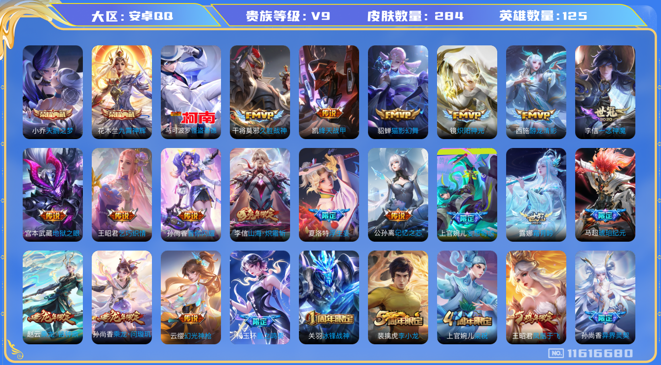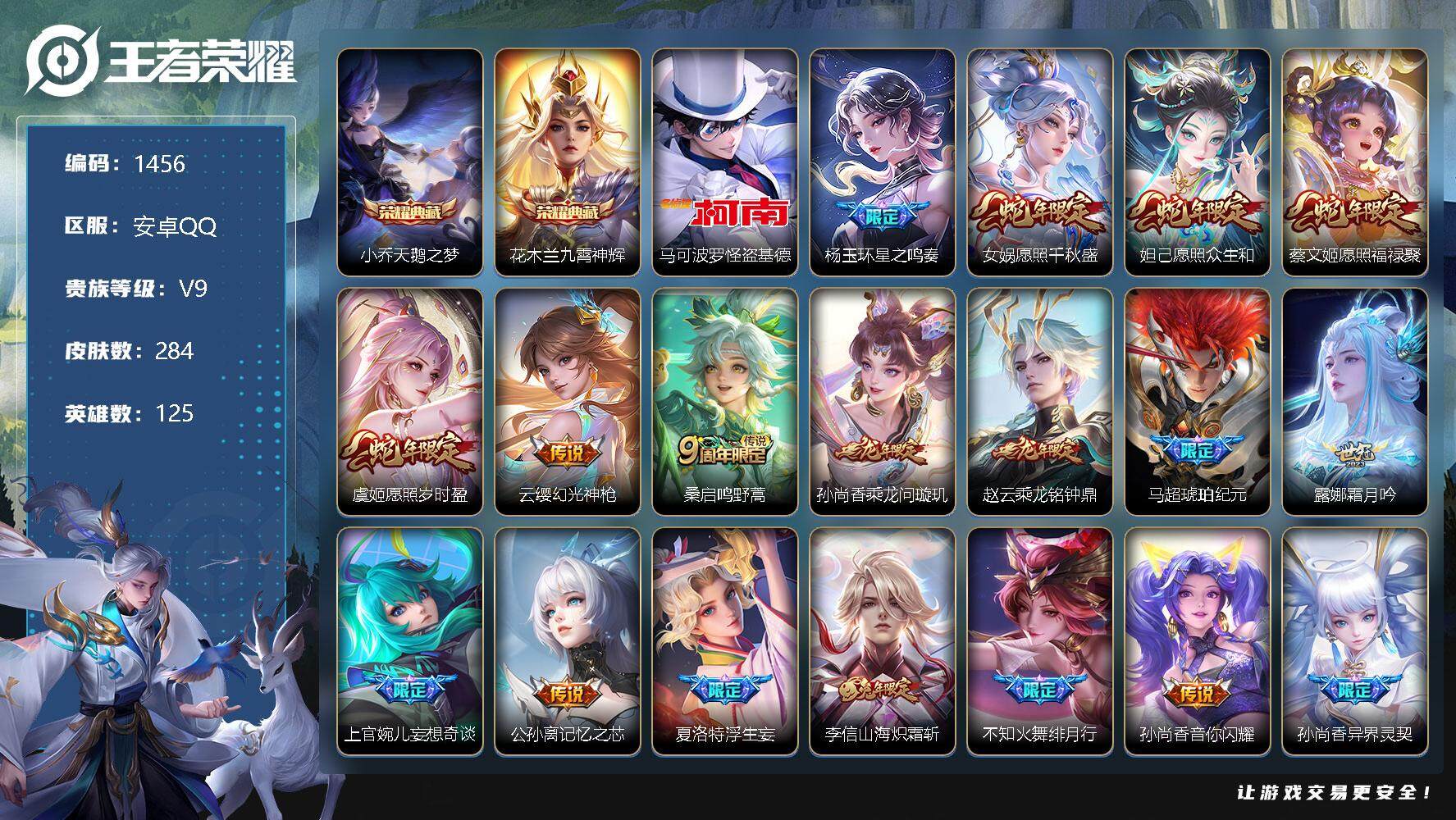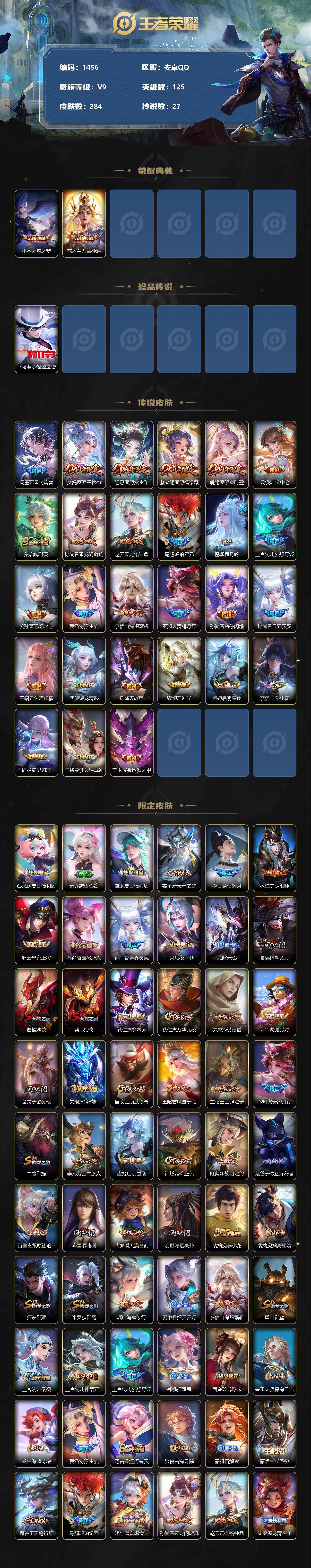 [11616680]【商品标题】:安卓Q-V9-最强王者段位-125英雄-284皮肤-2典藏-0珍品无双-0无双-1珍品传说-27传说-88史诗