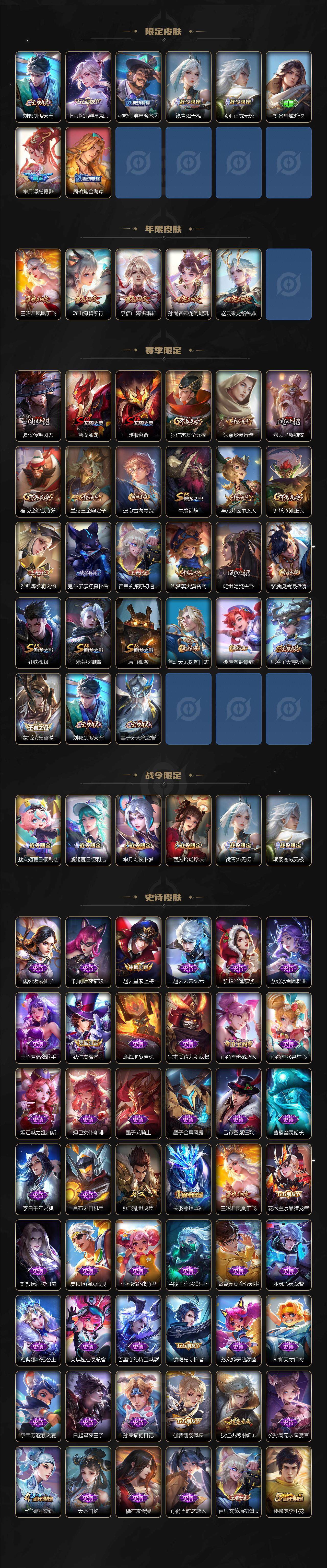 【限定皮肤】:蔡文姬夏日便利店,大乔绒语心约,虞姬夏日便利店,姜子牙天穹之誓,李白谪仙醉月,狄仁杰阴阳师,赵云皇家上将,孙尚香蔷薇恋人,孙尚香异界灵契,芈月幻夜卜梦,元歌无心,夏侯惇朔风刀,曹操烛龙,典韦穷奇,狄仁杰魔术师,狄仁杰万华元夜,达摩沙漠行僧,项羽海滩派对,老夫子醍醐杖,关羽冰锋战神,程咬金演武夺筹,王昭君凤凰于飞,兰陵王金庭之子,不知火舞绯月行,牛魔御旌,李元芳云中旅人,虞姬启明星使,钟馗驱傩正仪,雅典娜黎明之约,鬼谷子原初探秘者,百里玄策原初追逐者,弈星混沌棋,沈梦溪大漠名商,明世隐疑决卦,裴擒虎李小龙,裴擒虎擒涛扼浪,狂铁御狮,米莱狄御霄,瑶山海碧波行,云中君纤云弄巧,李信山海炽霜斩,盾山御銮,上官婉儿梁祝,上官婉儿神器万象笔,上官婉儿妄想奇谈,嫦娥拒霜思,西施玲珑珍味,鲁班大师探海日志,桑启海盐诗旅,夏洛特浮生妄,阿古朵江河有灵,张良古海寻踪,蒙犽百解令,蒙恬荣光圣徽,鬼谷子天穹祈灯,马超琥珀纪元,姬小满妄想食味,孙尚香乘龙问璇玑,赵云乘龙铭钟鼎,沈梦溪龙舞盛年,刘邦剑破天穹,上官婉儿群星魔术团,程咬金群星魔术团,镜青焰无极,项羽苍威无极,刘备异域游侠,芈月浮光幕影,周瑜熔金海岸