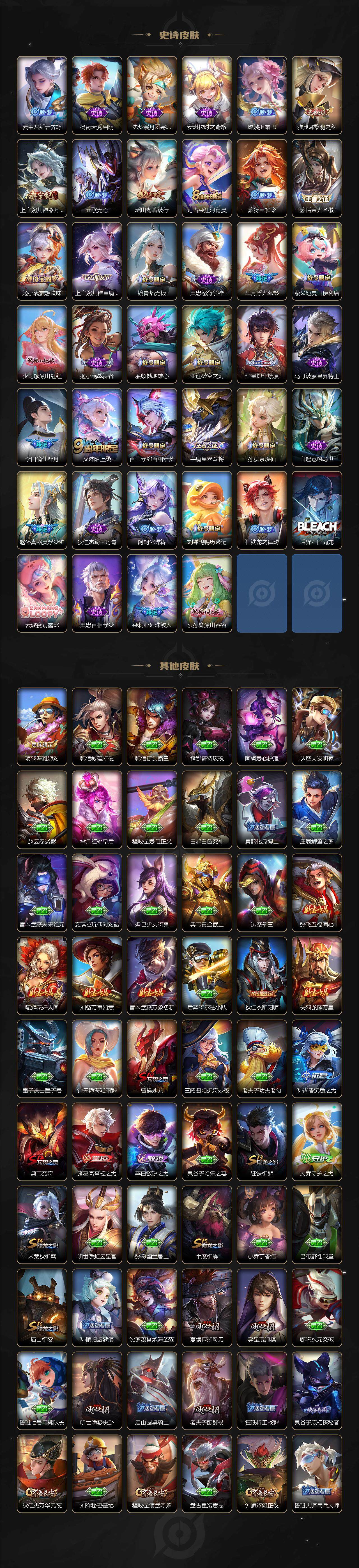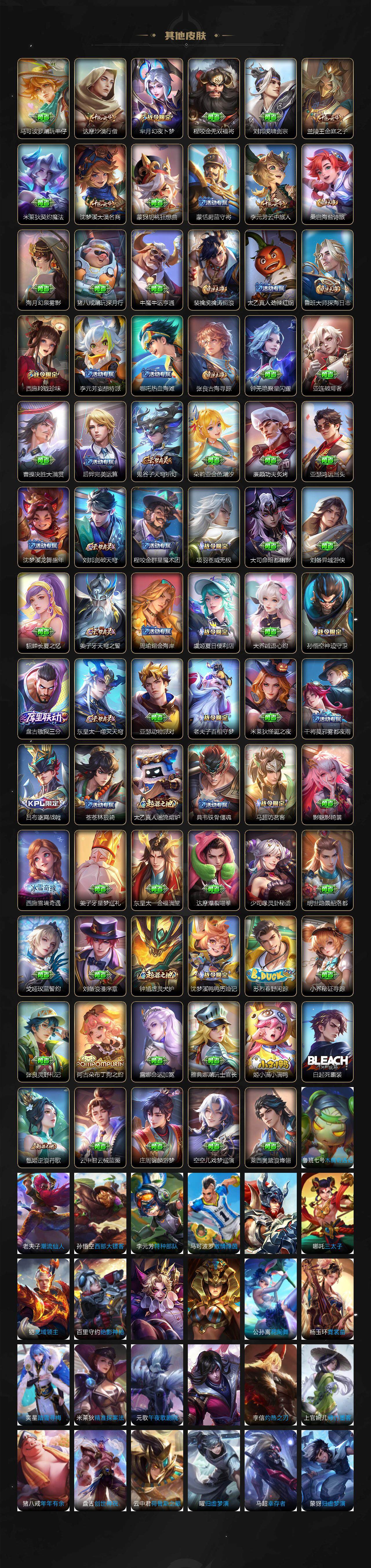 大乔白蛇,伽罗箭羽风息,李元芳逐浪之夏,公孙离无限星赏官,孙策猫狗日记,露娜紫霞仙子,诸葛亮黄金分割率,王昭君偶像歌手,孙尚香时之恋人,阿轲暗夜猫娘,雅典娜冰冠公主,吕布末日机甲,橘右京修罗,墨子龙骑士,刘禅天才门将,白起星夜王子,安琪拉心灵骇客,安琪拉时之奇旅,刘邦德古拉伯爵,兰陵王暗隐猎兽者,曹操幽灵船长,宫本武藏鬼剑武藏,亚瑟心灵战警,杨戬天秀·启明,蔡文姬舞动绿茵,廉颇地狱岩魂,小乔缤纷独角兽,夏侯惇乘风破浪,花木兰水晶猎龙者,铠曙光守护者,墨子金属风暴,百里玄策原初追逐者,吕布圣诞狂欢,貂蝉圣诞恋歌,百里守约特工魅影,嫦娥拒霜思,雅典娜黎明之约,李白千年之狐,蒙犽百解令,上官婉儿群星魔术团,李白谪仙醉月,白起苍鳞隐世,赵怀真器灵·浮梦炉,狄仁杰绮世丹青