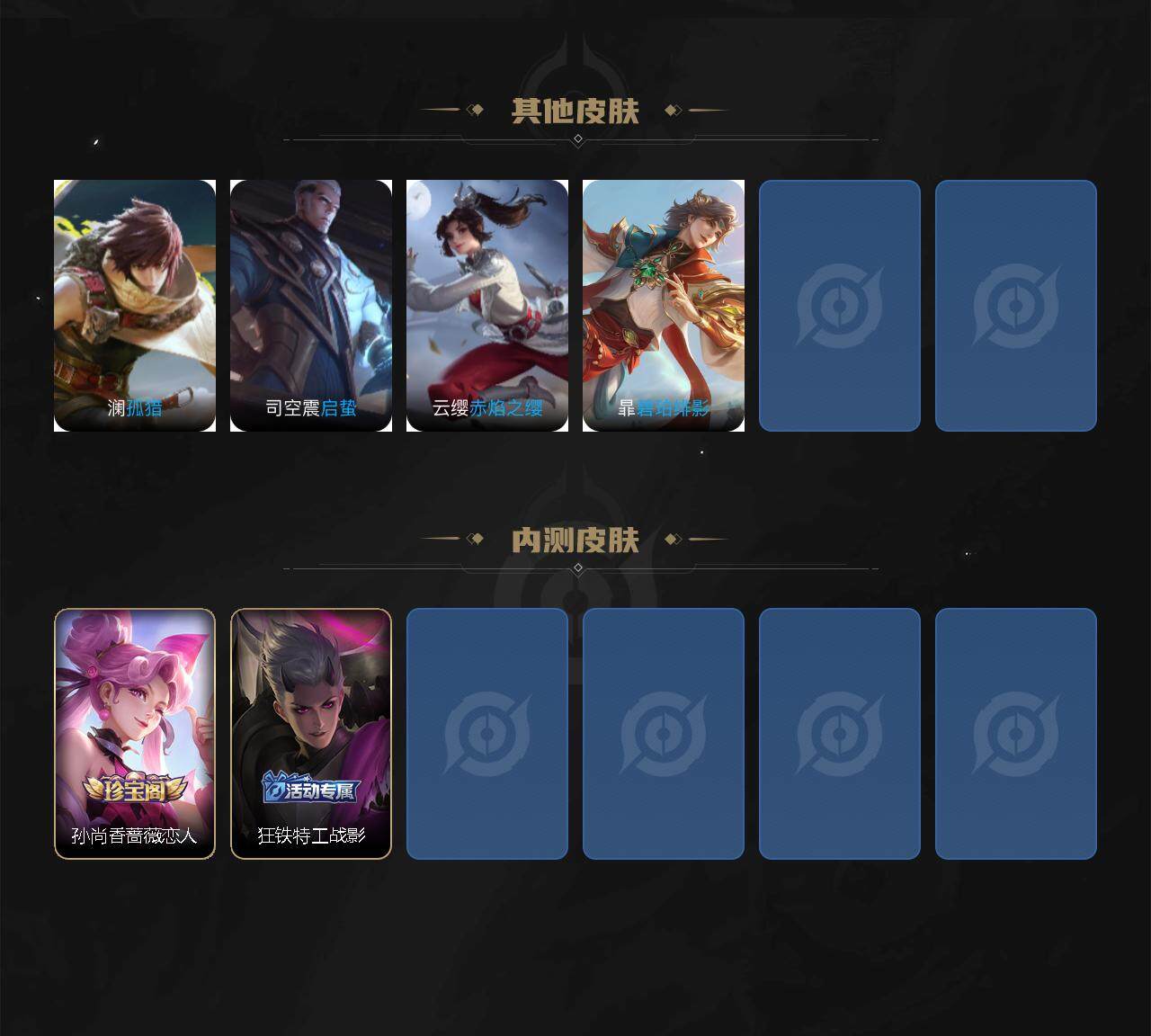 【年限皮肤】:王昭君凤凰于飞,瑶山海碧波行,李信山海炽霜斩,孙尚香乘龙问璇玑,赵云乘龙铭钟鼎