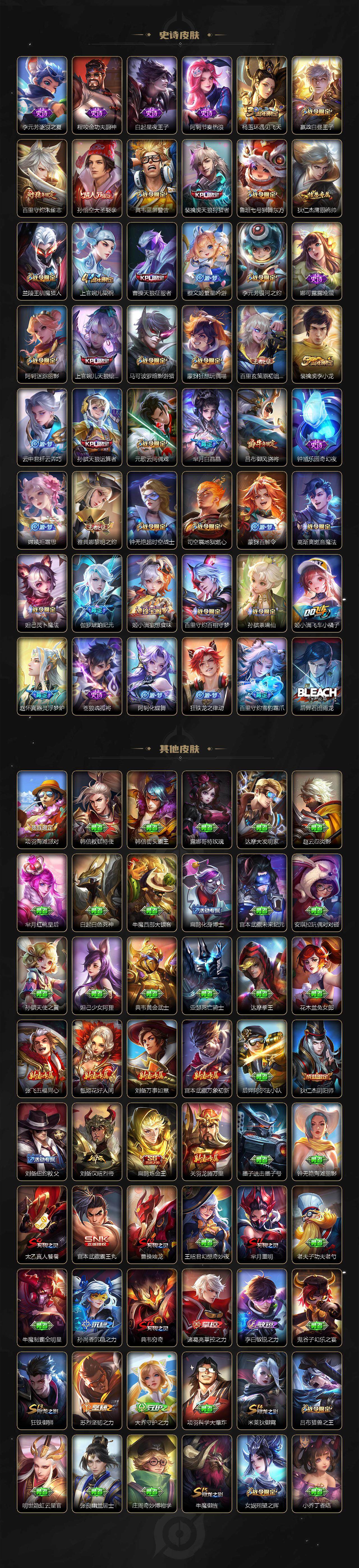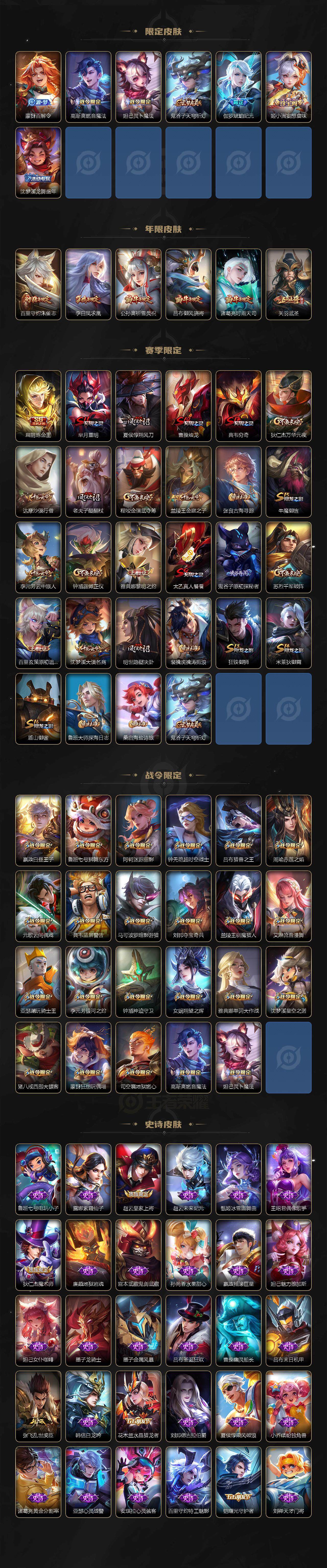 【限定皮肤】:狄仁杰阴阳师,赵云皇家上将,嬴政白昼王子,鲁班七号狮舞东方,阿轲迷踪丽影,钟无艳超时空战士,孙膑天狼运算者,扁鹊炼金王,芈月重明,芈月白晶晶,吕布猎兽之王,吕布御风骁将,周瑜赤莲之焰,元歌云间偶戏,夏侯惇朔风刀,曹操烛龙,曹操天狼征服者,典韦穷奇,典韦蓝屏警告,马可波罗暗影游猎,狄仁杰魔术师,狄仁杰万华元夜,达摩沙漠行僧,项羽海滩派对,老夫子醍醐杖,关羽武圣,程咬金演武夺筹,刘邦夺宝奇兵,兰陵王驯魔猎人,兰陵王金庭之子,亚瑟潮玩骑士王,孙悟空大圣娶亲,孙悟空零号赤焰,牛魔御旌,李元芳银河之约,李元芳云中旅人,虞姬启明星使,钟馗神迹守卫,钟馗驱傩正仪,杨玉环遇见飞天,女娲朔望之晖,雅典娜单词大作战,雅典娜黎明之约,蔡文姬繁星吟游,太乙真人饕餮,鬼谷子原初探秘者,诸葛亮时雨天司,苏烈千军破阵,百里玄策原初追逐者,百里守约朱雀志,弈星混沌棋,公孙离祈雪灵祝,沈梦溪星空之诺,沈梦溪大漠名商,明世隐疑决卦,裴擒虎天狼狩猎者,裴擒虎李小龙,裴擒虎擒涛扼浪,狂铁御狮,米莱狄御霄,云中君纤云弄巧,盾山御銮,猪八戒西部大镖客,上官婉儿梁祝,上官婉儿天狼绘梦者,嫦娥拒霜思,蒙犽狂想玩偶喵,鲁班大师探海日志,桑启海盐诗旅,艾琳流音漫舞,司空震地狱燃心,张良古海寻踪,蒙犽百解令,高渐离燃音魔法,妲己灵卜魔法,鬼谷子天穹祈灯,伽罗琥珀纪元,姬小满妄想食味,沈梦溪龙舞盛年