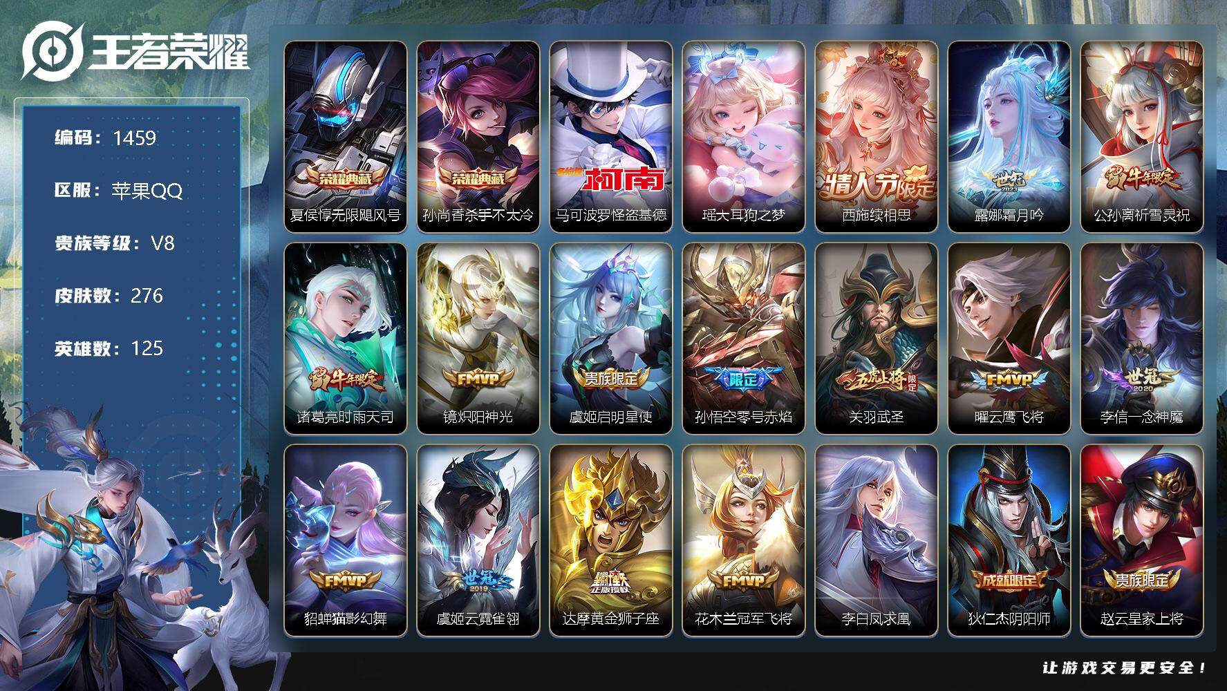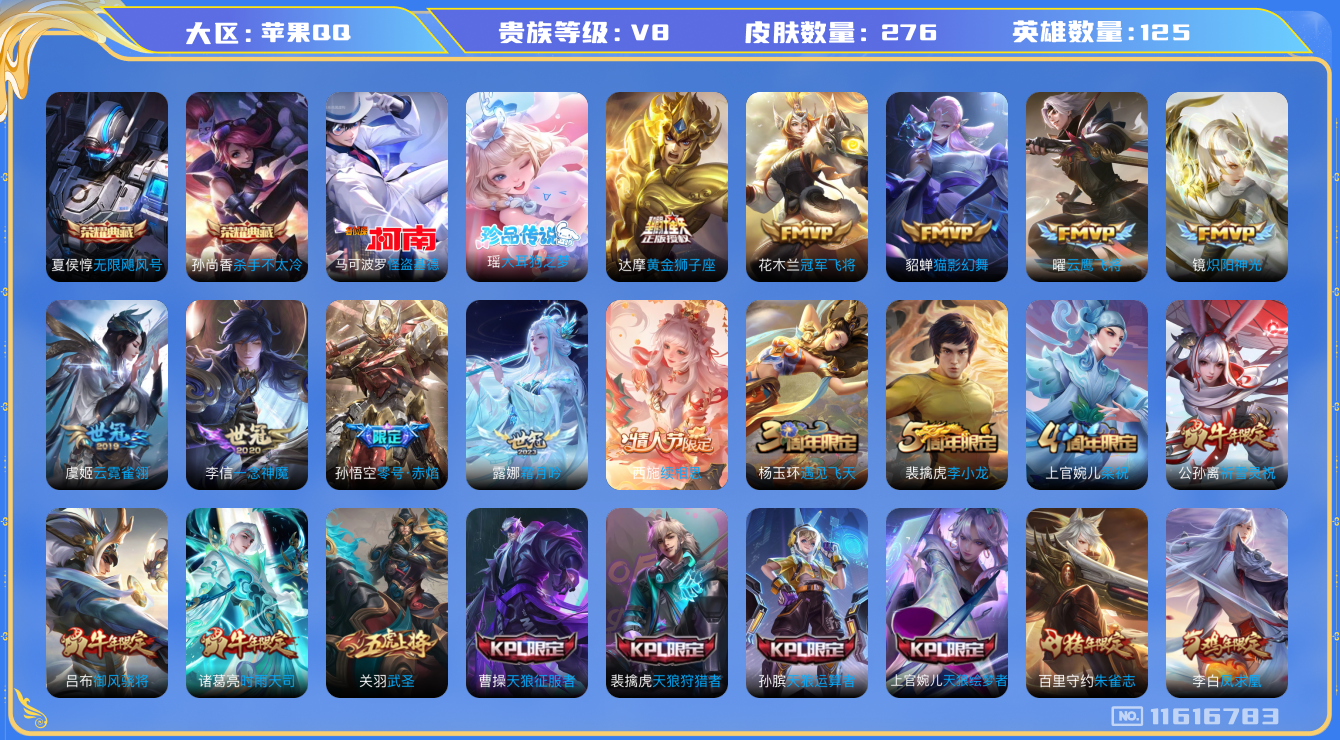 [11616783]【商品标题】:苹果Q-V7-永恒钻石I段位-125英雄-276皮肤-2典藏-0珍品无双-0无双-2珍品传说-15传说-77史诗