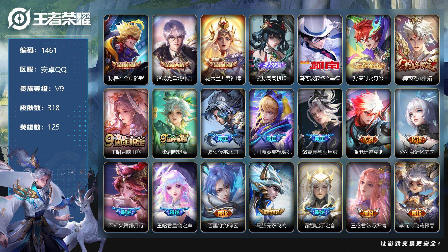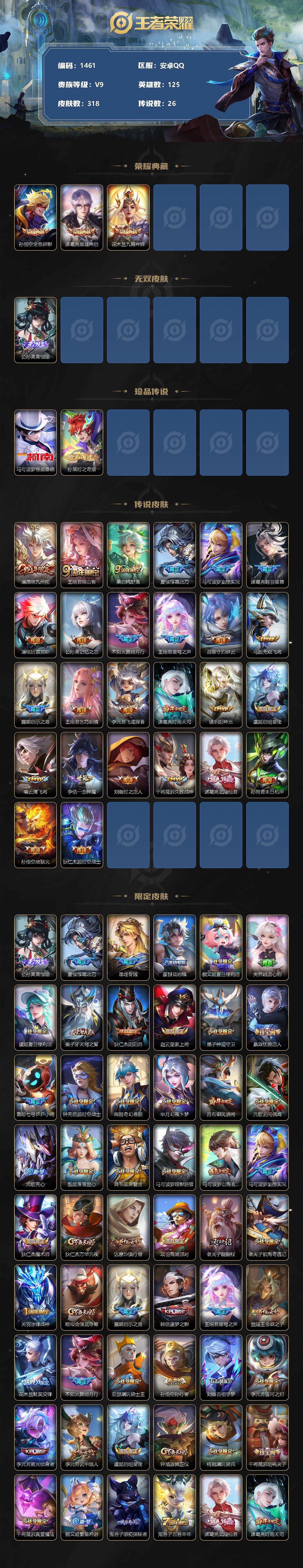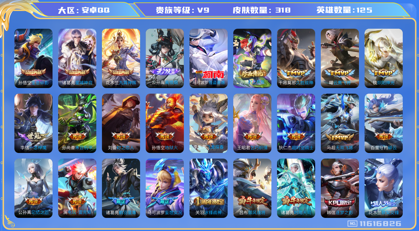 [11616826]【商品标题】:安卓Q-V9-最强王者段位-125英雄-318皮肤-3典藏-0珍品无双-1无双-2珍品传说-26传说-96史诗
