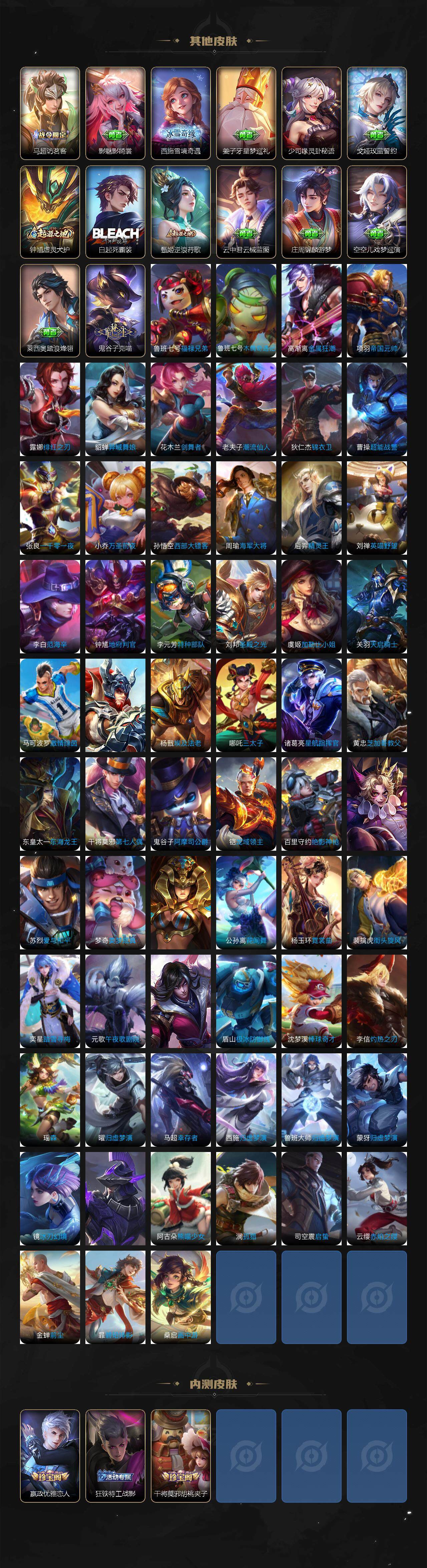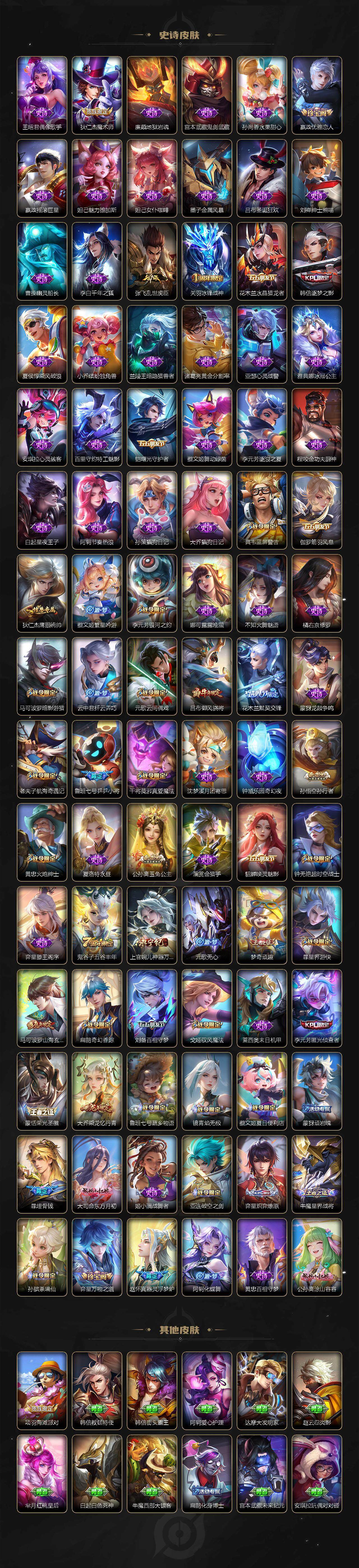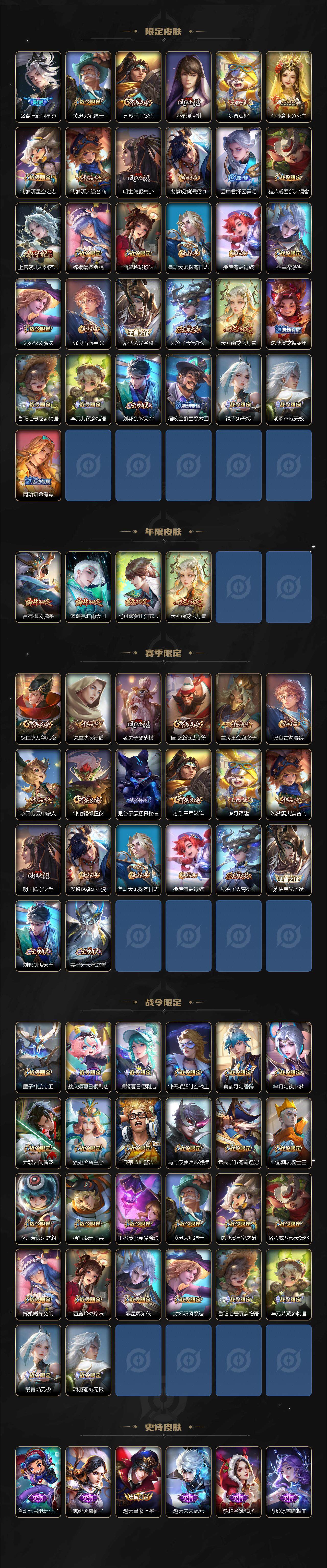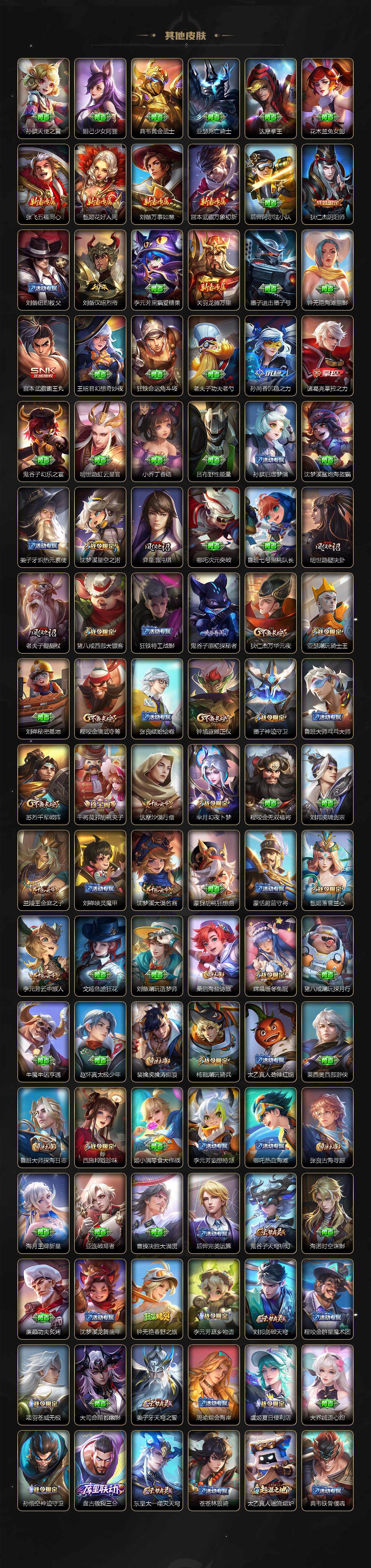 【限定皮肤】:公孙离离恨烟,夏侯惇霜北刀,暃埋骨钱,蒙犽顽岩魄,蔡文姬夏日便利店,大乔绒语心约,虞姬夏日便利店,姜子牙天穹之誓,狄仁杰阴阳师,赵云皇家上将,墨子神迹守卫,嬴政优雅恋人,鲁班七号乒乒小将,钟无艳超时空战士,扁鹊奇幻香踪,芈月幻夜卜梦,吕布御风骁将,元歌云间偶戏,元歌无心,甄姬落雪兰心,典韦蓝屏警告,马可波罗暗影游猎,马可波罗山海玄木吟,马可波罗妄想实况,狄仁杰魔术师,狄仁杰万华元夜,达摩沙漠行僧,项羽海滩派对,老夫子醍醐杖,老夫子航海奇遇记,关羽冰锋战神,程咬金演武夺筹,露娜启示之音,韩信逐梦之影,王昭君星穹之声,兰陵王金庭之子,花木兰默契交锋,不知火舞绯月行,亚瑟潮玩骑士王,孙悟空孙行者,刘备百相守梦,李元芳银河之约,李元芳匿光侦查者,李元芳云中旅人,虞姬启明星使,钟馗驱傩正仪,杨戬潮玩骑兵,干将莫邪胡桃夹子,干将莫邪真爱魔法,蔡文姬繁星吟游,鬼谷子原初探秘者,鬼谷子五谷丰年,诸葛亮武陵仙君,诸葛亮时雨天司,诸葛亮鹤羽星尊,黄忠火炮绅士,苏烈千军破阵,弈星混沌棋,梦奇顽趣,公孙离玉兔公主,沈梦溪星空之诺,沈梦溪大漠名商,明世隐疑决卦,裴擒虎擒涛扼浪,云中君纤云弄巧,猪八戒西部大镖客,上官婉儿神器万象笔,嫦娥暖冬兔眠,西施玲珑珍味,鲁班大师探海日志,桑启海盐诗旅,暃星界游侠,戈娅驭风魔法,张良古海寻踪,蒙恬荣光圣徽,鬼谷子天穹祈灯,大乔乘龙忆丹青,沈梦溪龙舞盛年,鲁班七号蔬乡物语,李元芳蔬乡物语,刘邦剑破天穹,程咬金群星魔术团,镜青焰无极,项羽苍威无极,周瑜熔金海岸