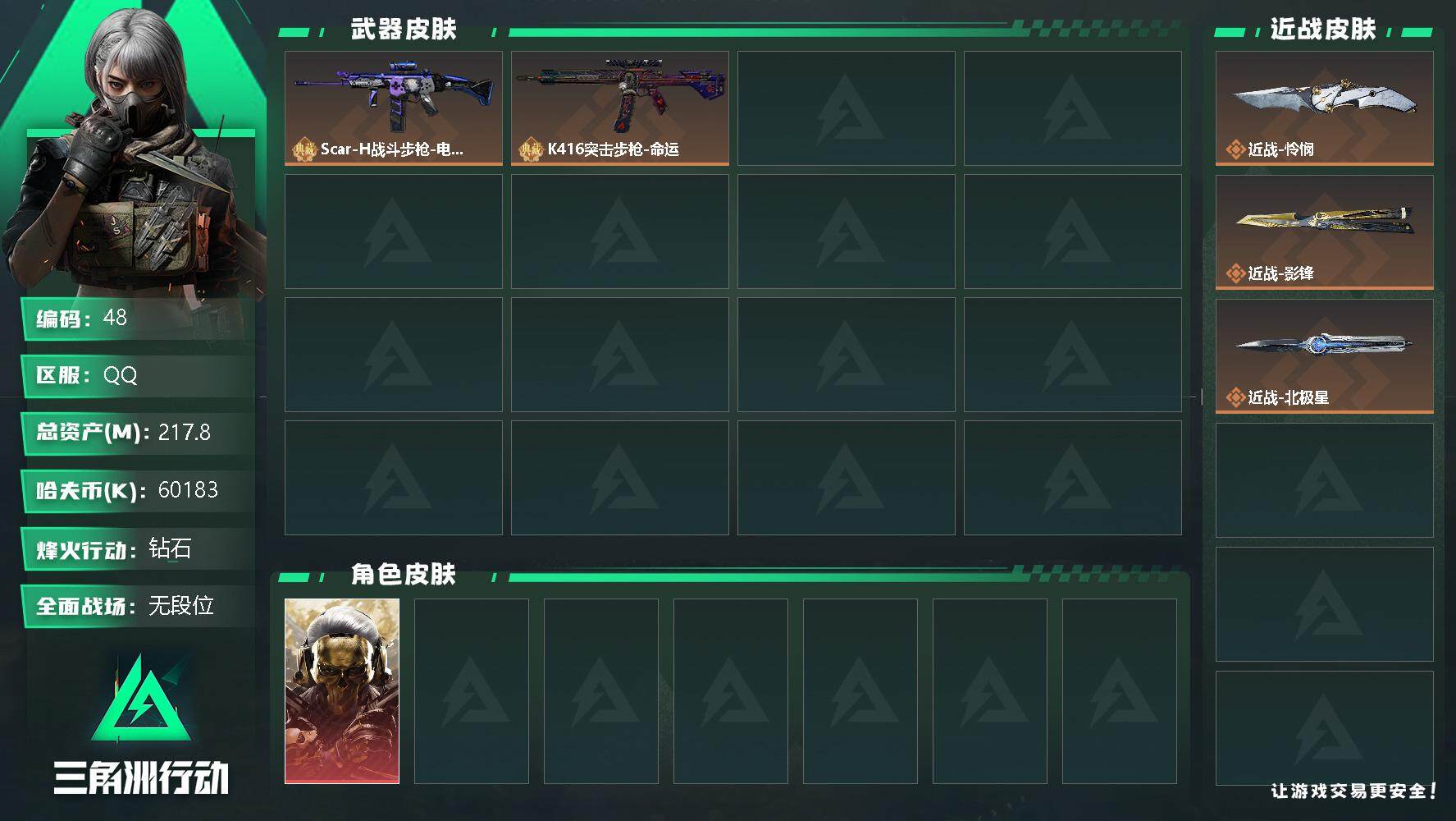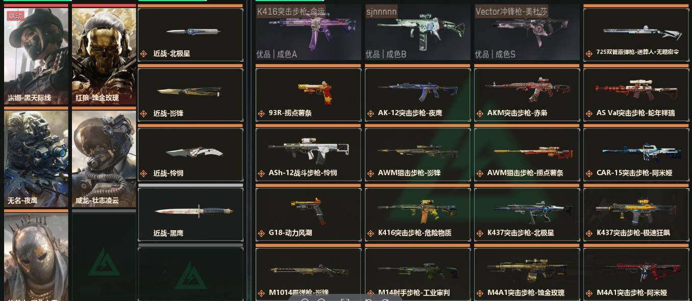 - [11349135]总资产:171.6M 12传说枪械 哈夫币:43.086K 高级安全箱(2×3)9.15号到期 可二次 可修改实名 烽火地带段位:钻石 全面战场段位:列兵 传说武器皮肤:M4A1突击步枪-阿米娅,CAR-15突击步枪-阿米娅,复合弓-黑-天际线,AWM狙击步枪-捞点薯条,腾龙突击步枪-捞点薯条,93R-捞点薯条,AK-12突击步枪-特斯拉线圈,SR-3M紧凑突击步枪-特斯拉线圈,UZI冲锋枪-特斯拉线圈,勇士冲锋枪-能天使-午夜邮差,725双管霰弹枪-送葬人-无题密令,Vector冲锋枪-能天使-午夜邮差 史诗武器皮肤:PKM通用机枪-蝮蛇,PKM通用机枪-荒野求生,SR-3M紧凑突击步枪-荒野求生,SV-98狙击步枪-林中猎手,AS Val突击步枪-典狱官,M250通用机枪-囚徒,PSG-1射手步枪-无垢