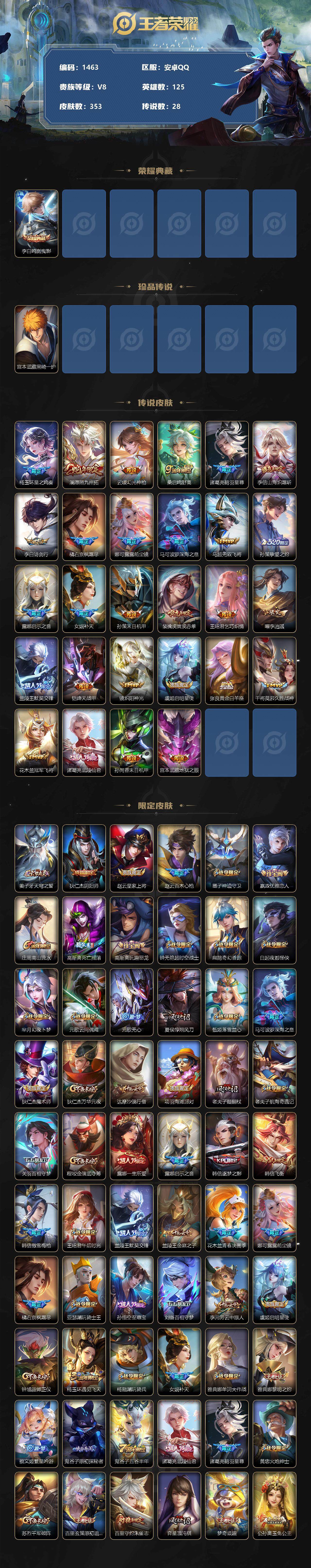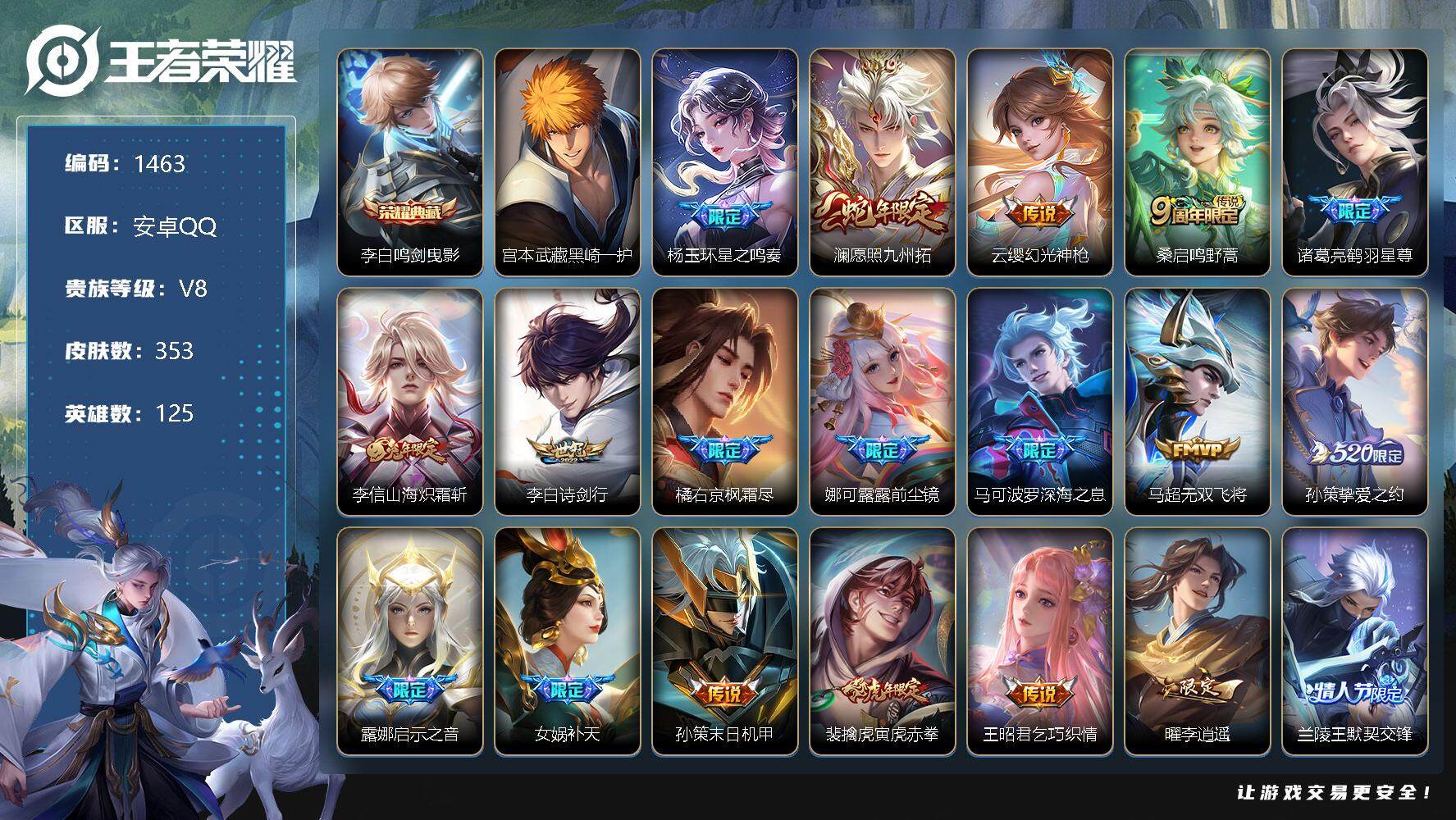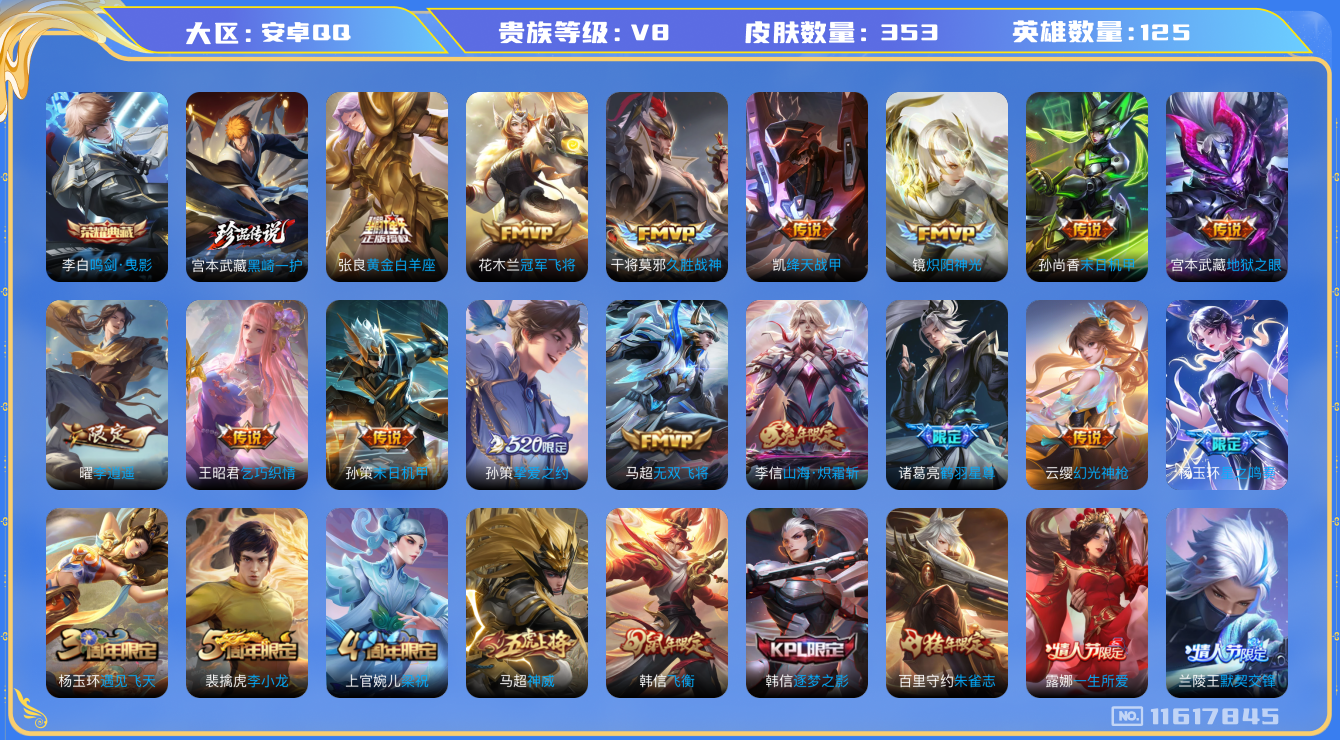 [11617845]【商品标题】:安卓Q-V8-最强王者段位-125英雄-353皮肤-1典藏-0珍品无双-0无双-1珍品传说-28传说-106史诗