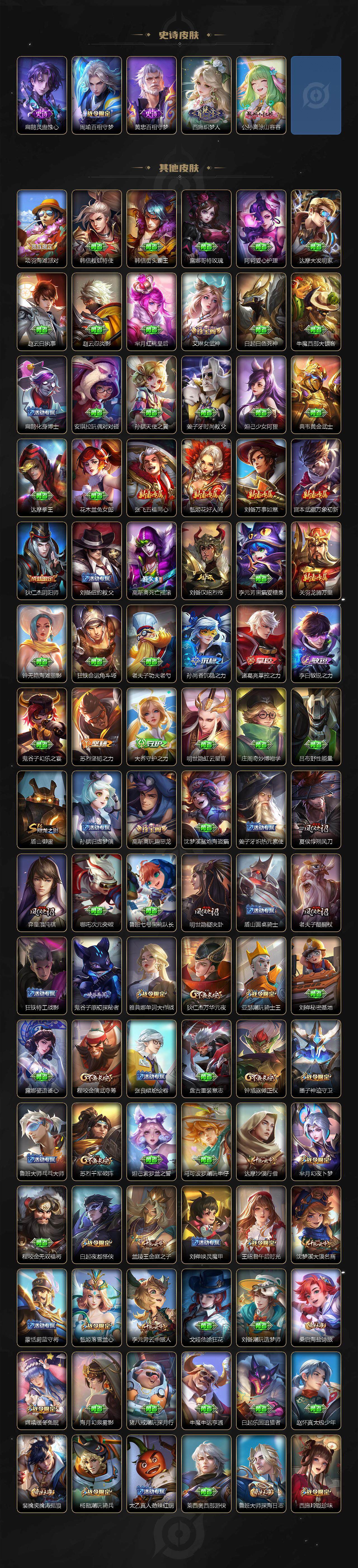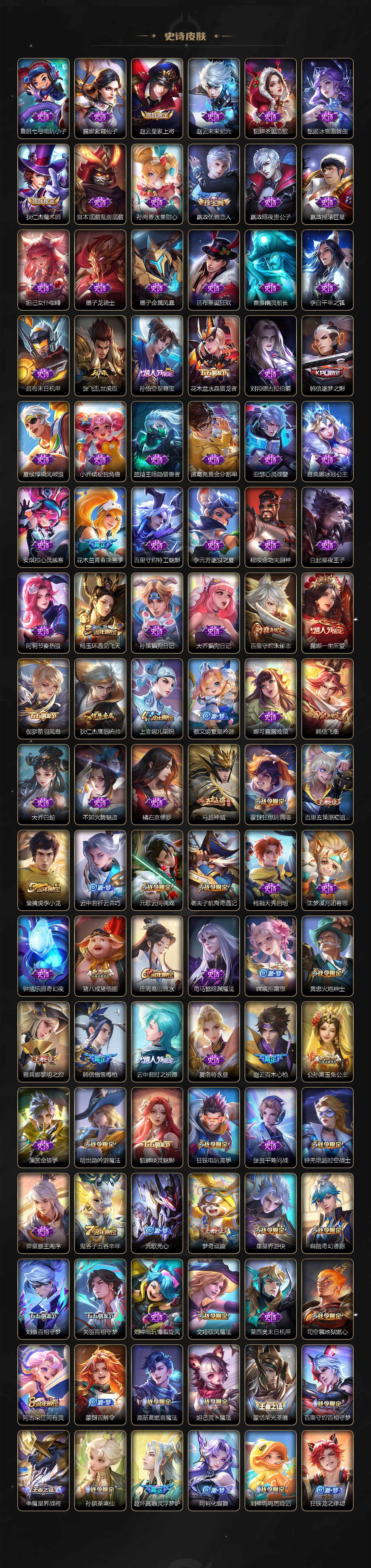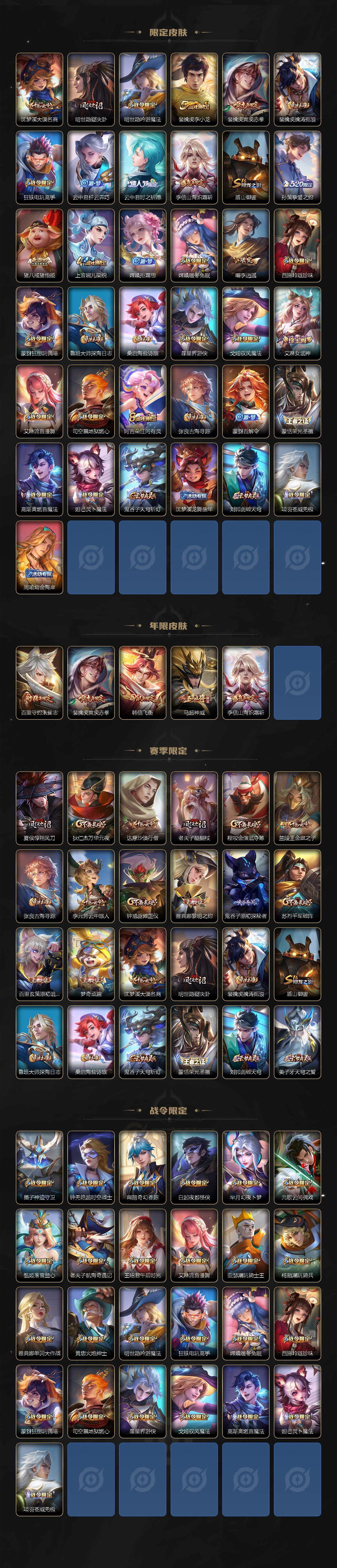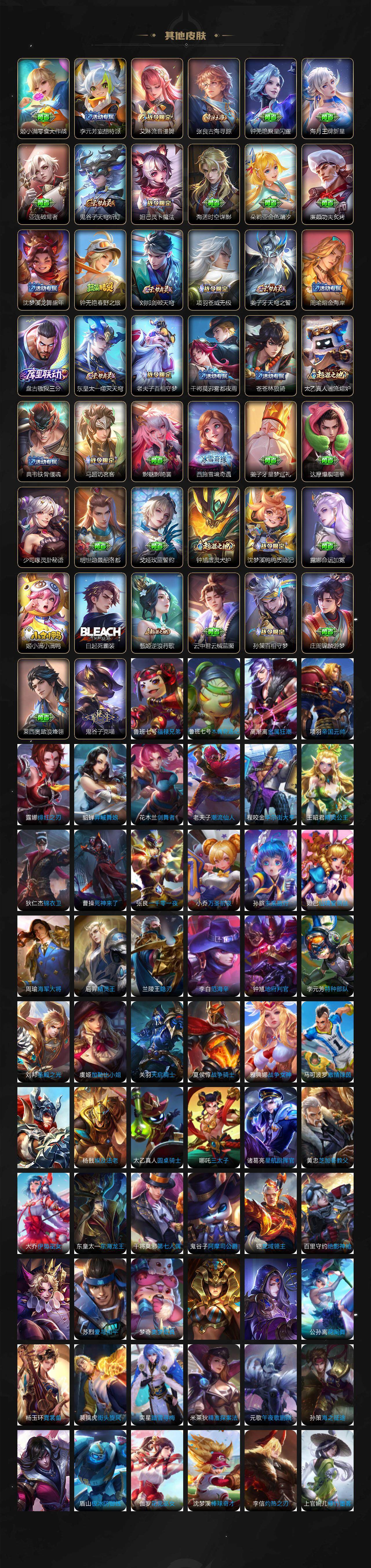 【限定皮肤】:姜子牙天穹之誓,狄仁杰阴阳师,赵云皇家上将,赵云百木心枪,墨子神迹守卫,嬴政优雅恋人,庄周高山流水,高渐离死亡摇滚,高渐离玩趣恶龙,钟无艳超时空战士,扁鹊奇幻香踪,白起夜都怪侠,芈月幻夜卜梦,元歌云间偶戏,元歌无心,夏侯惇朔风刀,甄姬落雪兰心,马可波罗深海之息,狄仁杰魔术师,狄仁杰万华元夜,达摩沙漠行僧,项羽海滩派对,老夫子醍醐杖,老夫子航海奇遇记,关羽百相守梦,程咬金演武夺筹,露娜一生所爱,露娜启示之音,韩信逐梦之影,韩信飞衡,韩信傲雪梅枪,王昭君午后时光,兰陵王默契交锋,兰陵王金庭之子,花木兰青春决赛季,娜可露露前尘镜,橘右京枫霜尽,亚瑟潮玩骑士王,孙悟空至尊宝,刘备百相守梦,李元芳云中旅人,虞姬启明星使,钟馗驱傩正仪,杨玉环遇见飞天,杨戬潮玩骑兵,女娲补天,雅典娜单词大作战,雅典娜黎明之约,蔡文姬繁星吟游,鬼谷子原初探秘者,鬼谷子五谷丰年,诸葛亮武陵仙君,诸葛亮鹤羽星尊,黄忠火炮绅士,苏烈千军破阵,百里玄策原初追逐者,百里守约朱雀志,弈星混沌棋,梦奇顽趣,公孙离玉兔公主,沈梦溪大漠名商,明世隐疑决卦,明世隐吟游魔法,裴擒虎李小龙,裴擒虎寅虎赤拳,裴擒虎擒涛扼浪,狂铁电玩高手,云中君纤云弄巧,云中君时之祈愿,李信山海炽霜斩,盾山御銮,孙策挚爱之约,猪八戒猪悟能,上官婉儿梁祝,嫦娥拒霜思,嫦娥暖冬兔眠,曜李逍遥 ,西施玲珑珍味,蒙犽狂想玩偶喵,鲁班大师探海日志,桑启海盐诗旅,暃星界游侠,戈娅驭风魔法,艾琳女武神,艾琳流音漫舞,司空震地狱燃心,阿古朵江河有灵,张良古海寻踪,蒙犽百解令,蒙恬荣光圣徽,高渐离燃音魔法,妲己灵卜魔法,鬼谷子天穹祈灯,沈梦
