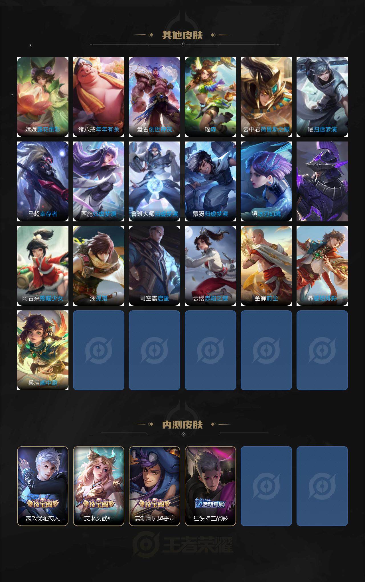 裴擒虎李小龙,上官婉儿梁祝,马超神威,韩信飞衡,韩信逐梦之影,百里守约朱雀志,露娜一生所爱,兰陵王默契交锋,孙悟空至尊宝,花木兰青春决赛季,猪八戒猪悟能,韩信傲雪梅枪,裴擒虎寅虎·赤拳,云中君时之祈愿,女娲补天,赵云百木心枪,公孙离玉兔公主,露娜启示之音,马可波罗深海之息,娜可露露前尘镜,橘右京枫霜尽,李白诗剑行,桑启鸣野蒿,澜愿照·九州拓