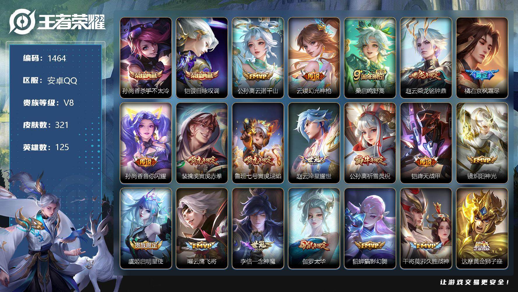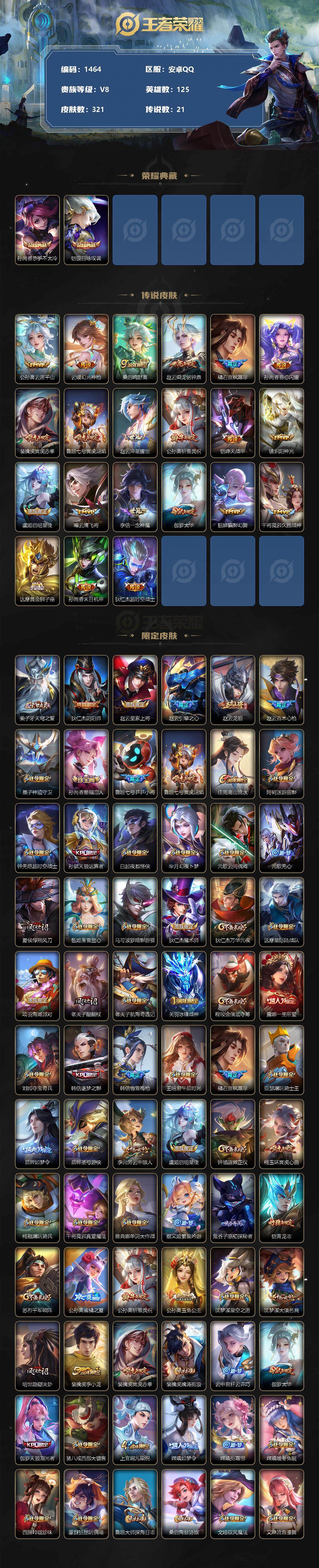 - [11687065]V8 1典藏 1珍品传说 6传说 124英雄 329皮肤 可修改实名 女号 安全保护中 优质装备:拾光映像(瑶典藏),大耳狗之梦,仲夏夜之梦(大飞蛾),零号·赤焰 传说皮:续相思 珍宝阁皮:蔷薇恋人,女武神,玩趣恶龙 限定皮:愿照·福禄聚(蔡文姬年限),逐霄战戟,鸣野蒿,傲雪梅枪,山海·碧波行(瑶年限),高山流水,五谷丰年,梁祝,御风骁将(吕布年限),李小龙,一生所爱,青春决赛季,冰霜恋舞曲,匿光追影者 史诗皮:赞萌露比,飞车小橘子,化蝶舞,灵蛊蚀心,星界战将,谪仙醉月,茶境仙,幻珠鲛人,破空之剑,涂山红红,琥珀纪元伽罗,蔬乡物语(鲁班七号),百相守梦-百里守约,百相守梦-黄忠,守夜人,遇见神鹿,紫霞仙子,苍穹之光,特工魅影,千年之狐,永昼,江河有灵,魅语,百解令(蒙犽),蒙恬荣光圣徽,无限星赏官,冰冠公主,青蛇,偶像歌手,晚萤,电玩·爆裂旋风,暗夜猫娘,末日机甲-吕布,猫狗日记-孙策,猫狗日记-大乔,时之恋人-孙尚香,乱世虎臣,修罗,女仆咖啡,摇滚巨星,水果甜心,绅士熊喵,天才门将,星夜王子,心灵骇客,时之奇旅-安琪拉,功夫厨神,暗隐猎兽者,幽灵船长,鬼剑武藏,心灵战警,天秀·启明,地狱岩魂,诗语江南,纤云弄巧,拒霜思,缤纷独角兽,乘风破浪,逐浪之夏,水晶猎龙者,曙光守护者,唤灵魅影,金属风暴,原初追逐者,圣诞狂欢,圣诞恋歌,鹰眼统帅,魅力维加斯,黎明之约,赏金猎手,滕王阁序,无心,未来纪元-赵云