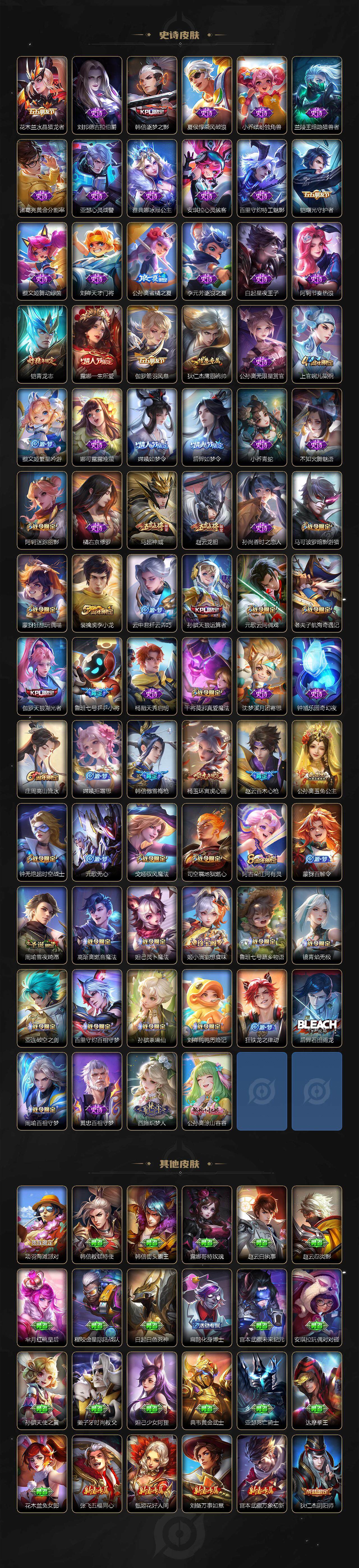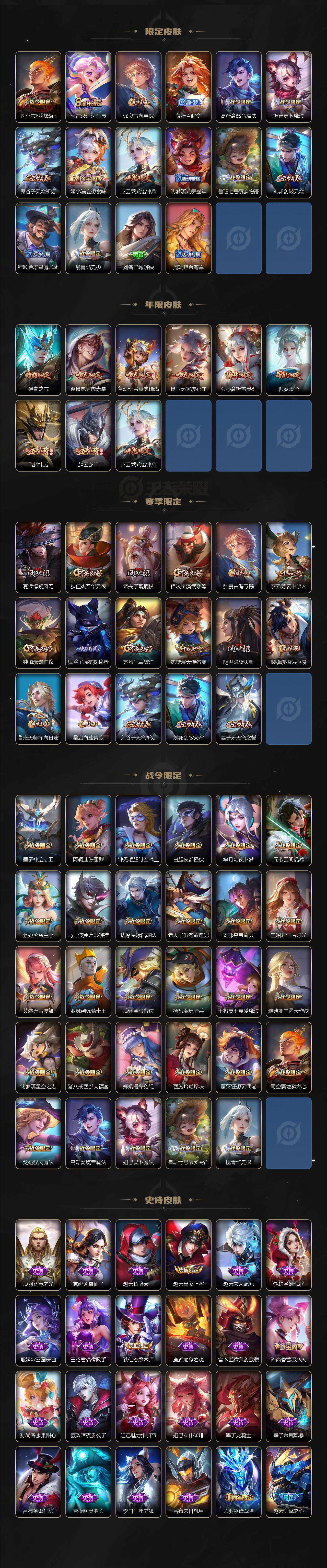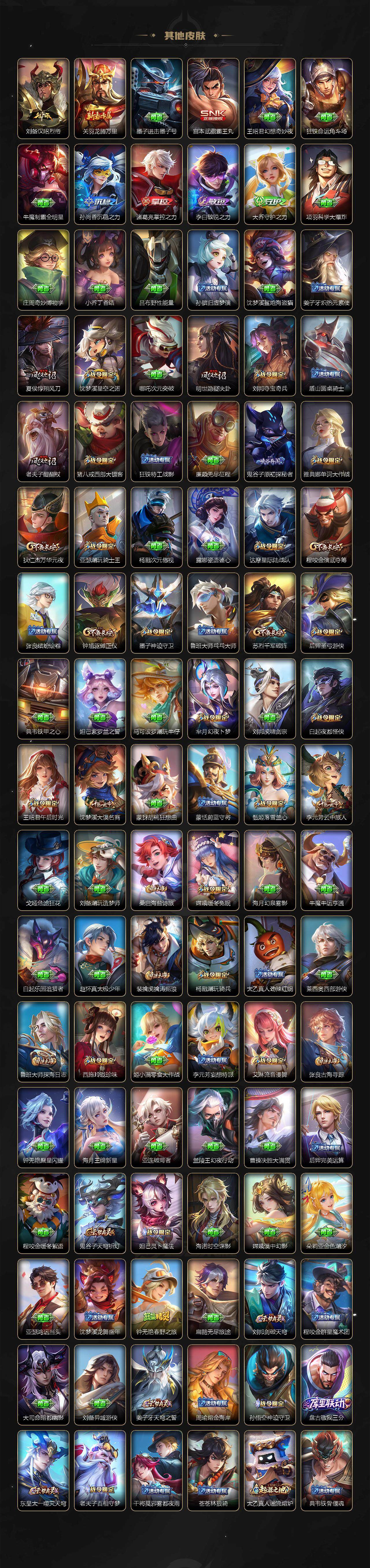 【限定皮肤】:姜子牙天穹之誓,狄仁杰阴阳师,赵云皇家上将,赵云引擎之心,赵云龙胆,赵云百木心枪,墨子神迹守卫,孙尚香蔷薇恋人,鲁班七号乒乒小将,鲁班七号寅虎瑞焰,庄周高山流水,阿轲迷踪丽影,钟无艳超时空战士,孙膑天狼运算者,白起夜都怪侠,芈月幻夜卜梦,元歌云间偶戏,元歌无心,夏侯惇朔风刀,甄姬落雪兰心,马可波罗暗影游猎,狄仁杰魔术师,狄仁杰万华元夜,达摩星际陆战队,项羽海滩派对,老夫子醍醐杖,老夫子航海奇遇记,关羽冰锋战神,程咬金演武夺筹,露娜一生所爱,刘邦夺宝奇兵,韩信逐梦之影,韩信傲雪梅枪,王昭君午后时光,橘右京枫霜尽,亚瑟潮玩骑士王,后羿如梦令,后羿圣弓游侠,李元芳云中旅人,虞姬启明星使,钟馗驱傩正仪,杨玉环寅虎心曲,杨戬潮玩骑兵,干将莫邪真爱魔法,雅典娜单词大作战,蔡文姬繁星吟游,鬼谷子原初探秘者,铠青龙志,苏烈千军破阵,公孙离蜜橘之夏,公孙离祈雪灵祝,公孙离玉兔公主,沈梦溪星空之诺,沈梦溪大漠名商,明世隐疑决卦,裴擒虎李小龙,裴擒虎寅虎赤拳,裴擒虎擒涛扼浪,云中君纤云弄巧,伽罗太华,伽罗天狼溯光者,猪八戒西部大镖客,上官婉儿梁祝,嫦娥如梦令,嫦娥拒霜思,嫦娥暖冬兔眠,西施玲珑珍味,蒙犽狂想玩偶喵,鲁班大师探海日志,桑启海盐诗旅,戈娅驭风魔法,艾琳流音漫舞,司空震地狱燃心,阿古朵江河有灵,张良古海寻踪,蒙犽百解令,高渐离燃音魔法,妲己灵卜魔法,鬼谷子天穹祈灯,姬小满妄想食味,赵云乘龙铭钟鼎,沈梦溪龙舞盛年,鲁班七号蔬乡物语,刘邦剑破天穹,程咬金群星魔术团,镜青焰无极,刘备异域游侠,周瑜熔金海岸