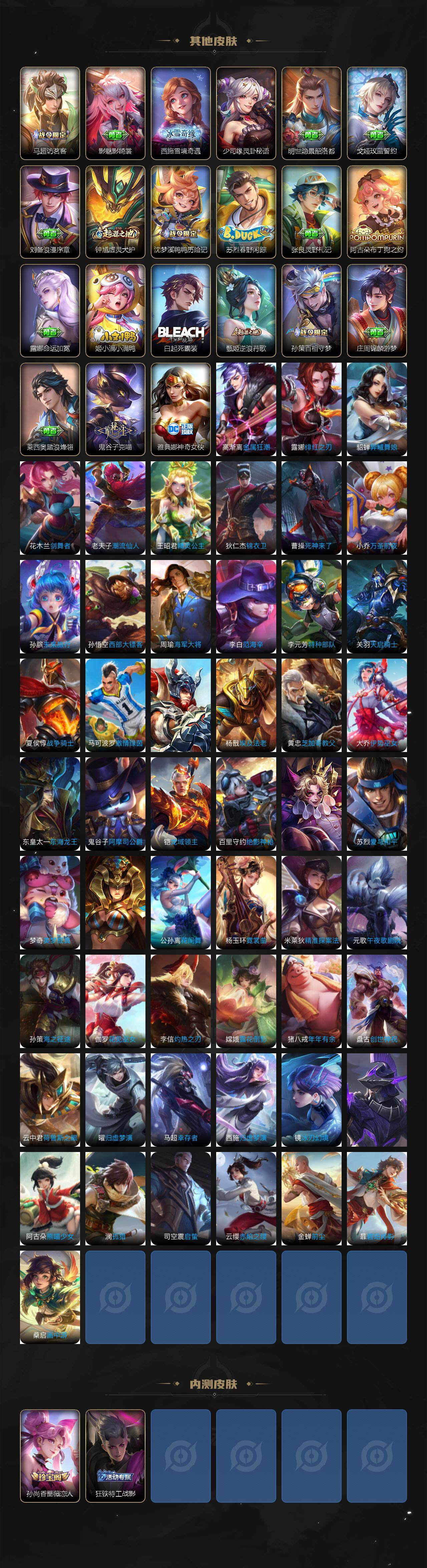 - [12205045]V6 8传说 124英雄 183皮肤 可修改实名 女号 优质装备:冠军飞将,绛天战甲(鸡嘴战神),胖达荣荣,琥珀纪元铠 传说皮:云诺千山,幻光神枪 珍宝阁皮:蔷薇恋人 限定皮:愿照·岁时盈(虞姬年限),鸣野蒿,五谷丰年,李小龙,孙行者,山海·玄木吟(马可年限) 史诗皮:鸭鸭历险记-刘禅,器灵·浮梦炉,狼魂孤将,化蝶舞,星界战将,龙之律动,雪豹·霜爪,石田雨龙,茶境仙,琥珀纪元伽罗,上官婉儿群星魔术团,蔬乡物语(鲁班七号),星界特工,紫霞仙子,黄金分割率,特工魅影,千年之狐,江河有灵,高渐离燃音魔法,偶像歌手,电玩·爆裂旋风,猫狗日记-孙策,乱世虎臣,节奏热浪,女仆咖啡,水果甜心,心灵骇客,暗隐猎兽者,鬼剑武藏,天秀·启明,纤云弄巧,拒霜思,缤纷独角兽,逐浪之夏,金属风暴,圣诞恋歌,鹰眼统帅