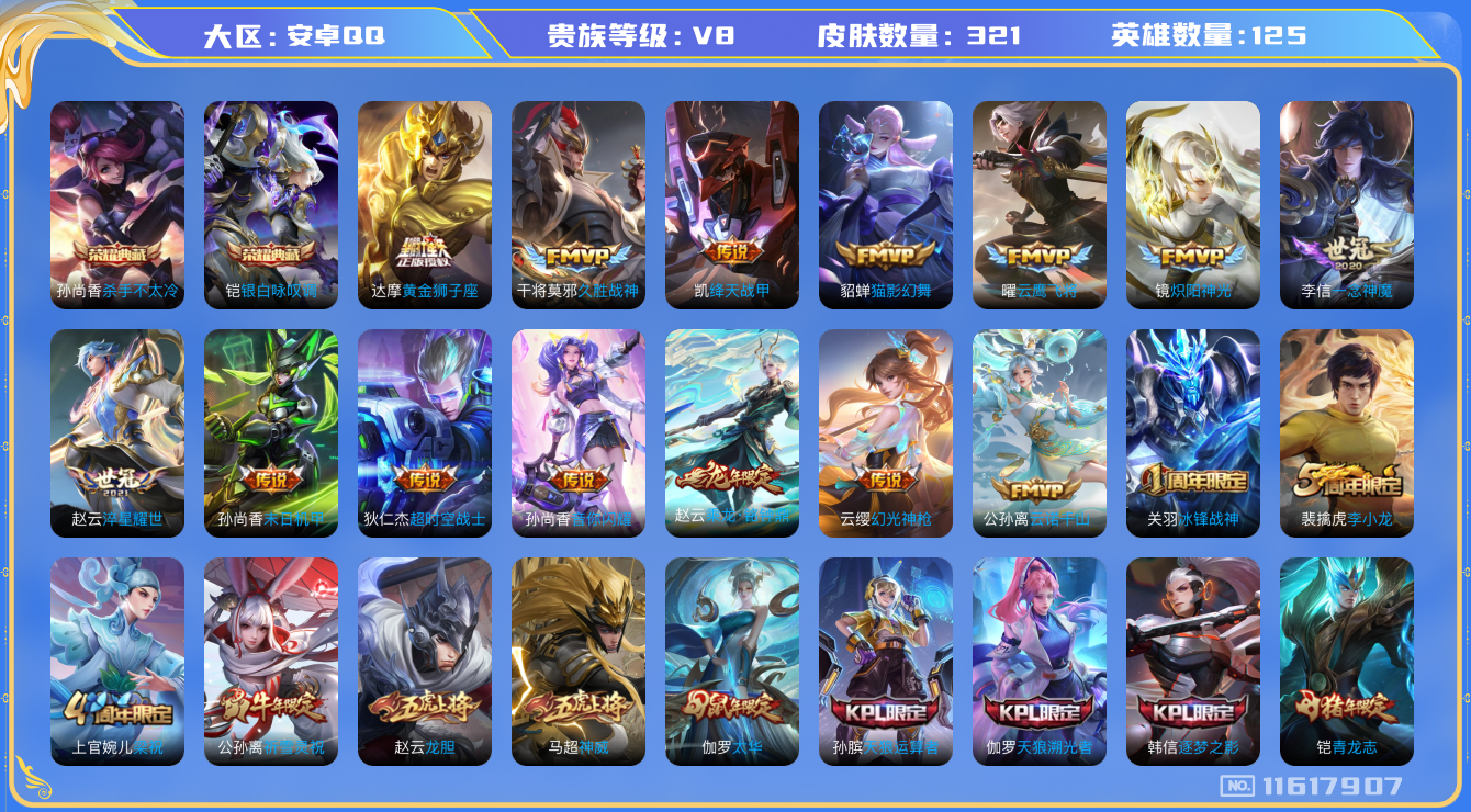 [11617907]【商品标题】:安卓Q-V8-尊贵铂金III段位-125英雄-321皮肤-2典藏-0珍品无双-0无双-0珍品传说-21传说-99史诗