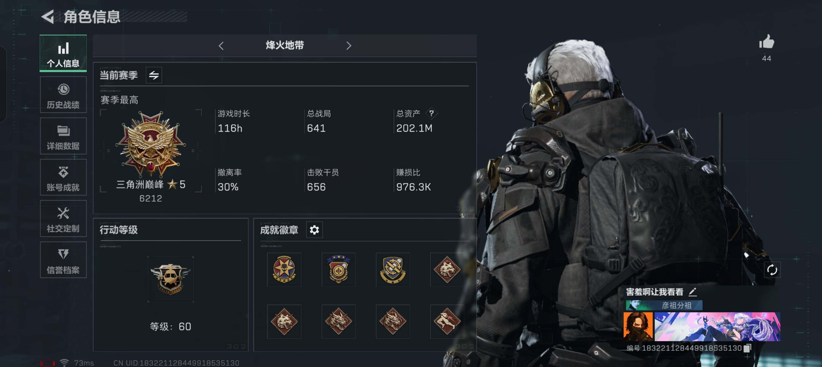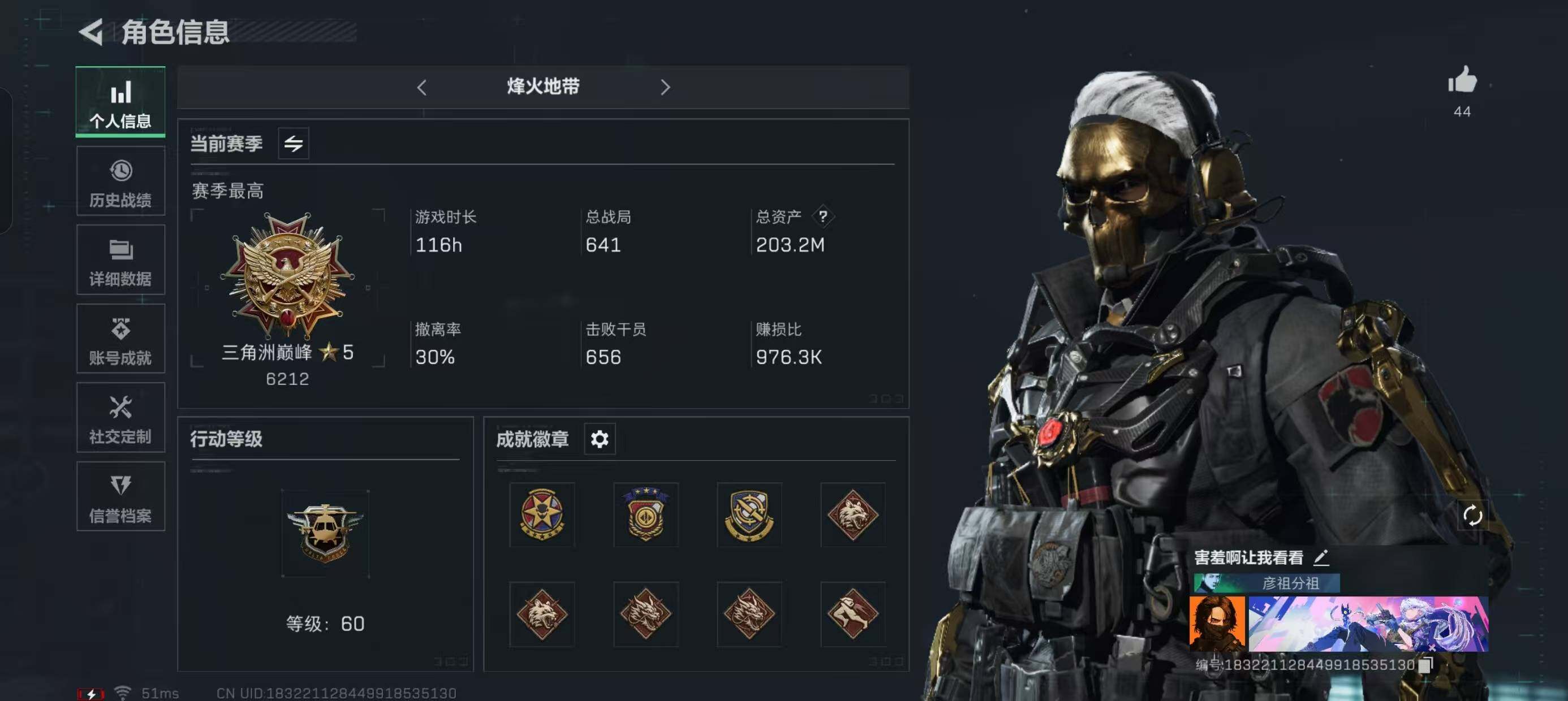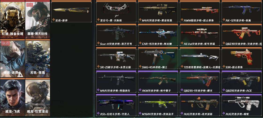 [11618791]总资产85M,哈夫币1019W,枪皮数量191,战场等级:8 无军衔,行动等级:60 三角洲巅峰,红狼-蚀金玫瑰/露娜-黑天际线/蜂医-送葬人无题密令/无名-夜鹰/威龙-飞虎/威龙-壮志凌云/蜂医-黑鹰坠落,近战-影锋