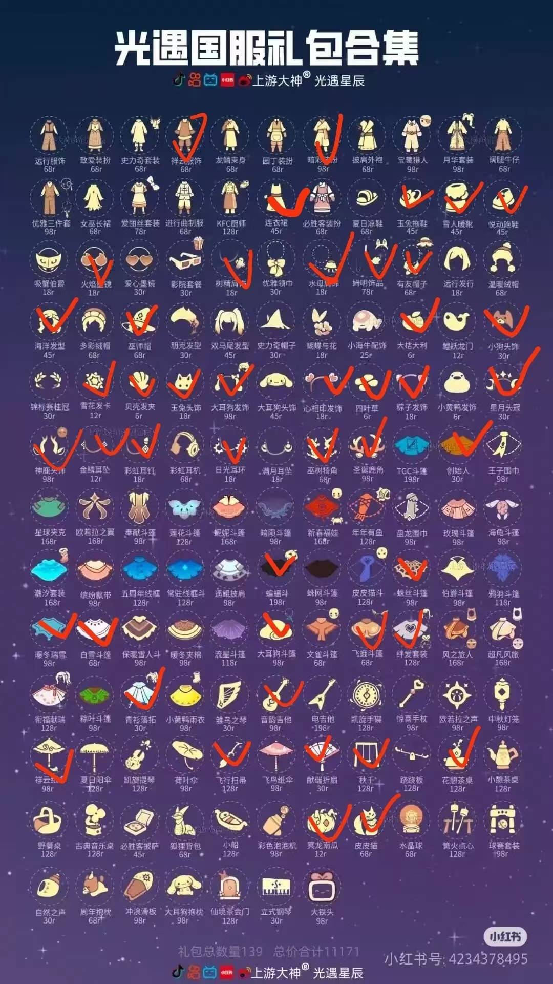 [11605674]【毕业图】雨林,霞谷 【毕业季】拾光季,归巢季,九色鹿,筑巢季,二重奏季,姆明季,彩染季,青鸟季 【蜡烛】51 【爱心】8 【稀有礼包】音韵吉他,瑞气服饰,彩虹武士裤,向日葵连衣裙,跃动跑鞋,圣诞雪人靴,吸蟹面具,粽子发饰,星月头冠,神鹿祝福头饰,金鳞耳饰,日光耳环,火焰眼镜,冥龙角,鹿角,树精肩饰,水母肩饰,姆明饰品套装,夏日有友礼包,海洋发型,巫师帽,大耳狗装扮,贝壳发饰,心心相印发饰礼包,雪花发夹,兔子发饰,大橘大利,小狗周年头饰,四叶草头饰,创始人斗篷,蝙蝠斗篷,透明蜘蛛斗,瑞雪斗篷,白雪斗篷,飞蛾斗篷,绊爱斗篷,青衫落拓礼包,瑞气纸伞,献瑞折扇礼包,情人秋千,花憩茶桌,冥龙南瓜,猫咪背饰 【毕业物品】棕熊面具,西部帽,粗框眼镜,季卡相机,五塑彩带斗,五塑彩羽发,飘带斗篷,柔缎花边连,飞天盘发,光之子试衣,设计师长袍,二重奏三角,蓝色燕尾斗篷,二重奏海报,姆明抱枕,姆明红伞,妮妮长裙,辉光羚羊面具,彩染围巾斗篷,青鸟面饰,青鸟斗篷 【热门复刻】绿芽,海洋斗,武士裤,正太头,猫耳发型,虚荣