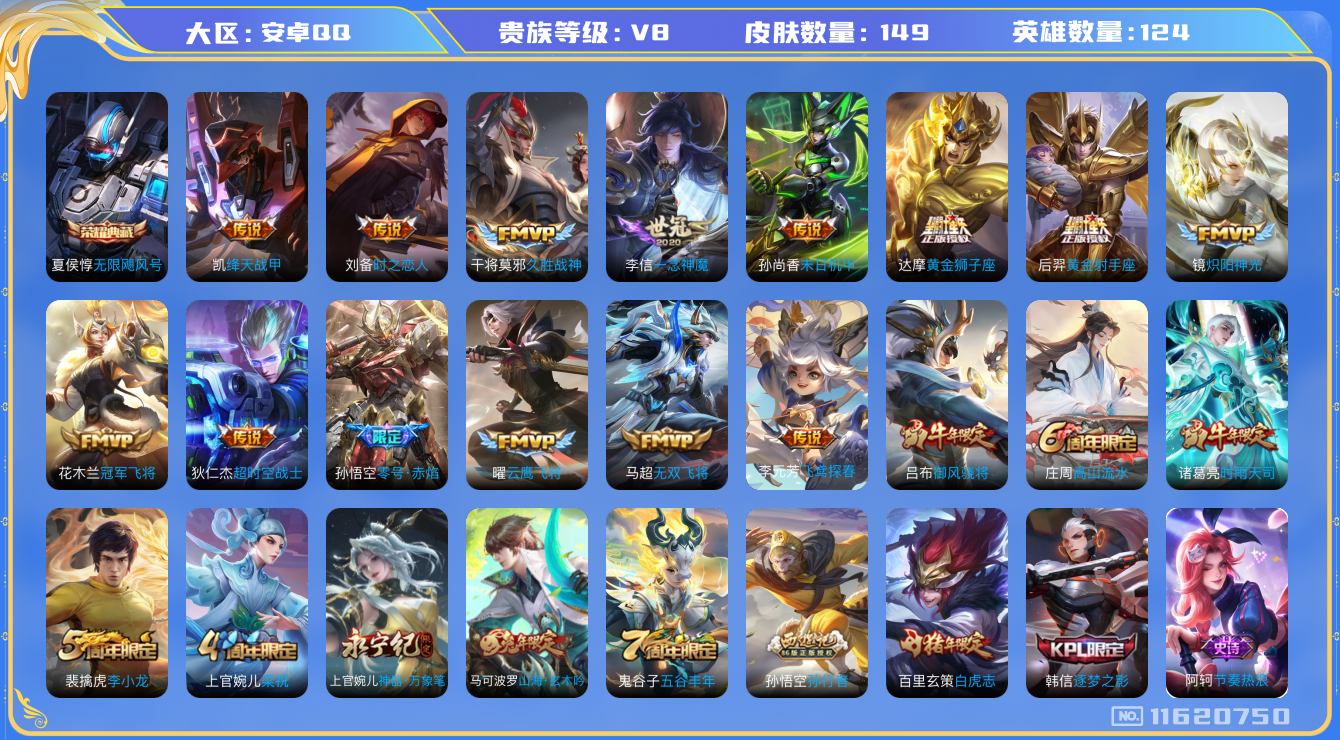 [11620750]V8 1典藏 17传说 124英雄 149皮肤 可修改实名 优质装备:无限飓风号(高达),黄金狮子座,黄金射手座,冠军飞将,云鹰飞将(小将军),绛天战甲(鸡嘴战神),久胜战神,炽阳神光,一念神魔,末日机甲-孙尚香(绿蚂蚱),零号·赤焰,飞鸢探春,时之恋人-刘备(电焊工),超时空战士-狄仁杰,无双飞将 珍宝阁皮:蔷薇恋人 限定皮:白虎志(电光耗子),时雨天司(水龙头),高山流水,五谷丰年,梁祝,御风骁将(吕布年限),李小龙,逐梦之影,孙行者,神器·万象笔,山海·玄木吟(马可年限) 史诗皮:星界战将,紫霞仙子,电玩小子(小书包),白龙吟,黄金分割率,特工魅影,千年之狐,蒙恬荣光圣徽,偶像歌手,电玩·爆裂旋风,猫狗日记-孙策,节奏热浪,修罗,女仆咖啡,摇滚巨星,水果甜心,天才门将,心灵骇客,功夫厨神,暗隐猎兽者,幽灵船长,鬼剑武藏,暗渊魔法,心灵战警,逐浪之夏,水晶猎龙者,曙光守护者,金属风暴,圣诞狂欢,圣诞恋歌,鹰眼统帅,无心