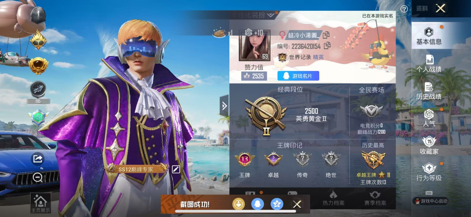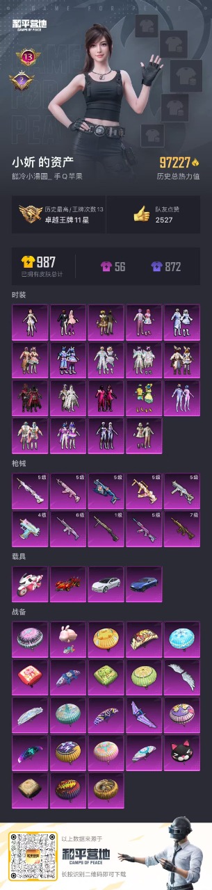 - PX_2103152-安卓微信 历史总热力值:53473 红装数量:1 粉装数量:9 特效枪数量:8 载具数量:1 王牌印记:9 历史最高段位:卓越王牌17星 套装数量:112 时装数量:389 枪械数量:155 战备数量:128 装备数量:220 载具:辉羽雀灵自行车 时装:辉羽雀灵-初翊(2级),套装-幻彩电音,套装-金丰海韵,时空协奏·心弦,角色-冷漠罗丽,角色-千金淑猫,角色-天鹅座 冰河