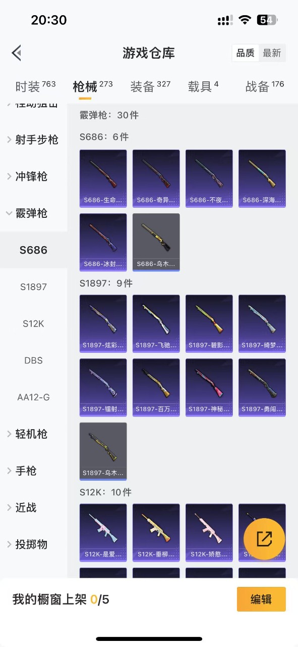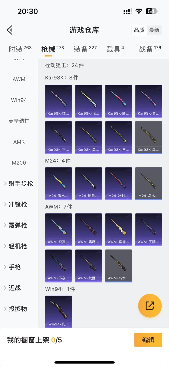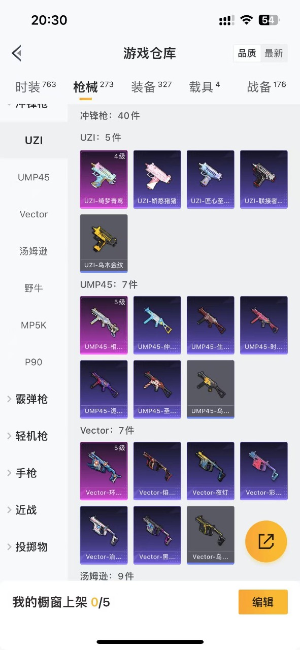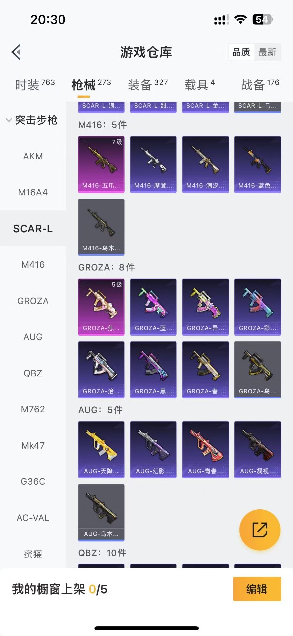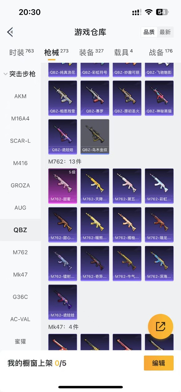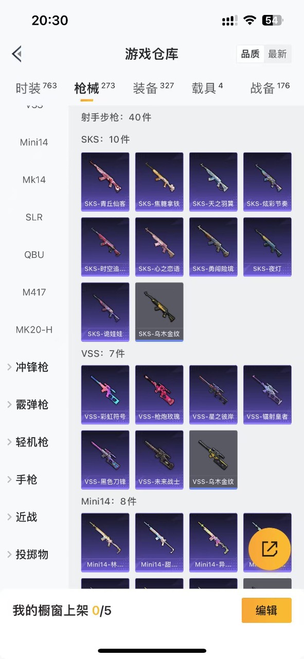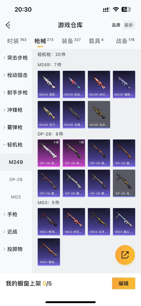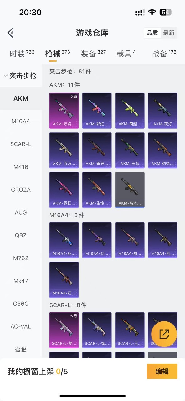AKM-炫紫旋律,SCAR-L-梦幻火箭,M416-五爪金龙,GROZA-焦糖拿铁,M762-甜蜜誓约,UZI-绮梦青鸾,UMP45-相思残雪,Vector-环太平洋,DP-28-圣堂之誓,DP-28-扶摇飞仙