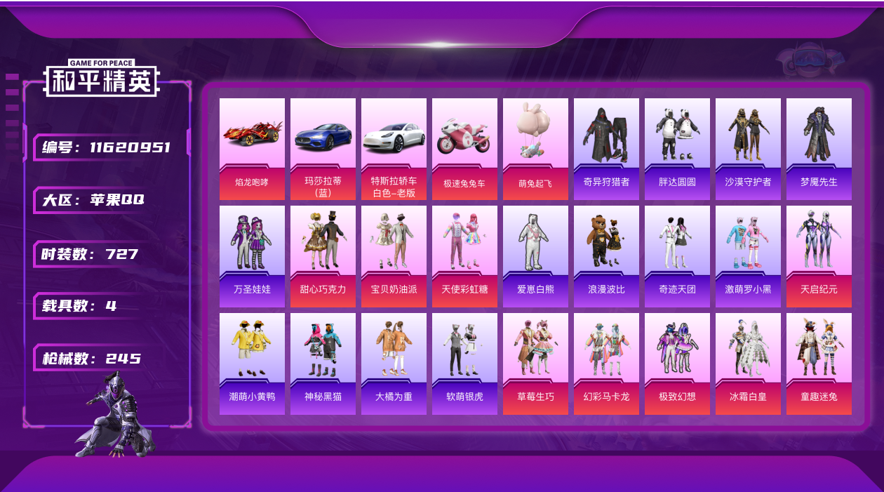 [11620951]19粉装 10特效枪 4载具 13印记 可二次 身法装备:暗影哥特(红眼罩),沙漠守护者 热门装扮:奇异狩猎者,梦幻火箭(新101)(新火箭少女101粉色套装),甜心巧克力,天使彩虹糖,宝贝奶油派,幻彩马卡龙,草莓生巧,童趣迷兔,天启纪元,香水柠檬,炙焰红王,冰霜白皇,极致幻想,蜜桃特工,蝶舞蔷薇,彩虹鹿灵,山涧鹿灵,绚丽摇曳,霁雪冰心,圣堂之誓,沙漠守护者,兔兔白日梦,神秘黑猫,软萌银虎,奇迹天团,胖达圆圆,激萌罗小黑,大橘为重,潮萌小黄鸭,万圣娃娃,梦魇先生,爱崽白熊,浪漫波比 载具:玛莎拉蒂Ghibli(蓝),特斯拉Model 3(珍珠白),焰龙咆哮,僚机-萌兔起飞,极速兔兔车 稀有枪皮:M416五爪金龙,SCAR-L梦幻火箭,M762甜蜜誓约,UZI绮梦青鸾,AKM炫紫旋律,UMP45相思残雪(UMP45-相思残雪),DP-28扶摇飞仙,GROZA焦糖拿铁,Vector环太平洋,DP-28圣堂之誓 七级特效枪:七级M416-五爪金龙 六级特效枪:六级SCAR-L-梦幻火箭 五级特效枪:五级AKM-炫紫旋律,五级M762-甜蜜誓约,五级UMP45-相思残雪,五级DP-28-圣堂之誓,五级GROZA-焦糖拿铁,五级Vector-环太平洋 四级特效枪:四级UZI-绮梦青鸾 一级特效枪:一级DP-28-扶摇飞仙 紫色装扮:玉兔迎春,暗影哥特(红眼罩),竞技名士,春日漫步,浪漫天命,SS24特训(SS24特训套装),惊鸿侠骨,SS25特训,锦衣飞扬,SS28特训,热情海星,SS29特训,纯真浪花,SS26特训,幻羽潜行,快闪甜心,春光漫游,焰鹰斗篷,SS27特训 优质战备:金风玉露降落伞,至尊龙雀飞行器,恐龙拽拽降落伞,超新星降落伞,垂柳戏鸭降落伞,绒雪飘舞降落伞,妙趣可丽降落伞,百万伏特降落伞,甜心宝贝降落伞,至尊龙雀降落伞,梦幻火箭降落伞,梦幻火箭飞行器,神秘黑猫降落伞,诡面斩降落伞,四圣焕新降落伞,心之恋语降落伞,童趣迷兔降落伞,王牌四分卫降落伞,绮梦青鸾降落伞,相思残雪降落伞,飞行器-相思残雪,绿意幻情降落伞