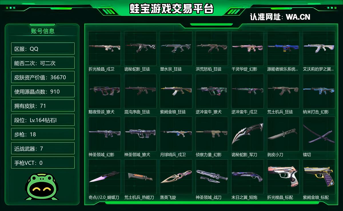 QQ 可二次 皮肤资产价值36670 使用源晶点数910 拥有皮肤71 段位Lv.164钻石I 步枪18 近战武器7 手枪VCT0 手枪11 狙击枪7 套装0 霰弹枪4 机枪3 冲锋枪5 英雄27 热门卡面4 热门挂饰5