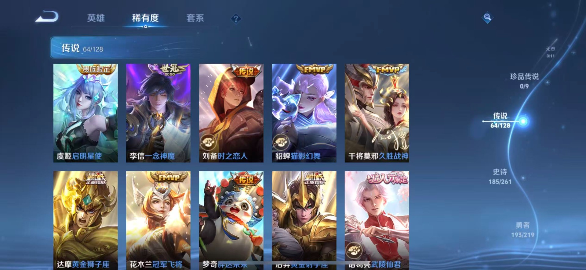 金蝉唐三藏,夏侯惇匿光决锋者,黄忠烈魂,盾山梦圆繁星,曹操天狼征服者,孙尚香异界灵契,露娜一生所爱,庄周云端筑梦师,杨玉环寅虎·心曲,裴擒虎李小龙,上官婉儿梁祝,上官婉儿神器·万象笔,马可波罗逐梦之星,猪八戒猪悟能,孙悟空孙行者,孙悟空大圣娶亲,芈月白晶晶,孙悟空至尊宝,孙悟空美猴王,雅典娜神奇女侠,韩信傲雪梅枪,韩信逐梦之影,百里守约朱雀志,墨子降魔,虞姬霸王别姬,王昭君星穹之声,橘右京枫霜尽,大乔白鹤梁神女,哪吒逐梦之翼,甄姬女儿国国王,甄姬至美·化雀舞,铠青龙志,廉颇寅虎·御盾,伽罗天狼溯光者,赵云百木心枪,赵云龙胆,孙膑天狼运算者,孙膑寅虎·展翼,典韦岱宗,鲁班七号乒乒小将,后羿无尽星芒,吕布御风骁将,后羿如梦令,公孙离玉兔公主,兰陵王影龙天霄,鲁班大师匿光启智者,李白诗剑行,西施至美·乘鲤谣,女娲补天,赵云引擎之心,妲己热情桑巴,关羽冰锋战神
