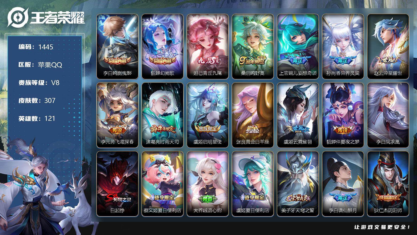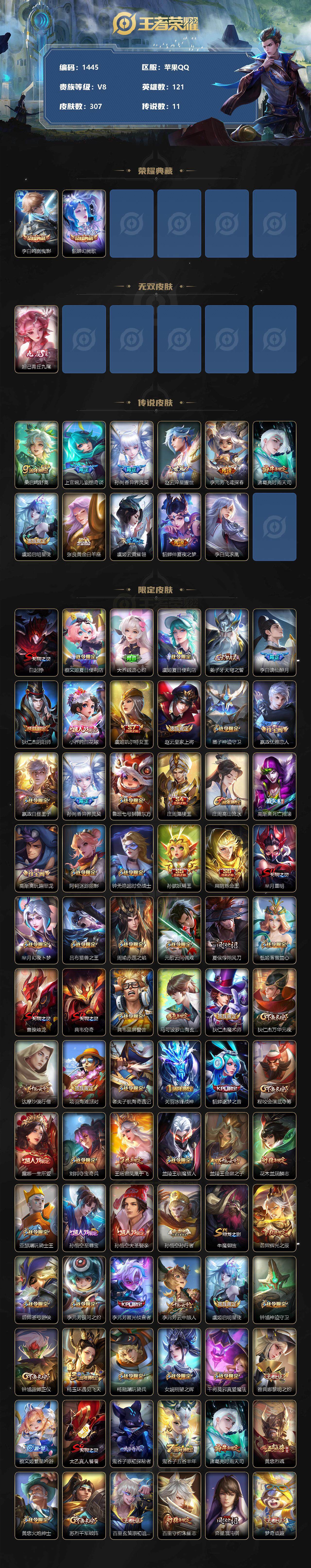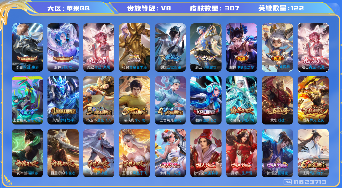 [11623713]【商品标题】:苹果Q-V0-永恒钻石II段位-121英雄-307皮肤-2典藏-0珍品无双-1无双-0珍品传说-11传说-97史诗