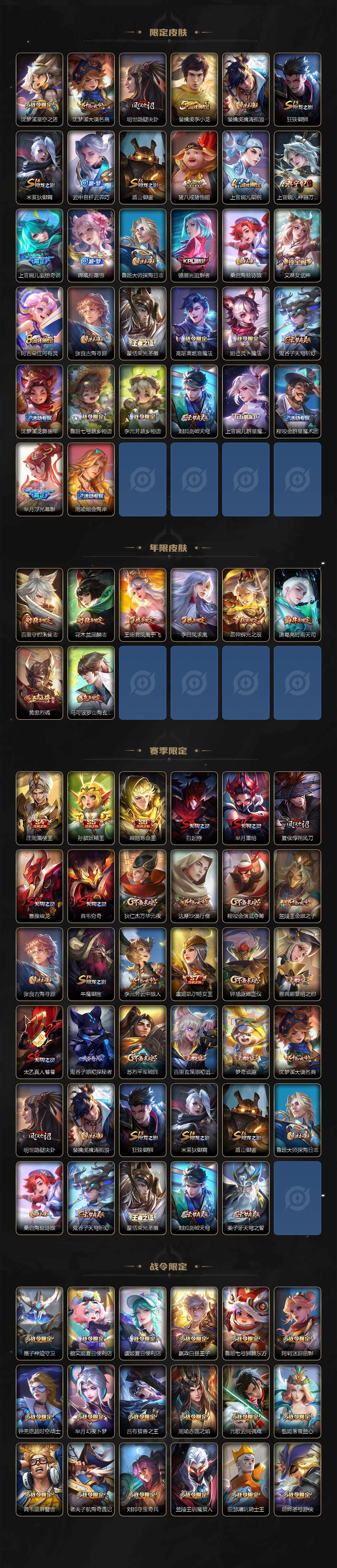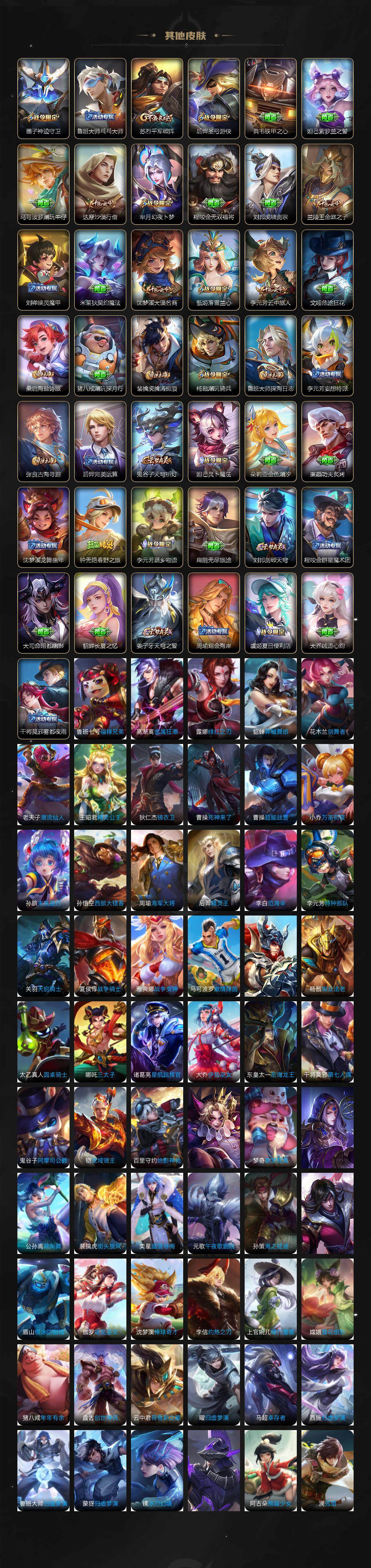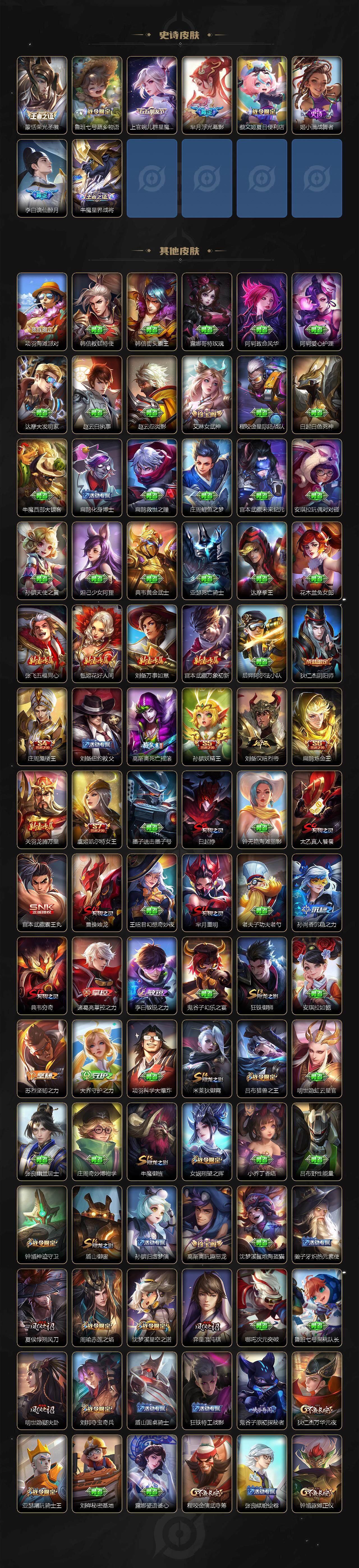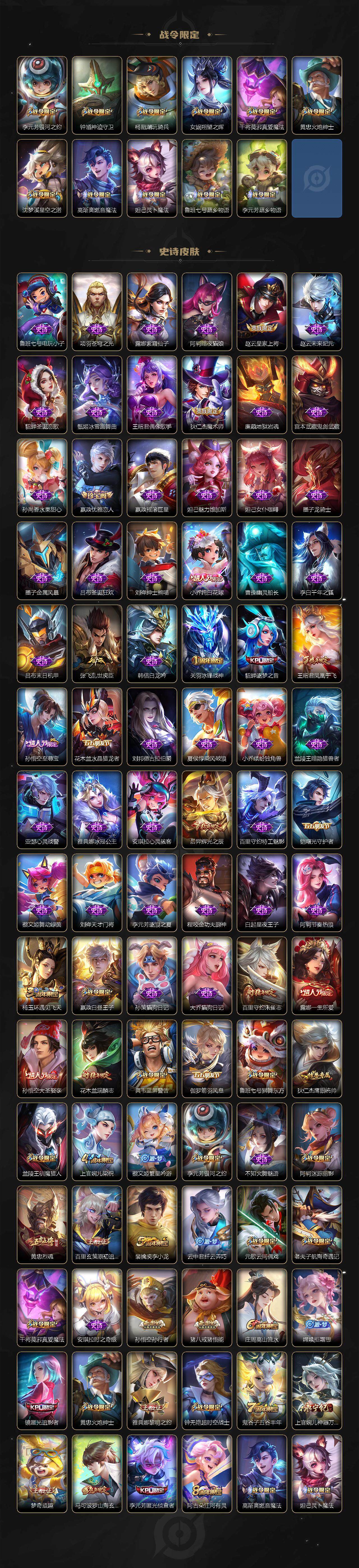 【限定皮肤】:白起狰,蔡文姬夏日便利店,大乔绒语心约,虞姬夏日便利店,姜子牙天穹之誓,李白谪仙醉月,狄仁杰阴阳师,小乔纯白花嫁,虞姬凯尔特女王,赵云皇家上将,墨子神迹守卫,嬴政优雅恋人,嬴政白昼王子,孙尚香异界灵契,鲁班七号狮舞东方,庄周蜃楼王,庄周高山流水,高渐离死亡摇滚,高渐离玩趣恶龙,阿轲迷踪丽影,钟无艳超时空战士,孙膑妖精王,扁鹊炼金王,芈月重明,芈月幻夜卜梦,吕布猎兽之王,周瑜赤莲之焰,元歌云间偶戏,夏侯惇朔风刀,甄姬落雪兰心,曹操烛龙,典韦穷奇,典韦蓝屏警告,马可波罗山海玄木吟,狄仁杰魔术师,狄仁杰万华元夜,达摩沙漠行僧,项羽海滩派对,老夫子航海奇遇记,关羽冰锋战神,貂蝉逐梦之音,程咬金演武夺筹,露娜一生所爱,刘邦夺宝奇兵,王昭君凤凰于飞,兰陵王驯魔猎人,兰陵王金庭之子,花木兰瑞麟志,亚瑟潮玩骑士王,孙悟空至尊宝,孙悟空大圣娶亲,孙悟空孙行者,牛魔御旌,后羿辉光之辰,后羿圣弓游侠,李元芳银河之约,李元芳匿光侦查者,李元芳云中旅人,虞姬启明星使,钟馗神迹守卫,钟馗驱傩正仪,杨玉环遇见飞天,杨戬潮玩骑兵,女娲朔望之晖,干将莫邪真爱魔法,雅典娜黎明之约,蔡文姬繁星吟游,太乙真人饕餮,鬼谷子原初探秘者,鬼谷子五谷丰年,诸葛亮时雨天司,黄忠烈魂,黄忠火炮绅士,苏烈千军破阵,百里玄策原初追逐者,百里守约朱雀志,弈星混沌棋,梦奇顽趣,沈梦溪星空之诺,沈梦溪大漠名商,明世隐疑决卦,裴擒虎李小龙,裴擒虎擒涛扼浪,狂铁御狮,米莱狄御霄,云中君纤云弄巧,盾山御銮,猪八戒猪悟能,上官婉儿梁祝,上官婉儿神器万象笔,上官婉儿妄想奇谈,嫦娥拒霜思,鲁班大师探海日志,镜匿光追影者,桑启海盐诗旅,艾琳女武神,阿古朵江河有灵,张良古海寻踪,蒙恬荣光圣徽,高渐离燃音魔法,妲己灵卜魔法,鬼谷子天穹祈灯,沈梦溪龙舞盛年,鲁班七号蔬乡物语,李元芳蔬乡物语,刘邦剑破天穹,上官婉儿群星魔术团,程咬金群星魔术团,芈月浮光幕影,周瑜熔