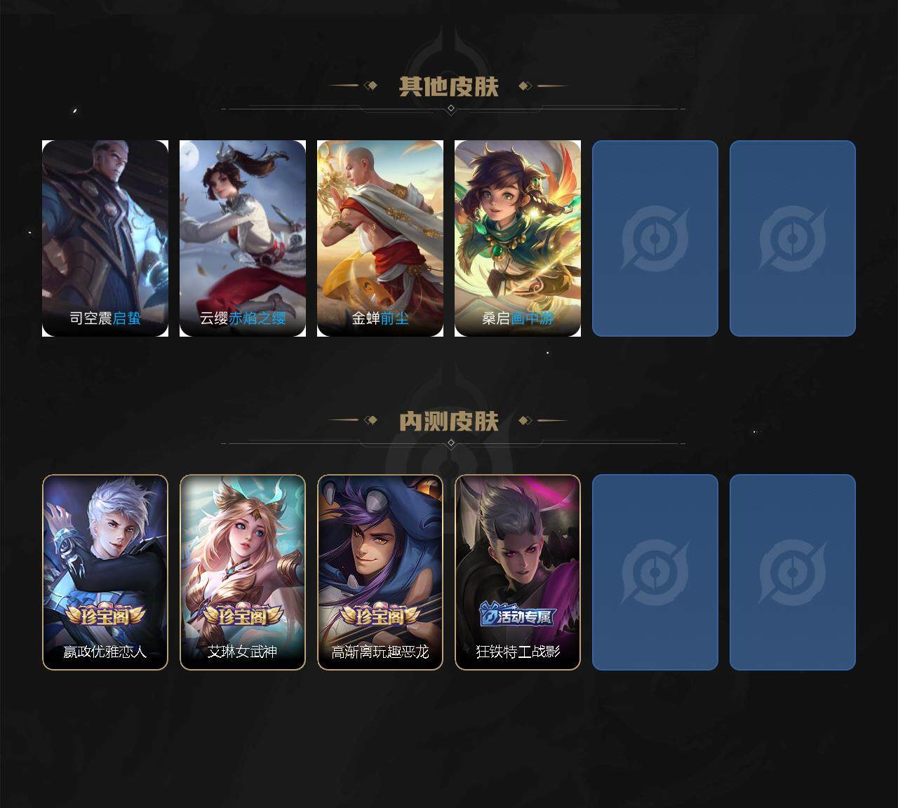 伽罗箭羽风息,李元芳逐浪之夏,不知火舞魅语,大乔猫狗日记,孙策猫狗日记,阿轲节奏热浪,露娜紫霞仙子,王昭君偶像歌手,韩信白龙吟,项羽苍穹之光,阿轲暗夜猫娘,雅典娜冰冠公主,吕布末日机甲,鲁班七号电玩小子,墨子龙骑士,嬴政摇滚巨星,刘禅绅士熊喵,刘禅天才门将,白起星夜王子,安琪拉心灵骇客,安琪拉时之奇旅,程咬金功夫厨神,刘邦德古拉伯爵,兰陵王暗隐猎兽者,曹操幽灵船长,宫本武藏鬼剑武藏,亚瑟心灵战警,蔡文姬舞动绿茵,廉颇地狱岩魂,小乔缤纷独角兽,夏侯惇乘风破浪,花木兰水晶猎龙者,铠曙光守护者,墨子金属风暴,百里玄策原初追逐者,吕布圣诞狂欢,貂蝉圣诞恋歌,百里守约特工魅影,嫦娥拒霜思,雅典娜黎明之约,李白千年之狐,李元芳匿光侦查者,高渐离燃音魔法,上官婉儿群星魔术团,李白谪仙醉月