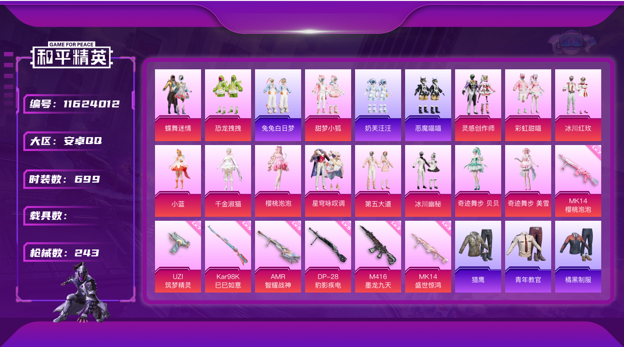 [11624012]14粉装 7特效枪 14印记 可二次 可修改实名 优质装备:蝶舞迷情,UZI筑梦精灵,七级UZI-筑梦精灵,M416墨龙九天,千金淑猫,MK14-盛世惊鸿,樱桃泡泡,MK14-樱桃泡泡,七级MK14-樱桃泡泡,AMR-智耀战神,星穹咏叹调,奇迹舞步-贝贝,奇迹舞步-美雪,Kar98K-巳巳如意 热门装扮:恐龙拽拽,甜梦小狐,灵感创作师,彩虹甜喵,冰川红玫,冰川幽秘,第五大道,小蓝,兔兔白日梦,奶芙汪汪,恶魔喵喵 稀有枪皮:DP-28-豹影疾电 五级特效枪:五级Kar98K-巳巳如意,五级DP-28-豹影疾电,五级AMR-智耀战神 三级特效枪:三级M416-墨龙九天,三级MK14-盛世惊鸿 紫色装扮:田园牧歌,轻风白浪,和煦暖阳,SS22特训,白啸长虹,SS23特训,幻彩翩翩,妙红点点,龙舌兰冰茶,白兰地假日,娇憨猪猪,梦幻奶油,萌趣咩咩,SS21特训,极光玫瑰,SS31特训套装,人气偶像,冰川特警,冷焰舞者,霓虹热舞,旭日情侣,SS30特训套装,云朵鹅,雪绒豹,SS33特训套装,青涩时光,顶瓜瓜,SS20特训,SS16特训,猎梦纪元,飞驰魅影,音速流光,SS19特训,军刀雅典娜,豚鼠丹丹,吉莉礼服,甜心亚梦,虚音幻奏,电音精灵,SS17特训,SS18特训,水晶王族,智慧隐士,都市魅力,酒红色名流,酷潮明星,长空猛禽,霓虹街区,青年教官,缤纷果语,耀眼新星,荣耀,荧惑魅影,蓝彩潮人,蓝色运动,虎虎生威吉莉,街头潮人,蓝海鲸歌,飞行日记,魅力单车,鹤鸣,麻辣教官,黄色伏地魔,黄色名流,黄色运动,黑色伏地魔,龟仙人,冰河战士,龙魂突击队,蝶变,香桃花海,极速红龙,柠萌假日,橘黑制服,海岛探路者,涂山之恋,深蓝色名流,滨海假日,幻影武者,完美偶像,帅气教官,幻世战舞者,怒火燎原,战地督导,探宝勇士,湖蓝色名流,滨海厨神,绮丽涂鸦,疯狂小兔子,白熊同盟,白色伏地魔,破晓战魂,破蛋小黄鸡,福星高照,空岛之星,竞技达人朋克,红色运动,王牌教练,牛气冲天,灼焰舞者,炫蓝之夏,热血青春,牛气满满,猛禽,猎鹰,小熊娃娃,雏菊兔兔,萝兰蝴蝶,SS29特训,星途旅人,创世·幻影,白光莹,纯真浪花,热情海星,曼妙人鱼,SS28特训,卖崽青蛙,迎夏光舞,红潮炫舞,异域银装,鱼渊荷华,玉兔迎春,燕燕于飞,巳巳如意,青团波波,糖糖葫芦,棉花软糖,竞技名士,街头风暴,许七安,裁决天象,深海梦境,惊