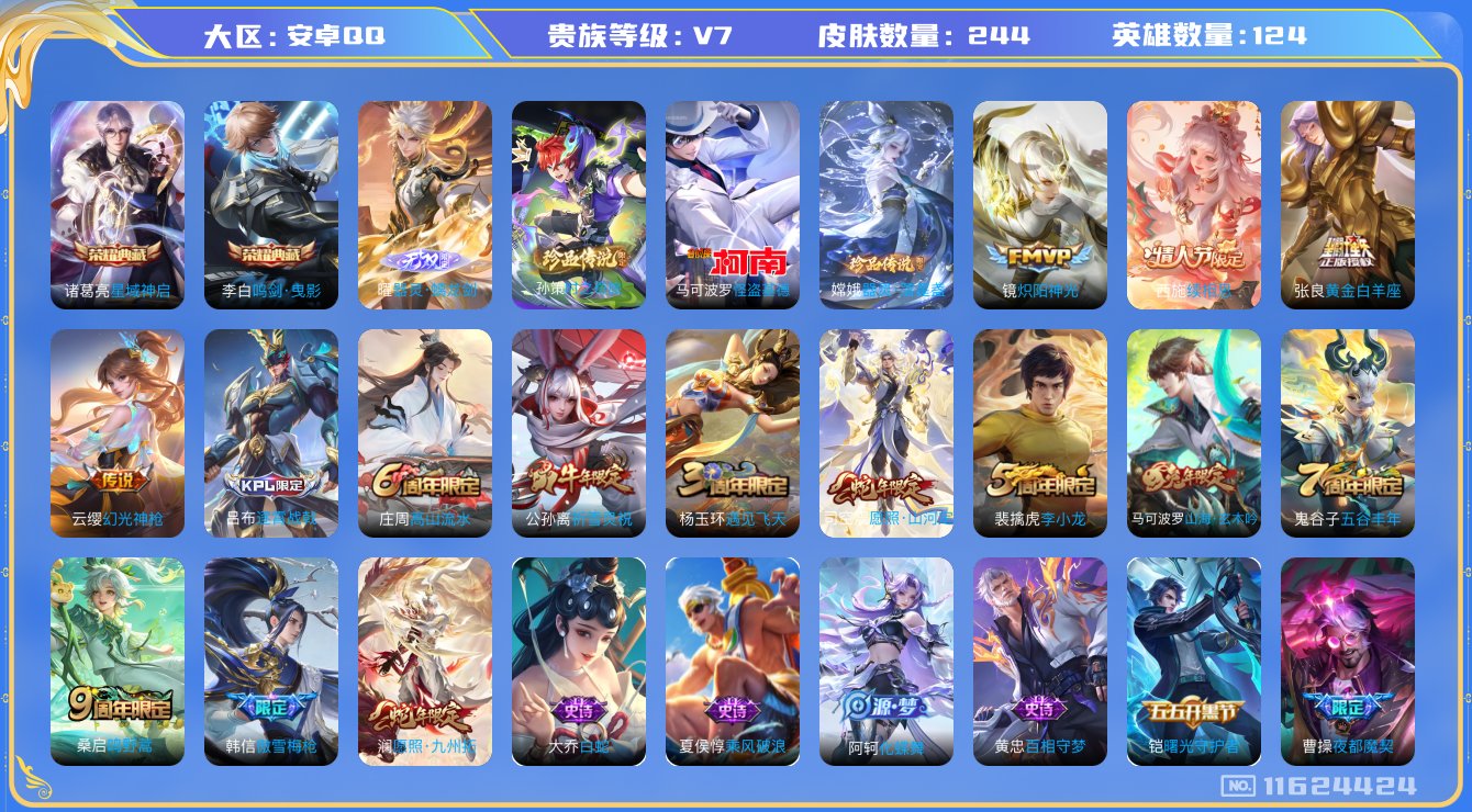 [11624424]V7 2典藏 1无双 3珍品传说 8传说 124英雄 244皮肤 可修改实名 优质装备:鸣剑·曳影,星域神启(倪克斯贼亮),器灵·螭龙剑,怪盗基德,器灵·落星盏,黄金白羊座,炽阳神光 珍品传说:时之奇旅-孙策 传说皮:续相思,幻光神枪 珍宝阁皮:胡桃夹子,万物之道,蔷薇恋人 限定皮:愿照·九州拓(澜年限),愿照·山河定(司空震年限),逐霄战戟,鸣野蒿,傲雪梅枪,遇见飞天,高山流水,五谷丰年,祈雪灵祝(雪兔子),李小龙,山海·玄木吟(马可年限) 史诗皮:鸭鸭历险记-刘禅,器灵·浮梦炉,糖绘人间,瑰影绮梦,化蝶舞,星界战将,龙之律动,百相守梦-周瑜,茶境仙,破空之剑,东方月初,蒙犽顽岩魄,埋骨钱,曹操夜都魔契,百相守梦-百里守约,百相守梦-黄忠,织梦人,紫霞仙子,特工魅影,千年之狐,永昼,江河有灵,魅语,蒙恬荣光圣徽,无限星赏官,白蛇,电玩·爆裂旋风,猫狗日记-孙策,时之恋人-孙尚香,摇滚巨星,水果甜心,天才门将,星夜王子,心灵骇客,功夫厨神,鬼剑武藏,心灵战警,舞动绿茵,地狱岩魂,纤云弄巧,拒霜思,乘风破浪,逐浪之夏,曙光守护者,金属风暴,圣诞恋歌,鹰眼统帅,暗夜贵公子,魅力维加斯,赏金猎手,无心,未来纪元-赵云,玫瑰异探