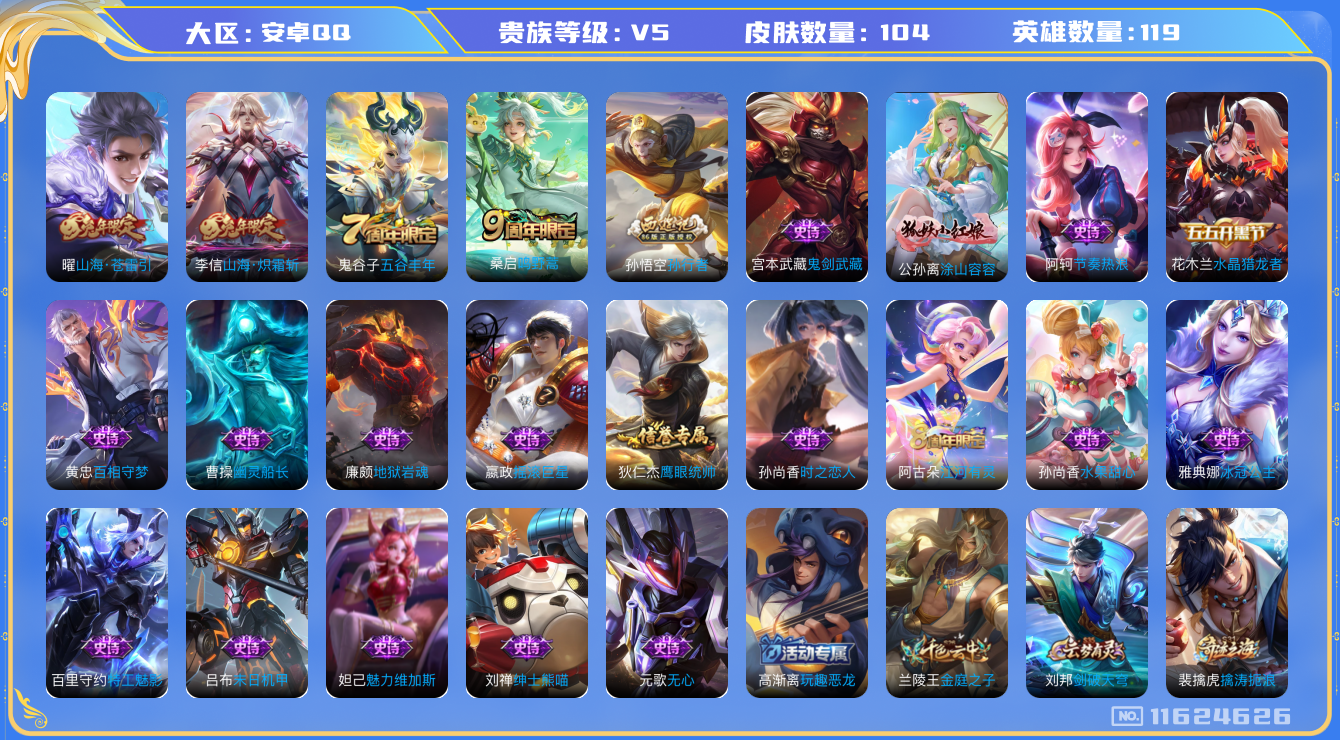 [11624626]V5 3传说 119英雄 104皮肤 可修改实名 优质装备:山海·炽霜斩(李信年限),山海·苍雷引(电光曜子),涂山容容 珍宝阁皮:玩趣恶龙 限定皮:鸣野蒿,五谷丰年,孙行者 史诗皮:百相守梦-黄忠,特工魅影,江河有灵,冰冠公主,末日机甲-吕布,时之恋人-孙尚香,节奏热浪,摇滚巨星,水果甜心,绅士熊喵,幽灵船长,鬼剑武藏,地狱岩魂,水晶猎龙者,鹰眼统帅,魅力维加斯,无心