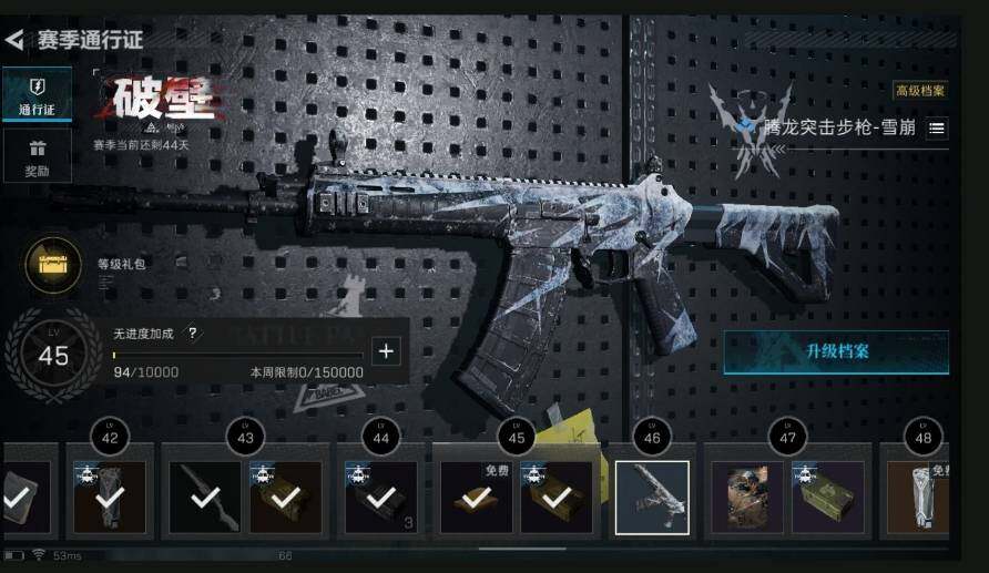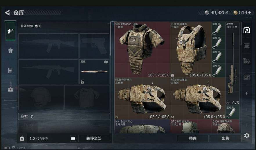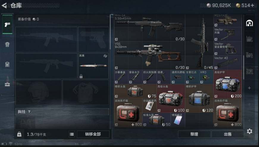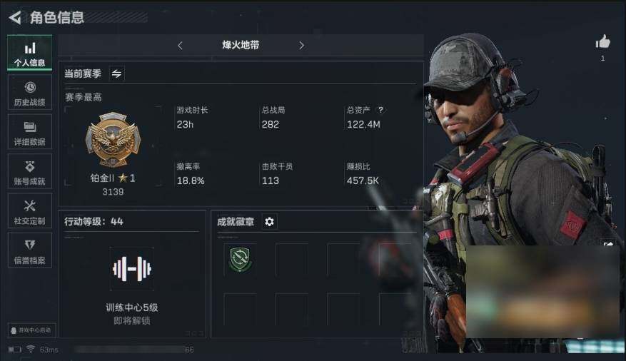 [11624660]总资产122M,哈夫币9062w,枪皮数量39,战场等级:1 无军衔,行动等级:44 铂金,近战-黑鹰-s65