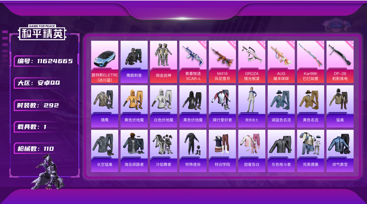 [11624665]1粉装 6特效枪 1载具 3印记 可二次 可修改实名 身法装备:暗影哥特(红眼罩),萌熊伴侣背包(粉熊背包) 优质装备:路特斯ELETRE(冰川蓝),萌熊伴侣背包(粉熊背包),绚金战神,M416风花雪月,SCAR-L青春物语,GROZA-镜光银凌,AUG-暖羊咩咩,Kar98K-巳巳如意 热门装扮:鹰眼刺客 稀有枪皮:DP-28-豹影疾电 六级特效枪:六级SCAR-L-青春物语 五级特效枪:五级GROZA-镜光银凌,五级Kar98K-巳巳如意,五级AUG-暖羊咩咩,五级M416-风花雪月 四级特效枪:四级DP-28-豹影疾电 紫色装扮:娇憨猪猪,萌趣咩咩,SS21特训,SS31特训套装,冷焰舞者,SS30特训套装,SS33特训套装,SS20特训,时空追击者,暴风机械师,银白舞王,SS14特训,怪笑疯兔,萌趣颜团子,特种颜团子,SS19特训,甜心亚梦,虚音幻奏,电音精灵,SS17特训,SS18特训,长空猛禽,缤纷果语,街头潮人,骑行爱好者,魅力单车,鹤鸣,黄色伏地魔,黄色名流,黑色伏地魔,沙漠兵团,海岛探路者,幻影武者,夏日音浪,完美偶像,帅气教官,幻世战舞者,探宝勇士,湖蓝色名流,绮丽涂鸦,疯狂小兔子,白色伏地魔,破晓战魂,甜蜜告白,牛气冲天,灰色格斗者,炫蓝之夏,猛禽,特殊使命,特训学院,猎鹰,镭射皇者,鱼渊荷华,玉兔迎春,燕燕于飞,巳巳如意,竞技名士,暗影哥特(红眼罩),裁决冥王,大橘大利,SS12特训,蓝冰羽,紫幽梦,SS32特训服(SS32特训套装),猎影月神,青玉碎影,萌黄之夏,恋语绒绒,金耀舞者,蓝调潮人 优质战备:星途旅人降落伞,鬼刀降落伞,阿狸红降落伞
