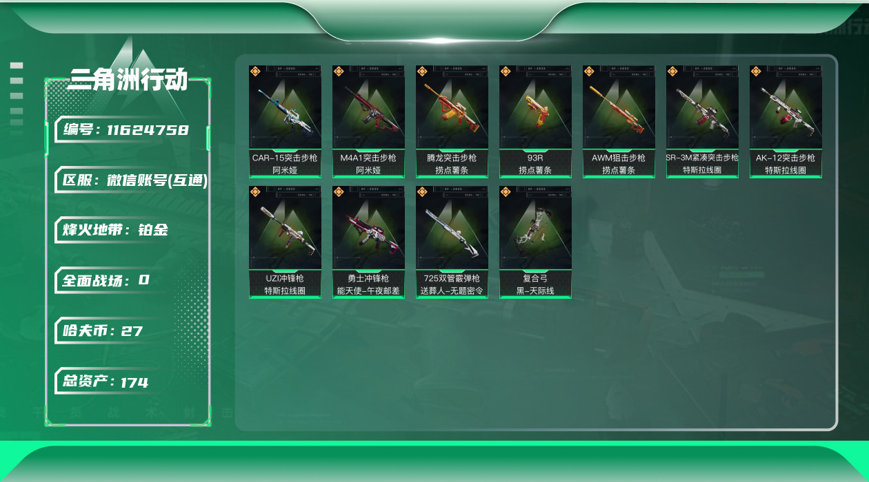 [11624758]总资产:174.6M 11传说枪械 哈夫币:27.156K 顶级安全箱(3×3)9.15号到期 可二次 可修改实名 优质装备:顶级安全箱(3x3) 烽火地带段位:铂金 全面战场段位:列兵 传说武器皮肤:M4A1突击步枪-阿米娅,CAR-15突击步枪-阿米娅,复合弓-黑-天际线,AWM狙击步枪-捞点薯条,腾龙突击步枪-捞点薯条,93R-捞点薯条,AK-12突击步枪-特斯拉线圈,SR-3M紧凑突击步枪-特斯拉线圈,UZI冲锋枪-特斯拉线圈,勇士冲锋枪-能天使-午夜邮差,725双管霰弹枪-送葬人-无题密令